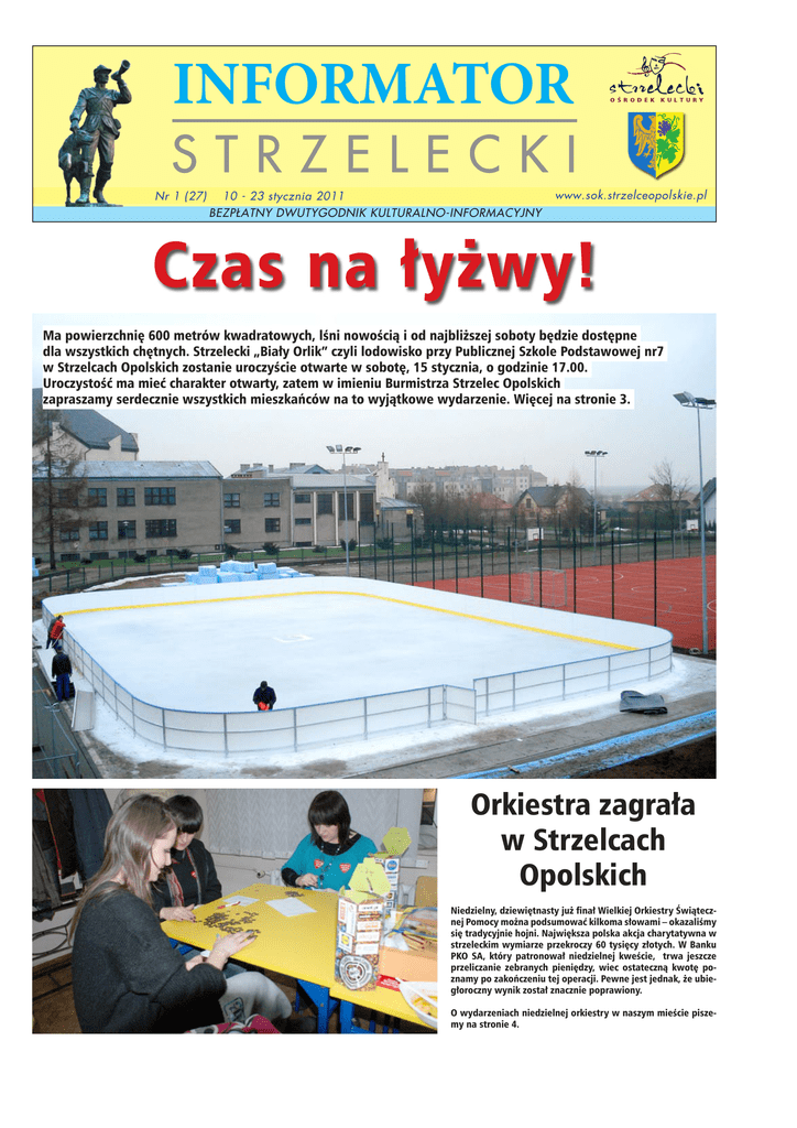 INFORMATOR Strzelecki Nr 1 (27) 10 - 23 stycznia 2011 BEZPŁATNY DWUTYGODNIK KULTURALNO-INFORMACYJNY www.sok.strzelceopolskie.pl Czas na łyżwy! Ma powierzchnię 600 metrów kwadratowych, lśni nowością i od najbliższej soboty będzie dostępne dla wszystkich chętnych. Strzelecki „Biały Orlik” czyli lodowisko przy Publicznej Szkole Podstawowej nr7 w Strzelcach Opolskich zostanie uroczyście otwarte w sobotę, 15 stycznia, o godzinie 17.00. Uroczystość ma mieć charakter otwarty, zatem w imieniu Burmistrza Strzelec Opolskich zapraszamy serdecznie wszystkich mieszkańców na to wyjątkowe wydarzenie. Więcej na stronie 3. Orkiestra zagrała w Strzelcach Opolskich Niedzielny, dziewiętnasty już finał Wielkiej Orkiestry Świątecznej Pomocy można podsumować kilkoma słowami – okazaliśmy się tradycyjnie hojni. Największa polska akcja charytatywna w strzeleckim wymiarze przekroczy 60 tysięcy złotych. W Banku PKO SA, który patronował niedzielnej kweście, trwa jeszcze przeliczanie zebranych pieniędzy, wiec ostateczną kwotę poznamy po zakończeniu tej operacji. Pewne jest jednak, że ubiegłoroczny wynik został znacznie poprawiony. O wydarzeniach niedzielnej orkiestry w naszym mieście piszemy na stronie 4. Czy grożą nam podtopienia? Utrzymująca się od kilku już dni wysoka temperatura skutecznie przegania wszelkie oznaki zimy. Nienaturalne jak na tę porę roku dodatnie temperatury w wielu miejscach w Polsce spowodowały szybkie topnienie pokrywy śnieżnej i wzrost poziomu wód w rzekach. Topi się również pokrywa lodowa na ciekach wodnych, co może stanowić zagrożenie powodzią w najbardziej narażonych miejscach. Czy w naszej gminie mogą wystąpić takie zjawiska? - Cały czas monitorujemy sytuację na naszych rzekach, i jak na razie nie stwierdzamy takiego zagrożenia – odpowiada Jan Bogusz, szef Referatu Zarządzania Kryzysowego strzeleckiego Urzędu Miejskiego. – Wprawdzie dodatnie temperatury w dzień powodują szybsze topnienie śniegu i lodu, ale nocne przymrozki ograniczają negatywny wpływ tego zjawiska na poziom wód w naszych rzekach. Pojawiły się w minionym tygodniu obawy mieszkańców w jednej z miejscowości w naszej gminie, ale okazały się one bezpodstawne. Nie odnotowaliśmy takich wystąpień wody z koryt rzek, aby stanowiły one zagrożenie dla mieszkańców i ich mienia. Prognozy pogody także nie sugerują wybitnie niekorzystnych zjawisk związanych z dodatnimi temperaturami. Gdyby pojawiły się jakiekolwiek obawy związane z podniesieniem się poziomu wód, należy skontaktować się z naszym referatem – tel. 77 461 2923 lub z Komendą Powiatową Państwowej Straży Pożarnej w Strzelcach Opolskich. wk Jubileuszowy turniej piłki ręcznej W najbliższy weekend, 15 i 16 stycznia, w Strzelcach Opolskich i Zawadzkiem odbędzie się turniej piłki ręcznej o Puchar Marszałka Województwa Opolskiego. Organizowany przez burmistrzów obu miast oraz samorządowe instytucje sportowe Strzelec Opolskich i Zawadzkiego, w tym roku odbędzie się po raz dziesiąty. Od dekady jest to najważniejszy turniej piłki ręcznej w Polsce odbywający się w czasie przerwy w rozgrywkach ligowych spowodowanej zajęciami kadry narodowej. W turnieju wystąpi osiem zespołów, w tym najlepszy polski klub, aktualny mistrz kraju – Vive Kielce. Stanowiący kuźnię kadrowiczów kielecki zespół przyjedzie w mocno okrojonym składzie, w którym na pewno zobaczymy takich zawodników jak Mateusz Jachlewski, srebrny medalista Mistrzostw Świata z roku 2007 czy Daniel Żółtak, zdobywca brązowego medalu Mistrzostw Świata w roku 2009. Oprócz kieleckiego zespołu w turnieju wystąpią drużyny: Gwardia Opole, MKS Ciechanów, Stal Mielec, Sokół Prerov, Aspr Zawadzkie, Olimpia Piekary i TJ Tartan Litovel. Sobotnie eliminacje rozgrywane będą w halach sportowych w Zawadzkiem i Strzelcach Opolskich (ul. Kozielska), natomiast w tym roku niedzielne finały rozgrywane będą w hali MOKSiR w Zawadzkiem. W imieniu organizatorów zapraszamy do kibicowania naszym szczypiornistom, szczegółowy plan turnieju znajdą Państwo na plakatach. Dla kibiców będzie to okazja do swoistego treningu przez zbliżającymi się Mistrzostwami Świata w Szwecji, gdzie nasi kadrowicze mają spore ambicje medalowe. w Burmistrz Strzelec Opolskich informuje, że na tablicy ogłoszeń Urzędu Miejskiego wywieszone zostało obwieszczenie o wszczęciu postępowania w sprawie wydania decyzji o środowiskowych uwarunkowaniach zgody na realizację przedsięwzięcia polegającego na rozbudowie drogi wojewódzkiej nr 409 relacji Gogolin – Strzelce Opolskie na odcinku od miasta Gogolin do wsi Rożniątów od km 25+199,00 do km 39+277,00 na terenie powiatów: krapkowickiego i strzeleckiego. Obwieszczenie jest także dostępne na stronie internetowej: http://www.strzelceopolskie.pl/bip/ Informator Strzelecki Bezpłatny dwutygodnik kulturalno-informacyjny Wydawca: Strzelecki Ośrodek Kultury Strzelce Opolskie, Plac Żeromskiego 7, tel: 77 463 00 50 www.sok.strzelceopolskie.pl [email protected] Druk: Drukarnia ProMedia Opole Dwutygodnik powstaje przy współpracy z Referatem Inicjatyw Gospodarczych i Promocji Urzędu Miejskiego w Strzelcach Opolskich REJ. PR. 596-1/10 Wydawca i redakcja nie ponoszą odpowiedzialności za treść nadesłanych materiałów wyborczych, reklamowych i ogłoszeń Basen rośnie w oczach Na budowie jednej z większych w ostatnich latach inwestycji gminnych, czyli strzeleckiego Centrum rekreacji Widnej i Sportu widać wyraźnie postęp prac. Wykonawca zakończył w terminie kolejny etap budowy, czyli wykonanie fundamentów pod budynek i korzystając ze sprzyjającej aury realizuje kolejne etapy. - Zima, wbrew pierwotnym obawom, nie pokrzyżowała nam szyków – powiedział nam Jarosław Łoś z firmy Adamietz, głównego wykonawcy inwestycji. – Zakończyliśmy etap stawiania fundamentów pod budynek przyszłej pływalni, a teraz rozpoczynamy stawianie konstrukcj