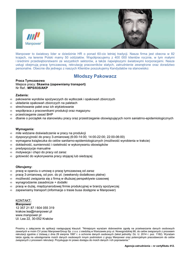 Manpower to światowy lider w dziedzinie HR o ponad 60-cio letniej tradycji. Nasza firma jest obecna w 82 krajach, na terenie Polski mamy 50 oddziałów. Współpracujemy z 400 000 klientów rocznie, w tym małymi i średnimi przedsiębiorstwami ze wszystkich sektorów, a takŜe największymi światowymi korporacjami. Nasze usługi obejmują pracę tymczasową, rekrutację pracowników stałych, zatrudnienie zewnętrzne oraz doradztwo personalne. Obecnie dla jednego z naszych Klientów poszukujemy Kandydatów na stanowisko: Młodszy Pakowacz Praca Tymczasowa Miejsce pracy: Skawina (zapewniamy transport) Nr Ref.: MPS/035/AKP • • • • • • Zadania: pakowanie wyrobów spoŜywczych do wytłoczek i opakowań zbiorczych układanie opakowań zbiorczych na paletach strechowanie palet oraz ich etykietowanie współpraca z pracownikami produkcji oraz magazynu przestrzeganie zasad BHP dbanie o porządek na stanowisku pracy oraz przestrzeganie obowiązujących norm saniatrno-epidemiologicznych • • • • • • • Wymagania: mile widziane doświadczenie w pracy na produkcji dyspozycyjność do pracy 3-zmianowej (6:00-14:00; 14:00-22:00; 22:00-06:00) wymagana ksiąŜeczka do celów sanitarno-epidemiologicznych (moŜliwość wyrobienia w trakcie) dokładność, sumienność i rzetelność w wykonywaniu obowiązków predyspozycje manualne motywacja i chęci do pracy od zaraz gotowość do wykonywania pracy stojącej lub siedzącej • • • • • • Oferujemy: pracę w oparciu o umowę o pracę tymczasową od zaraz pracę 3-zmianową, od pon. do pt. (weekendy dodatkowo płatne) moŜliwość związania się z firmą w dłuŜszej perspektywie czasowej wynagrodzenie zasadnicze + dodatki pracę w duŜej, międzynarodowej firmie produkcyjnej w branŜy spoŜywczej zapewniamy transport (informacje o trasie busa dostępne w Manpower) KONTAKT: Manpower 12 357 21 87 / 604 055 319 [email protected] www.manpower.pl Ul. Lea 22, 30-052 Kraków Prosimy o załączenie do aplikacji następującej klauzuli: "Niniejszym wyraŜam dobrowolnie zgodę na przetwarzanie danych osobowych zawartych w moim CV przez ManpowerGroup Sp. z o.o. z siedzibą w Warszawie przy ul. Nowogrodzkiej 68, do celów związanych z procesem rekrutacji zgodnie z Ustawą z dnia 29 sierpnia 1997 r. o ochronie danych osobowych (tekst jednolity: Dz. U. 2014 r. poz. 1182). WyraŜam takŜe zgodę na udostępnianie moich danych osobowych innym podmiotom z grupy Manpower oraz potencjalnym pracodawcom do celów związanych z procesem rekrutacji. Przysługuje mi prawo dostępu do moich danych i ich poprawiania." Agencja zatrudnienia – nr certyfikatu 412.