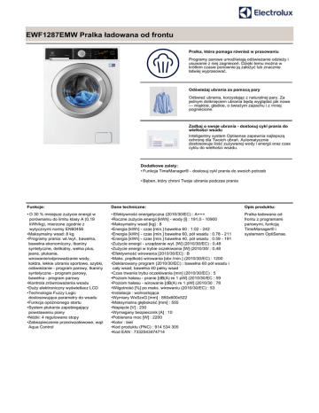 EWF1287EMW Pralka ładowana od frontu Pralka, która pomaga również w prasowaniu Programy parowe umożliwiają odświeżanie odzieży i usuwanie z niej zagnieceń. Dzięki temu można w krótkim czasie ponownie ją założyć lub znacznie łatwiej wyprasować. Odświeżaj ubrania za pomocą pary Odśwież ubrania, korzystając z naturalnej pary. Za jednym dotknięciem ubrania będą wyglądać jak nowe — miękkie, gładkie, o świeżym zapachu i z mniej pogniecione. Zadbaj o swoje ubrania - dostosuj cykl prania do wielkości wsadu Inteligentny system Optisense zapewnia najlepszą ochronę dla Twoich ubrań. Automatycznie dostosowuje ilość zużywanej wody i energii oraz czas cyklu do wielkości wsadu. Dodatkowe zalety: • Funkcja TimeManager® - dostosuj cykl prania do swoich potrzeb • Bęben, który chroni Twoje ubrania podczas prania Funkcje: Dane techniczne: Opis produktu: • O 30 % mniejsze zużycie energii w porównaniu do limitu klasy A (0,19 kWh/kg), mierzone zgodnie z wytycznymi normy EN60456 •Maksymalny wsad: 8 kg •Programy prania: wł./wył., bawełna, bawełna ekonomiczny, tkaniny syntetyczne, delikatny, wełna plus, jeans, płukanie, wirowanie/odprowadzanie wody, kołdra, lekkie ubrania sportowe, szybki, odświeżanie - program parowy, tkaniny syntetyczne - program parowy, bawełna - program parowy •Kontrola zrównoważenia wsadu •Duży elektroniczny wyświetlacz LCD •Technologia Fuzzy Logic dostosowująca parametry do wsadu •Funkcja opóźnionego startu •System płukania zapobiegający powstawaniu piany •Nóżki: 4 regulowane stopy •Zabezpieczenie przeciwzalewowe, wąż Aqua Control • Efektywność energetyczna (2010/30/EC) : A+++ •Roczne zużycie energii [kWh] - wody [l] : 191,0 - 10900 •Maksymalny wsad [kg] : 8 •Energia [kWh] - czas [min.] bawełna 60 : 1.02 - 242 •Energia [kWh] - czas [min.] bawełna 60, pół wsadu : 0.78 - 211 •Energia [kWh] - czas [min.] bawełna 40, pół wsadu : 0.59 - 191 •Zużycie energii - urządzenie wył. [W] (2010/30/EC) : 0,48 •Zużycie energii w trybie oczekiwania [W] (2010/30/ : 0,48 •Efektywność wirowania [2010/30/EC] : B •Maks. prędkość wirowania [obr./min.] (2010/30/EC) : 1200 •Deklarowany program (2010/30/EC) : bawełna 60 pół wsadu i cały wsad, bawełna 40 pełny wsad •Czas trwania trybu oczekiwania [min] (2010/30/EC) : 5 •Poziom hałasu - pranie [dB(A) re 1 pW] (2010/30/EC : 59 •Poziom hałasu - wirowanie [dB(A) re 1 pW] (2010/30 : 78 •Wilgotność [%] po maks. wirowaniu (2010/30/EC) : 53 •Instalacja : wolnostojąca •Wymiary WxSzxG [mm] : 850x600x522 •Maksymalna głębokość [mm] : 555 •Napięcie [V] : 230 •Wymagany bezpiecznik [A] : 10 •Pobierana moc [W] : 2200 •Kolor : biel •Kod produktu (PNC) : 914 534 305 •Kod EAN : 7332543474714 Pralka ładowana od frontu z programami parowymi, funkcją TimeManager® i systemem OptiSense.