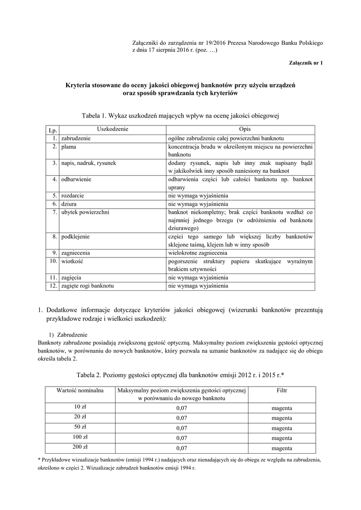 Załączniki do zarządzenia nr 19/2016 Prezesa Narodowego Banku Polskiego z dnia 17 sierpnia 2016 r. (poz. …) Załącznik nr 1 Kryteria stosowane do oceny jakości obiegowej banknotów przy użyciu urządzeń oraz sposób sprawdzania tych kryteriów Tabela 1. Wykaz uszkodzeń mających wpływ na ocenę jakości obiegowej Lp. 1. zabrudzenie 2. plama Uszkodzenie 3. napis, nadruk, rysunek 4. odbarwienie 5. rozdarcie 6. dziura 7. ubytek powierzchni 8. podklejenie 9. zagniecenia 10. wiotkość 11. zagięcia 12. zagięte rogi banknotu Opis ogólne zabrudzenie całej powierzchni banknotu koncentracja brudu w określonym miejscu na powierzchni banknotu dodany rysunek, napis lub inny znak napisany bądź w jakikolwiek inny sposób naniesiony na banknot odbarwienia części lub całości banknotu np. banknot uprany nie wymaga wyjaśnienia nie wymaga wyjaśnienia banknot niekompletny; brak części banknotu wzdłuż co najmniej jednego brzegu (w odróżnieniu od banknotu dziurawego) części tego samego lub większej liczby banknotów sklejone taśmą, klejem lub w inny sposób wielokrotne zagniecenia pogorszenie struktury papieru skutkujące wyraźnym brakiem sztywności nie wymaga wyjaśnienia nie wymaga wyjaśnienia 1. Dodatkowe informacje dotyczące kryteriów jakości obiegowej (wizerunki banknotów prezentują przykładowe rodzaje i wielkości uszkodzeń): 1) Zabrudzenie Banknoty zabrudzone posiadają zwiększoną gęstość optyczną. Maksymalny poziom zwiększenia gęstości optycznej banknotów, w porównaniu do nowych banknotów, który pozwala na uznanie banknotów za nadające się do obiegu określa tabela 2. Tabela 2. Poziomy gęstości optycznej dla banknotów emisji 2012 r. i 2015 r.* Wartość nominalna Maksymalny poziom zwiększenia gęstości optycznej w porównaniu do nowego banknotu Filtr 10 zł 0,07 magenta 20 zł 0,07 magenta 50 zł 0,07 magenta 100 zł 0,07 magenta 200 zł 0,07 magenta * Przykładowe wizualizacje banknotów (emisji 1994 r.) nadających oraz nienadających się do obiegu ze względu na zabrudzenia, określono w części 2. Wizualizacje zabrudzeń banknotów emisji 1994 r. Zwiększenie gęstości optycznej banknotu wyliczane jest w oparciu o wyższą z dwóch wartości średnich arytmetycznych z pomiarów wykonanych w co najmniej 4 punktach na niezadrukowanej powierzchni banknotu poza wizerunkiem znaku wodnego, oddzielnie na każdej stronie banknotu. Banknoty niespełniające powyższych wymogów nie nadają się do obiegu. 2) Plama Banknoty z koncentracją brudu na powierzchni banknotu pokrywającą obszar większy niż 9 mm × 9 mm na niezadrukowanej powierzchni banknotu lub większą niż 15 mm × 15 mm na zadrukowanej powierzchni banknotu, nie nadają się do obiegu. Emisja 1994 Emisja 2012 3) Napis, nadruk, rysunek Sortowanie według tego kryterium (w zakresie wykrywania napisów, nadruków oraz rysunków) nie jest obowiązkowe. 4) Odbarwienie Banknoty odbarwione w wyniku wyprania lub poddania ich działaniu agresywnych substancji chemicznych, mogą zostać wykryte przez czujniki elementów graficznych lub czujniki ultrafioletu. Tego rodzaju banknoty nie nadają się do obiegu. Emisja 1994 Emisja 2012 5) Rozdarcie Banknoty o rozdarciach, które są „otwarte” i znajdują się całkowicie lub częściowo poza obszarem działania elementów urządzenia odpowiedzialnych za transport mechaniczny nie nadają się do obiegu, jeżeli rozdarcia są większe, niż wskazane w tabeli 3. Tabela 3. Kierunek Szerokość Długość Pionowy 4 mm 8 mm Poziomy 4 mm 15 mm Ukośny 4 mm 18 mm*) * Pomiaru dokonuje się, wyznaczając prostą od końca rozdarcia do tego brzegu banknotu, przy którym znajduje się początek rozdarcia (rzut prostokątny), a nie mierząc długość samego rozdarcia. Emisja 1994 Emisja 2012 6) Dziura Banknoty z dziurami, które znajdują się całkowicie lub częściowo poza obszarem działania elementów urządzenia odpowiedzialnych za transport mechaniczny nie nadają się do obiegu, jeżeli powierzchnia dziury jest większa, niż 10 mm2. Emisja 1994 Emisja 2012 7) Ubytek Banknoty o długości zmniejszonej o 6 mm lub więcej lub o szerokości zmniejszonej o 5 mm lub więcej, nie nadają się do obiegu. Wszystkie pomiary odnoszą się do nominalnej długości i szerokości banknotów. Emisja 1994 Emisja 2012 8) Podklejenie Banknoty z taśmą klejącą zakrywającą powierzchnię o wymiarach większych niż 10 mm × 40 mm i grubszą niż 50 μm, nie nadają się do obiegu. Emisja 1994 Emisja 2012 9) Zagniecenia Banknoty pogniecione można zwykle rozpoznać na podstawie zmniejszonego współczynnika odbicia lub zmniejszonej sztywności papieru. Sortowanie według tego kryterium nie jest obowiązkowe. Emisja 1994 Emisja 2012 10) Wiotkość Banknoty o bardzo niskiej sztywności powinny być sortowane jako nienadające się do obiegu. Z uwagi na to, że wiotkość najczęściej łączy się z zabrudzeniem, banknoty te zazwyczaj są wykrywane również przez czujniki zabrudzeń. Sortowanie według tego kryterium nie jest obowiązkowe. 11) Zagięcia Banknoty z zagięciami są wykrywane przez czujniki sprawdzające wielkość banknotu, z uwagi na ich mniejszą długość lub szerokość lub przez czujniki grubości. Ze względu na ograniczenia techniczne, za banknoty nienadające się do obiegu uznane będą jednak tylko banknoty z zagięciami spełniającymi kryteria przewidziane dla uszkodzeń, tj. zagięcia powodujące zmniejszenie długości banknotu o ponad 6 mm lub szerokości banknotu o ponad 5 mm. Emisja 1994 Emisja 2012 12) Zagięte rogi banknotu Banknoty z zagiętymi rogami o obszarze większym, niż 220 mm2 i minimalnej długości krótszej krawędzi rogu przekraczającej 15 mm, nie nadają się do obiegu. Emisja 1994 Emisja 2012 2. Wizualizacje zabrudzeń banknotów emisji 1994 r. W każdym zestawie wizerunków dla wartości nominalnej, banknoty 1 i 2 prezentują banknoty nadające się do obiegu, banknot 3 „graniczny” nadający się 