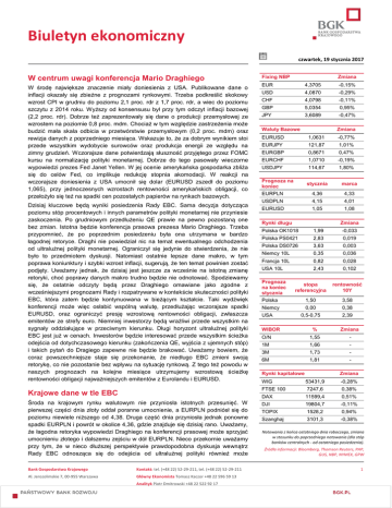 Biuletyn ekonomiczny czwartek, 19 stycznia 2017 W centrum uwagi konferencja Mario Draghiego Fixing NBP W środę największe znaczenie miały doniesienia z USA. Publikowane dane o inflacji okazały się zbieżne z prognozami rynkowymi. Trzeba podkreślić skokowy wzrost CPI w grudniu do poziomu 2,1 proc. rdr z 1,7 proc. rdr, a wiec do poziomu szczytu z 2014 roku. Wyższy od konsensusu był przy tym odczyt inflacji bazowej (2,2 proc. rdr). Dobrze też zaprezentowały się dane o produkcji przemysłowej ze wzrostem na poziomie 0,8 proc. mdm. Chociaż w tym względzie zastrzeżenia może budzić mała skala odbicia w przetwórstwie przemysłowym (0,2 proc. mdm) oraz rewizja danych z poprzedniego miesiąca. Wskazuje to, że za dobrym wynikiem stoi przede wszystkim wydobycie surowców oraz produkcja energii ze względu na zimny grudzień. Wczorajsze dane potwierdzają słuszność przyjętego przez FOMC kursu na normalizację polityki monetarnej. Dobrze do tego pasowały wieczorne wypowiedzi prezes Fed Janet Yellen. W jej ocenie amerykańska gospodarka zbliża się do celów Fed, co implikuje redukcję stopnia akomodacji. W reakcji na wczorajsze doniesienia z USA umocnił się dolar (EURUSD zszedł do poziomu 1,065), przy jednoczesnych wzrostach rentowności amerykańskich obligacji, co przełożyło się też na spadki cen pozostałych papierów na rynkach bazowych. EUR 4,3705 -0,15% USD 4,0870 -0,29% CHF 4,0798 -0,11% GBP 5,0354 0,95% JPY 3,6089 -0,47% Dzisiaj kluczowe będą wyniki posiedzenia Rady EBC. Sama decyzja dotycząca poziomu stóp procentowych i innych parametrów polityki monetarnej nie przyniesie zaskoczenia. Po grudniowym przedłużeniu QE prawie na pewno pozostaną one bez zmian. Istotna będzie konferencja prasowa prezesa Mario Draghiego. Trzeba przypomnieć, że po poprzednim posiedzeniu była ona utrzymana w bardzo łagodnej retoryce. Draghi nie powiedział nic na temat ewentualnego odchodzenia od ultraluźnej polityki monetarnej. Ograniczył się jedynie do stwierdzenia, że nie było to przedmiotem dyskusji. Natomiast ostatnie lepsze dane makro, w tym poprawa koniunktury i szybki wzrost inflacji, sugerują, że ten temat powinien zostać podjęty. Uważamy jednak, że dzisiaj jest jeszcze za wcześnie na istotną zmianę retoryki, choć poprawy danych makro trudno będzie nie odnotować. Spodziewamy się, że ostatnie odczyty będą przez Draghiego omawiane jako zgodne z wcześniejszymi prognozami Rady i rozpatrywane w kontekście skuteczności polityki EBC, która zatem będzie kontynuowana w bieżącym kształcie. Taki wydźwięk konferencji może więc osłabić wspólną walutę, przedłużając wczorajsze spadki EURUSD, oraz ograniczyć presję wzrostową rentowności obligacji, zwłaszcza emitentów ze strefy euro. Niemniej inwestorzy będą wrażliwi przede wszystkim na sygnały oddziałujące w przeciwnym kierunku. Długi horyzont ultraluźnej polityki EBC jest już w cenach. Inwestorów będzie interesować przede wszystkim ścieżka odejścia od dotychczasowego kierunku (zakończenia QE, wyjścia z ujemnych stóp) i takich pytań do Dragiego zapewne nie będzie brakować. Uważamy bowiem, że coraz powszechniejsze staje się przekonanie, że niedługo EBC zmieni swoją retorykę, co nie pozostanie bez wpływu na sytuację rynkową. Z tego też powodu w naszych prognozach na kolejne miesiące utrzymujemy wzrostową ścieżkę rentowności obligacji najważniejszych emitentów z Eurolandu i EURUSD. Krajowe dane w tle EBC Środa na krajowym rynku walutowym nie przyniosła istotnych przesunięć. W pierwszej części dnia złoty oddał poranne umocnienie, a EURPLN podniósł się do poziomu niewiele niższego od 4,38. Druga część dnia przyniosła jednak ponowne spadki EURPLN i powrót w okolice 4,36, gdzie znajduje się dzisiaj rano. Uważamy, że łagodna retoryka wypowiedzi Draghiego na konferencji prasowej może sprzyjać umocnieniu złotego i dalszemu zejściu w dół EURPLN. Nieco przekornie uważamy przy tym, że w nieco dłuższej perspektywie prawdopodobna dyskusja wewnątrz Rady EBC odnosząca się do odejścia od ultraluźnej polityki również może Bank Gospodarstwa Krajowego Kontakt: tel. (+48 22) 52-29-211, tel. (+48 22) 52-29-211 Al. Jerozolimskie 7, 00-955 Warszawa Główny Ekonomista Tomasz Kaczor +48 22 596 59 13 Analityk Piotr Dmitrowski +48 22 522 92 17 Zmiana Waluty Bazowe Zmiana EURUSD 1,0631 -0,77% EURJPY 121,87 1,01% EURGBP 0,8671 0,47% EURCHF 1,0710 -0,19% USDJPY 114,67 1,80% Prognoza na koniec EURPLN stycznia marca 4,36 4,33 USDPLN 4,15 4,01 EURUSD 1,05 1,08 Rynki długu Zmiana Polska OK1018 1,99 -0,033 Polska PS0421 2,83 0,019 Polska DS0726 3,63 0,003 Niemcy 10L 0,35 0,036 Francja 10L 0,82 0,028 USA 10L 2,43 0,102 Prognoza na koniec stycznia Polska stopa referencyjna rentowność 10Y 1,50 3,58 0,00 0,38 0,5-0,75 2,39 Niemcy USA WIBOR % Zmiana O/N 1,55 - 1M 1,66 - 3M 1,73 - 6M 1,81 - Rynki kapitałowe Zmiana WIG 53431,9 -0,28% FTSE 100 7247,6 0,38% DAX 11599,4 0,51% DJI 19804,7 -0,11% TOPIX 1528,2 0,94% Szanghaj 3101,3 -0,38% Notowania z końca ostatniego dnia roboczego, zmiana w stosunku do poprzedniego notowania (dla stóp banków centralnych - od ostatniego posiedzenia). Źródła informacji: Bloomberg, Thomson Reuters, PAP, GUS, NBP, NYMEX, GPW 1 Biuletyn ekonomiczny czwartek, 19 stycznia 2017 sprzyjać ponownemu przesunięciu krzywej w dół. Ryzykiem dla tego scenariusza jest jednak wysoka wrażliwość inwestorów na niewykluczone sygnały dotyczące ścieżki odejścia od dotychczasowej polityki. korzystnie oddziaływać na złotego, łączyć się może bowiem z oczekiwaniami, że na zmianę retoryki zdecyduje się również RPP. W środę nie było też dużych zmian na krajowym rynku długu. Na koniec dnia ceny polskich obligacji pozostawały blisko poziomów z otwarcia. Wzrosty rentowności pojawiły się na dzisiejszym otwarciu, co jest wynikiem analogicznych zmian na rynkach bazowych, zwłaszcza wieczornego ruchu w górę 