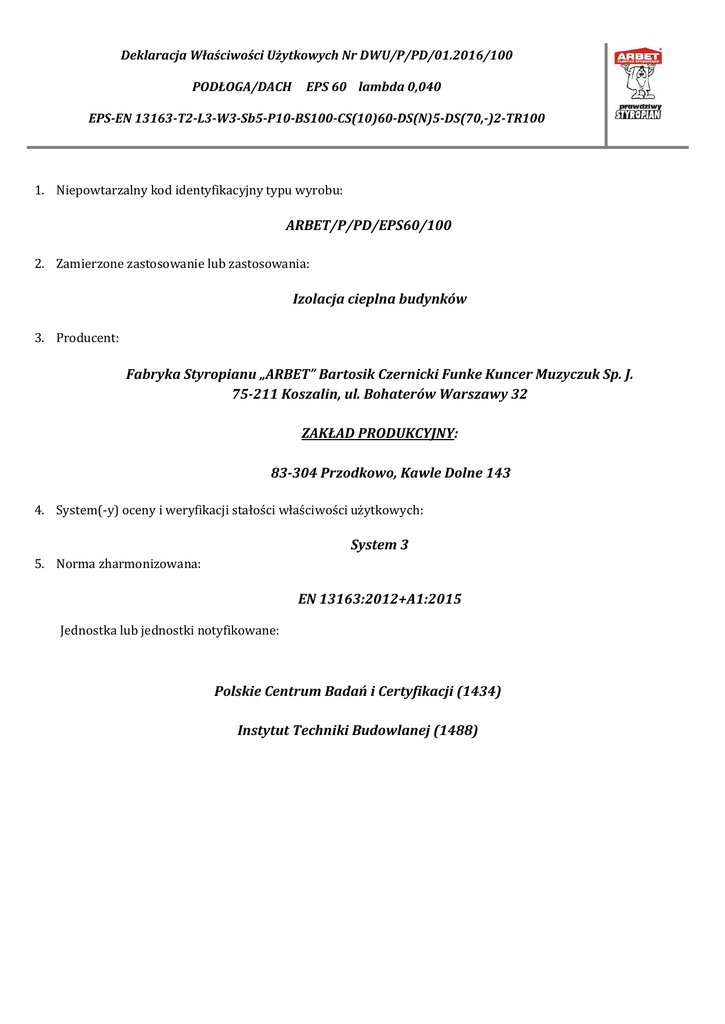 Deklaracja Właściwości Użytkowych Nr DWU/P/PD/01.2016/100 PODŁOGA/DACH EPS 60 lambda 0,040 EPS-EN 13163-T2-L3-W3-Sb5-P10-BS100-CS(10)60-DS(N)5-DS(70,-)2-TR100 1. Niepowtarzalny kod identyfikacyjny typu wyrobu: ARBET/P/PD/EPS60/100 2. Zamierzone zastosowanie lub zastosowania: Izolacja cieplna budynków 3. Producent: Fabryka Styropianu „ARBET” Bartosik Czernicki Funke Kuncer Muzyczuk Sp. J. 75-211 Koszalin, ul. Bohaterów Warszawy 32 ZAKŁAD PRODUKCYJNY: 83-304 Przodkowo, Kawle Dolne 143 4. System(-y) oceny i weryfikacji stałości właściwości użytkowych: System 3 5. Norma zharmonizowana: EN 13163:2012+A1:2015 Jednostka lub jednostki notyfikowane: Polskie Centrum Badań i Certyfikacji (1434) Instytut Techniki Budowlanej (1488) Deklaracja Właściwości Użytkowych Nr DWU/P/PD/01.2016/100 PODŁOGA/DACH EPS 60 lambda 0,040 EPS-EN 13163-T2-L3-W3-Sb5-P10-BS100-CS(10)60-DS(N)5-DS(70,-)2-TR100 6. Deklarowane właściwości użytkowe: Opór cieplny Właściwości użytkowe Opór cieplny i współczynnik przewodzenia ciepła Grubość Reakcja na ogień Trwałość reakcji na ogień w funkcji ciepła, warunków atmosferycznych, starzenia/degradacji Trwałość oporu cieplnego w funkcji ciepła, warunków atmosferycznych , starzenia/degradacji Reakcja na ogień Trwałość właściwości b) Opór cieplny i współczynnik przewodzenia ciepła c) Deklarowana klasa/poziom /NPD a) RD = 2,50 m2K/W D = 0,040 W/mK T2 dN = 100 mm E Zharmonizowana specyfikacja techniczna E RD = 2,50 m2K/W D = 0,040 W/mK NPD EN 13163:2012+A1:2015 Zasadnicze charakterystyki Trwałość właściwości Naprężenie ściskające przy 10 % Wytrzymałość na ściskanie CS(10)60 odkształceniu Wytrzymałość na zginanie BS100 Wytrzymałość na rozciąganie/zginanie Wytrzymałość na rozciąganie TR100 prostopadle do powierzchni czołowych Pełzanie przy ściskaniu NPD Trwałość wytrzymałości na ściskanie w funkcji Odporność na zamrażanieNPD starzenia i degradacji odmrażanie Długotrwała redukcja grubości NPD Nasiąkliwość wodą przy NPD długotrwałym zanurzeniu Przepuszczalność wody Absorpcja wody przy długotrwałej NPD dyfuzji Przepuszczalność pary wodnej Przenikanie pary wodnej NPD Sztywność dynamiczna NPD Wskaźnik izolacyjności od dźwięków uderzeniowych Grubość, dL NPD (dla podłóg) Ściśliwość NPD d) Ciągłe spalanie w postaci żarzenia Ciągłe spalanie w postaci żarzenia Uwalnianie się substancji niebezpiecznych do Uwalnianie się substancji środowiska wewnętrznego niebezpiecznych d) a) NPD – właściwości użytkowe nieustalone; b) właściwości ogniowe EPS nie zmieniają się w czasie; c) współczynnik przewodzenia ciepła nie zmienia się w czasie; d) europejskie metody badań są w trakcie opracowania Właściwości użytkowe określonego wyżej wyrobu są zgodne z zestawem deklarowanych właściwości użytkowych. Niniejsza deklaracja właściwości użytkowych wydana zostaje zgodnie z rozporządzeniem (UE) nr 305/2011 na wyłączną odpowiedzialność producenta określonego powyżej. W imieniu producenta podpisał(-a): w Koszalinie dnia 02.01.2016 r.