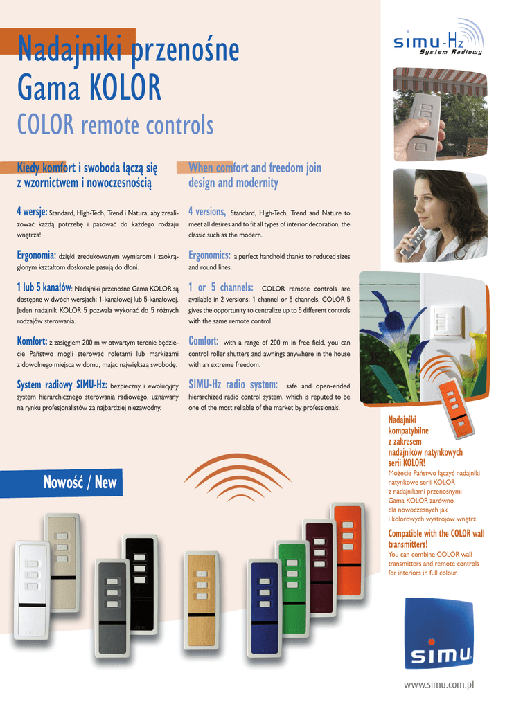 Nadajniki przenoÊne Gama KOLOR COLOR remote controls Kiedy komfort i swoboda ∏àczà si´ z wzornictwem i nowoczesnoÊcià When comfort and freedom join design and modernity 4 wersje: Standard, High-Tech, Trend i Natura, aby zreali- 4 versions, zowaç ka˝dà potrzeb´ i pasowaç do ka˝dego rodzaju wn´trza! Standard, High-Tech, Trend and Nature to meet all desires and to fit all types of interior decoration, the classic such as the modern. Ergonomia: dzi´ki zredukowanym wymiarom i zaokrà- Ergonomics: a perfect handhold thanks to reduced sizes glonym kszta∏tom doskonale pasujà do d∏oni. and round lines. 1 lub 5 kana∏ów: Nadajniki przenoÊne Gama KOLOR sà 1 or 5 channels: dost´pne w dwóch wersjach: 1-kana∏owej lub 5-kana∏owej. Jeden nadajnik KOLOR 5 pozwala wykonaç do 5 ró˝nych rodzajów sterowania. COLOR remote controls are available in 2 versions: 1 channel or 5 channels. COLOR 5 gives the opportunity to centralize up to 5 different controls with the same remote control. Komfort: z zasi´giem 200 m w otwartym terenie b´dzie- Comfort: cie Paƒstwo mogli sterowaç roletami lub markizami z dowolnego miejsca w domu, majàc najwi´kszà swobod´. with a range of 200 m in free field, you can control roller shutters and awnings anywhere in the house with an extreme freedom. System radiowy SIMU-Hz: bezpieczny i ewolucyjny SIMU-Hz radio system: system hierarchicznego sterowania radiowego, uznawany na rynku profesjonalistów za najbardziej niezawodny. safe and open-ended hierarchized radio control system, which is reputed to be one of the most reliable of the market by professionals. Nadajniki kompatybilne z zakresem nadajników natynkowych serii KOLOR! NowoÊç / New Mo˝ecie Paƒstwo ∏àczyç nadajniki natynkowe serii KOLOR z nadajnikami przenoÊnymi Gama KOLOR zarówno dla nowoczesnych jak i kolorowych wystrojów wn´trz. Compatible with the COLOR wall transmitters! You can combine COLOR wall transmitters and remote controls for interiors in full colour. www.simu.com.pl • Prze∏àcznik bezprzewodowy: klasa III. • Stopieƒ zabezpieczenia: IP 30. • Cz´stotliwoÊç radiowa: 433,42 MHz. • Bezpieczeƒstwo transmisji dzi´ki zastosowaniu technologii “kodu kroczàcego” - ponad 16 milionów kombinacji kodowych. • Temperaturowy zakres pracy: od +5°C do +40°C. • Zasi´g: ~ 200 m w otwartym terenie ~ 20 m przez dwie Êciany ˝elbetonowe (zale˝ny od warunków Êrodowiska i zanieczyszczenia radiowego). • Zasilanie: bateria litowa 3 V typu CR 2430. ˚ywotnoÊç oko∏o 3 lata (4 naciÊni´cia przycisku przez 1 sek. na dzieƒ). • Wymiary: 120 x 43 x 15 mm. STANDARD Numery referencyjne References Bia∏y/White Be˝owy/Beige KOLOR 1 / COLOR 1 • Wireless switch: class III • Protection Index: IP 30 • Radio frequency: 433.42 MHz • Secure control orders with “Rolling Code” technology: encrypted technology with more than 16 million combinations. • Ambient temperature of use: +5°C / +40°C • Range: ~200 m in free field ~20 m between two reinforced concrete walls (it depends of the environment and of the pollution) • Power: 3V lithium battery type CR 2430. Lifetime of about 3 years (4 pressures of 1s. / day) • Dimensions: 120 x 43 x 15 mm HIGH-TECH Czarny /Black Metaliczny szary /Metallic grey TREND Âliwkowy /Prune Pomaraƒczowy Zielony/Green Niebieski/Blue /Orange NATURA /NATURE Jasny dàb /Light Oak 2006085 2006947 2006948 2006086 2006087 2006951 2006950 2006949 2006952 2006090 2006953 2006954 2006091 2006092 2006957 2006956 2006955 2006958 2006138 2006959 2006960 2006139 2006140 2006963 2006962 2006961 2006964 2006143 2006965 2006966 2006144 2006145 2006969 2006968 2006967 2006970 - 9014700 9014702 9014701 9014705 9014708 9014707 9014706 9014709 - 9014710 9014712 9014711 9014713 9014716 9014715 9014714 9014717 (po 1 szt./by 1) KOLOR 5 /COLOR 5 (po 1 szt./by 1) Wersja USA KOLOR 1 / Version US COLOR 1 (po 1 szt./by 1) Wersja USA KOLOR 5 / Version US COLOR 5 (po 1 szt./by 1) Zestaw KOLOR 1 / Kit COLOR 1 (10 kolorowych maskownic / 10 coloured caps) Zestaw KOLOR 5 / Kit COLOR 5 (10 kolorowych maskownic / 10 coloured caps) Dost´pne sà tak˝e karty katalogowe pozosta∏ych produktów zakresu radiowego SIMU-Hz. Prosimy o kontakt. The whole range of SIMU-Hz products is available in product information leaflets. Please, consult us. www.simu.com.pl Realizacja SIMU - znak nr 07.08 - 2008 PL SIMU Polska — Ten dokument nie jest prawnie wià˝àcy. W ka˝dej chwili zastrzegamy sobie prawo zmian i poprawy naszej oferty. SIMU nie bierze odpowiedzialnoÊci w przypadku u˝ycia przez osoby niekompetentne. This document is not legally binding. We reserve ourselves the right to make any useful modification in order to constantly develop and improve our tender. SIMU shall not be held responsible for misure by non-professionals. Charakterystyka techniczna Technical characteristics