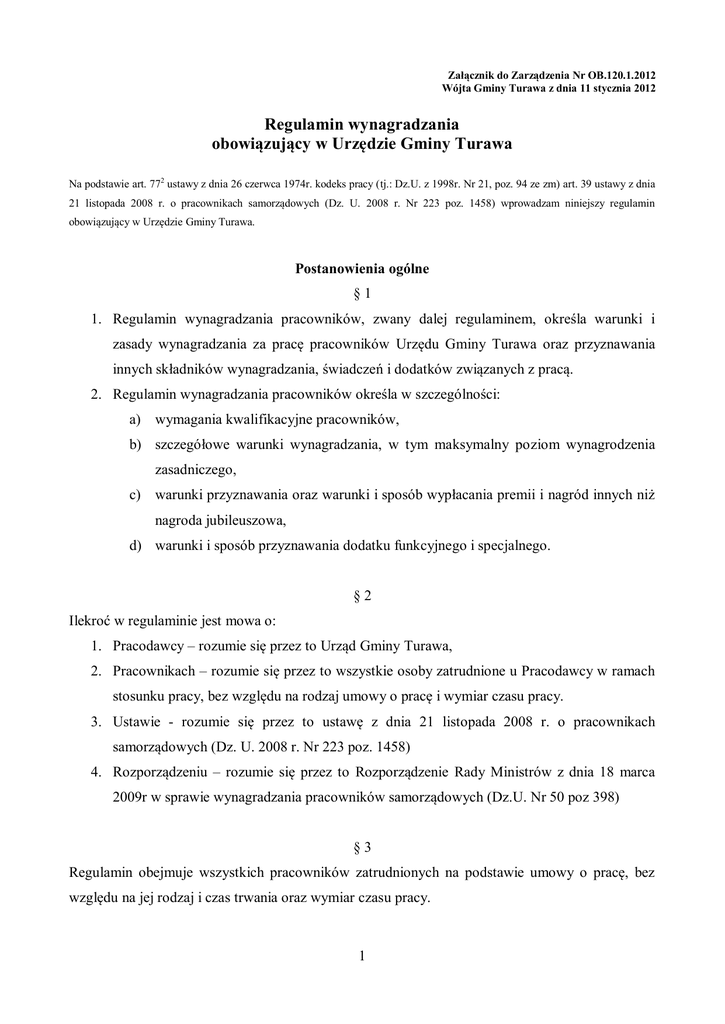 Załącznik do Zarządzenia Nr OB.120.1.2012 Wójta Gminy Turawa z dnia 11 stycznia 2012 Regulamin wynagradzania obowiązujący w Urzędzie Gminy Turawa Na podstawie art. 772 ustawy z dnia 26 czerwca 1974r. kodeks pracy (tj.: Dz.U. z 1998r. Nr 21, poz. 94 ze zm) art. 39 ustawy z dnia 21 listopada 2008 r. o pracownikach samorządowych (Dz. U. 2008 r. Nr 223 poz. 1458) wprowadzam niniejszy regulamin obowiązujący w Urzędzie Gminy Turawa. Postanowienia ogólne §1 1. Regulamin wynagradzania pracowników, zwany dalej regulaminem, określa warunki i zasady wynagradzania za pracę pracowników Urzędu Gminy Turawa oraz przyznawania innych składników wynagradzania, świadczeń i dodatków związanych z pracą. 2. Regulamin wynagradzania pracowników określa w szczególności: a) wymagania kwalifikacyjne pracowników, b) szczegółowe warunki wynagradzania, w tym maksymalny poziom wynagrodzenia zasadniczego, c) warunki przyznawania oraz warunki i sposób wypłacania premii i nagród innych niż nagroda jubileuszowa, d) warunki i sposób przyznawania dodatku funkcyjnego i specjalnego. §2 Ilekroć w regulaminie jest mowa o: 1. Pracodawcy – rozumie się przez to Urząd Gminy Turawa, 2. Pracownikach – rozumie się przez to wszystkie osoby zatrudnione u Pracodawcy w ramach stosunku pracy, bez względu na rodzaj umowy o pracę i wymiar czasu pracy. 3. Ustawie - rozumie się przez to ustawę z dnia 21 listopada 2008 r. o pracownikach samorządowych (Dz. U. 2008 r. Nr 223 poz. 1458) 4. Rozporządzeniu – rozumie się przez to Rozporządzenie Rady Ministrów z dnia 18 marca 2009r w sprawie wynagradzania pracowników samorządowych (Dz.U. Nr 50 poz 398) §3 Regulamin obejmuje wszystkich pracowników zatrudnionych na podstawie umowy o pracę, bez względu na jej rodzaj i czas trwania oraz wymiar czasu pracy. 1 Zasady wynagradzania za pracę §4 Wynagrodzenie miesięczne pracowników ustala się w oparciu o rozporządzenie i niniejszy regulamin oraz limit środków finansowych przeznaczonych na wynagrodzenia pracowników ujętych w budżecie Gminy na dany rok uchwalony przez Radę Gminy Turawa. §5 1. Miesięczne wynagrodzenie pracowników obejmuje: a) wynagrodzenie zasadnicze, b) dodatek za wieloletnią pracę, c) nagrodę jubileuszową, d) jednorazową odprawę w związku z przejściem na emeryturę lub rentę z tytułu niezdolności do pracy, e) dodatkowe wynagrodzenie roczne, f) premię, g) dodatek funkcyjny, h) dodatek specjalny, i) nagrodę, j) wynagrodzenie za pracę w godzinach nadliczbowych, k) wynagrodzenie za pracę w porze nocnej, 2. Wynagrodzenie zasadnicze łącznie z dodatkiem stażowym i funkcyjnym oraz służbowym płatne jest co miesiąc z dołu w kasie Urzędu Gminy, Turawa ul Opolska 39c przedostatniego dnia każdego miesiąca; jeżeli ten dzień jest dniem wolnym od pracy, wynagrodzenie wypłaca się w dniu poprzednim. 3. Wypłata wynagrodzenia odbywa się do rąk własnych pracownika albo osoby przez niego upoważnionej lub współmałżonka pracownika, w razie gdy nie może on osobiście odebrać wynagrodzenia z powodu przemijającej przeszkody i nie złożył pisemnego sprzeciwu co do dokonywani wypłaty wynagrodzenia do rąk współmałżonka. 4. Wynagrodzenie na wniosek pracownika może być przekazywane na jego rachunek oszczędnościowo – rozliczeniowy 2 §6 1. Wynagrodzenie pracownika zatrudnionego w pełnym wymiarze czasu pracy nie może być niższe od wynagrodzenia ustalonego zgodnie z ustawą z 10 października 2002r o minimalnym wynagrodzeniu za pracę (Dz.U. Nr 200, poz 1679 ze zm). 2. Pracownikowi zatrudnionemu w niepełnym wymiarze czasu pracy przysługuje wynagrodzenie zasadnicze i inne składniki wynagrodzenia w wysokości proporcjonalnej do wymiaru czasu pracy określonego w umowie o pracę. Wysokość minimalnego wynagrodzenia takiego pracownika ustala się w kwocie proporcjonalnej do liczby godzin pracy przypadającej do przepracowania przez pracownika w danym miesiącu, biorąc za podstawę wysokość minimalnego wynagrodzenia ustalonego na podstawie ustawy z 10 października 2002r o minimalnym wynagrodzeniu za pracę (Dz.U. Nr 200, poz 1679 ze zm). §7 Maksymalny poziom wynagrodzenia zasadniczego określa załącznik nr 1 do niniejszego regulaminu. Premia §8 1. Ustala się zasady premiowania pracowników podległych Wójtowi Gminy w Turawie, zatrudnionych w Urzędzie Gminy na stanowiskach robotniczych. 2. Premia ma charakter uznaniowy i stanowi motywację do zwiększenia wydajności pracy, przestrzegania terminowości oraz poprawy stylu, organizacji i dyscypliny pracy. 3. Wysokość indywidualnych premii pracowników powinna być uzależniona od następujących wyników: a. -terminowe i rzetelne wykonywanie powierzonych w ramach zakresu czynności obowiązków oraz dodatkowych zadań premiowych, b. -stopień złożoności i trudności wykonywania powierzonych zadań, c. -dbałość o powierzony sprzęt i urządzenia biurowe, d. -przestrzeganie dyscypliny pracy, e. -szczególne osiągnięcia zawodowe, f. -przepracowanie wszystkich dni roboczych w okresie objętym premią, z zastrzeżeniem § 8 pkt 7 4. Za terminowe, sumienne i rzetelne wykonywanie obowiązków służbowych może być przyznana: a. Indywidualna premia pracownika wynosi do 30% wynagrodzenia zasadniczego. 3 b. Premia w wymiarze podwyższonym (do 60% ) może być przyznana pracownikowi, któremu wyznaczono dodatkowe zadania premiowe wychodzące poza jego zakres czynności, pod warunkiem uzyskania znaczących dla zakładu osiągnięć w tej pracy. 5. Wójt Gminy może pozbawić pracownika w części lub w całości premii za następujące uchybienia w pracy: a. nieusprawiedliwiona nieobecność w pracy, b. stawienie się do pracy w stanie po spożyciu alkoholu lub narkotyków (lub innego środka odurzającego), c. rozwiązanie stosunku pracy w związku z porzuceniem pracy lub zwolnieniem dyscyplinarnym, d. działanie na szkodę pracodawcy, e. naruszenie przepisów bhp i dyscypliny pracy, f