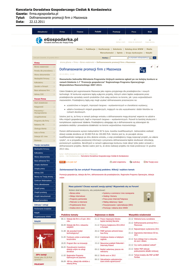 Kancelaria Doradztwa Gospodarczego Cielak & Kordasiewicz Gazeta: firma.egospodarka.pl Tytu³: Dofinansowanie promocji firm z Mazowsza Data: 22.12.2011 startuj z nami dodaj do ulubionych mapa serwisu Prawo | Publikacje | Konferencje | Szkolenia | Katalog stron WWW | Media Nieruchomości | Opinie | Grupy dyskusyjne | Książki Dziś jest Czwartek, 22 grudnia 2011r. Firma w artykułach eGospodarka.pl 6 Szukaj : strona główna › Firma › Biznes wiadomości › Dofinansowanie promocji firm z Mazowsza A+ Biznes wiadomości A– Porady dla pracodawcy Dofinansowanie promocji firm z Mazowsza Wzory dokumentów 22.12.2011, 11:42 Niezbędnik firmowy Mazowiecka Jednostka Wdrażania Programów Unijnych zamierza ogłosić po raz kolejny konkurs w Kalkulatory ramach Działania 1.7 "Promocja gospodarcza" Regionalnego Programu Operacyjnego Województwa Mazowieckiego 2007-2013. Zarobki w firmach Baza adresowa firm Adresy ZUS Forum Firma Celem Działania jest wypromowanie Mazowsza jako regionu przyjaznego dla przedsiębiorców i nowych technologii. W konkursie wspierane będą wyłącznie projekty, których celem będzie zwiększenie przez przedsiębiorców sprzedaży swoich produktów i/lub usług zarówno na terenie, jak i poza województwem mazowieckim. Przedsiębiorcy będą więc mogli uzyskać dofinansowanie przeznaczone na: Start działalności Księgowość Pracownicy i Wynagrodzenia Urząd/Kontrola Programy dla firmy Reklama i PR l uczestnictwo w targach, imprezach targowo - wystawienniczych w charakterze wystawcy; l udział w branżowych misjach gospodarczych, mających na celu wyszukiwanie i dobór klientów na rynkach docelowych. Istotne jest to, że firmy w ramach jednego wniosku o dofinansowanie mogą otrzymać wsparcie na udział w kilku misjach gospodarczych, bądź w imprezach targowo – wystawienniczych. Pozwoli to bardziej skutecznie i kompleksowo zaplanować działania. Przedsiębiorcy ubiegający się o dofinansowanie są zobowiązani do posiadania siedziby i prowadzenia działalności na terenie województwa mazowieckiego. Obsługa klienta Auto w firmie Dotacje UE i inne Edukacja Twoje narzędzia Niezbędnik firmowy Kalkulatory Wzory dokumentów Poziom dofinansowania wynosi maksymalnie 50 % tyzw. kosztów kwalifikowalnych. Jednocześnie wielkość dotacji została określona od 30.000 PLN do 150.000 PLN. Istotne jest to, że początek okresu kwalifikowalności następuje po dniu złożenia wniosku, a więc przedsiębiorcy mogą rozpocząć projekt „na własne ryzyko”, co w przypadku pozytywnej informacji o przyznaniu dofinansowania będzie skutkować refundacją poniesionych wydatków. Beneficjent w ramach ogłoszonego konkursu może złożyć tylko jeden wniosek o dofinansowanie projektu. Bardzo ważne jest to, że okres realizacji projektu nie może przekroczyć 31 grudnia 2013 roku. tytuł : Dofinansowanie promocji firm z Mazowsza oprac. : Jan Kordasiewicz / Kancelaria Doradztwa Gospodarczego Cieślak & Kordasiewicz Baza adresowa firm co to jest rss? poleć znajomemu wydrukuj dla Twojej www Urzędy skarbowe Urzędy pracy Zainteresował Cię ten artykuł? Przeczytaj podobne. Kliknij i wybierz temat: Adresy ZUS Promocja gospodarcza, dotacje dla firm, dofinansowanie dla przedsiębiorców, Regionalne Programy Operacyjne, dotacje Newsy na Twoją stronę unijne Centrum Webmastera Firmy zlikwidowane Masz pytanie? Chcesz wyrazić swoją opinię? Wypowiedz się na Forum! Znajdź pracę Wybierz dział tematyczny, aby podyskutować: Znajdź przetarg • Biznes online • Systemy e-commerce i inne rozwiązania Znajdź nieruchomość • Sklepy internetowe • Hosting i Domeny • Programy partnerskie • Praca przez Internet/Telepraca • Płatności w internecie • Mailing reklamowy i Spam Zakupy i usługi • Projektowanie Stron • Pozycjonowanie i optymalizacja (SEO) Porównanie kredytów • Analiza stron www • Promocja i reklama stron WWW Znajdź providera Książki Podobne tematy Najnowsze w dziale Wszystkie wiadomości 08.11 Dotacje dla firm w II poł. 2011 roku 21.12 Prawo migracyjne Ukrainy będzie bardziej liberalne 22.12 Wahania kursu eurodolara 06.09 Dotacje dla firm z obszarów wiejskich 21.12 Przerwa świąteczna 2011/2012 w Europie 31.08 Jak pozyskać kredyt technologiczny? 20.12 PARP pomoże ochronić knowhow firmy 31.05 Fundusze unijne a samorządy terytorialne 19.12 Inicjatywa Jessica w kolejnym regionie 18.05 Program Bon na innowacje 15.12 Nieuczciwe praktyki Polkomtel i Internetq Poland 22.12 Czy warto podpisać weksel? 09.12 Budżet zadaniowy jeszcze nie wdrożony 22.12 Sektor MSP odczuje podwyższenie składki rentowej 08.12 Strefa euro w 2012 22.12 Tańsze kredyty dla MSP od BNP Paribas Projektowanie WWW Książki 22.12 Dofinansowanie promocji firm z Mazowsza 22.12 Najważniejsze wydarzenia 2011 06.05 Poszukiwanie inwestora: dotacje unijne na usługi doradcze 20% taniej! Dzisiaj tylko 55.20 PLN sprawdź » POLECAMY 11.02 Regionalne Programy Operacyjne do poprawy 06.09 100 tys. dotacji dla rolników z własną firmą 08.12 Zatrudnianie cudzoziemców: szara strefa ograniczona? 22.12 Zagrożenia internetowe III kw. 2011 22.12 Kurs złotego traci w stosunku do euro i dolara Kancelaria Doradztwa Gospodarczego Cielak & Kordasiewicz Gazeta: firma.egospodarka.pl Tytu³: Dofinansowanie promocji firm z Mazowsza Data: 22.12.2011 Senior.pl Bezplatna prenumerata naszego Newsletter'a! Global Economy Twoje dane : Marketing w Praktyce Chcę otrzymywać : Twoje imię b Dziennik eGospodarka.pl c d e f g Twój e-mail b Analizator c d e f g GRATIS : więcej » darmowe e-booki i raporty bezpłatne zaproszenia na b Tydzień w gospodarce c d e f g konferencje i szkolenia i wersja html n j k l m n j wersja txt k l m najnowsze newsy na Twoją skrzynkę e-mail i wiele innych korzyści Kalkulatory Oferty pracy Baza firm Przydatne kalkulatory biznesowe: Wpisz słowo kluczowe lub wybierz branżę: Wyszukiwarka firm i instytucji w bazie Panorama Firm: słowo kluczowe: l kalkulator stażu 