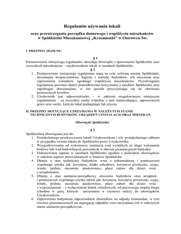 Regulamin używania lokali oraz przestrzegania porządku domowego i współżycia mieszkańców w Spółdzielni Mieszkaniowej „Krzemionki” w Ostrowcu Św. I. PRZEPISY OGÓLNE. §1 Postanowienia niniejszego regulaminu określają obowiązki i uprawnienia Spółdzielni oraz wszystkich mieszkańców – użytkowników lokali w zasobach Spółdzielni. §2 1. Postanowienia niniejszego regulaminu mają na celu ochronę mienia Spółdzielni, utrzymania bezpieczeństwa, higieny i estetyki budynków, ich otoczenia oraz zapewnienia warunków zgodnego współżycia mieszkańców. Przestrzeganie regulaminu powinno służyć prawidłowemu korzystaniu z zasobów Spółdzielni oraz zapobiegać dewastacjom, w ten sposób przyczyniając się do obniżenia ponoszonych kosztów. 2. Użytkownik jest odpowiedzialny – w zakresie uregulowanym niniejszym regulaminem – za wszystkie osoby wspólnie z nim zamieszkujące, zaproszonych gości oraz osoby, którym lokal podnajmuje lub użycza. II. PRZEPISY DOTYCZĄCE UTRZYMANIA W NALEŻYTYM STANIE TECHNICZNYM BUDYNKÓW, URZĄDZEŃ I INSTALACJI ORAZ MIESZKAŃ. Obowiązki Spółdzielni. §3 Spółdzielnia obowiązana jest do: 1. Protokolarnego przekazywania lokali Użytkownikom i ich protokolarnego odbioru w przypadku zwrotu lokalu do Spółdzielni przez Użytkownika. 2. Wyegzekwowania od wykonawcy usunięcia wad wynikłych ze złego wykonania budowy lub wad budowlanych powstałych w okresie gwarancyjnym budynku. 3. Dokonywania napraw w zasobach Spółdzielni zgodnie z podziałem obowiązków w zakresie napraw przewidzianych w Statucie Spółdzielni. 4. Dbania o stan techniczny budynków wraz z infrastrukturą i pomieszczeń wspólnego użytku jak: korytarze, klatki schodowe, korytarze piwniczne, zsypy, windy, pralnie, suszarnie, piaskownice, place zabaw dla dzieci wraz z urządzeniami. 5. Dbania o stan sanitarno-porządkowy otoczenia budynków oraz urządzeń i pomieszczeń wspólnego użytku takich jak: korytarze, korytarze piwniczne, zsypy, windy, pralnie, suszarnie, piaskownice, place zabaw dla dzieci wraz z wyposażeniem – z wyłączeniem klatek schodowych, od pierwszego stopnia biegu schodów w górę, których utrzymanie w czystości należy do obowiązków Użytkowników. 6. Zapewnienia budynkom odpowiednich zbiorników na odpady komunalne, w tym również przeznaczonych na segregację odpadów oraz utrzymania ich w należytym stanie sanitarno-porządkowym. 2 7. Wyposażenia budynków w numery administracyjne, właściwe oznakowanie pomieszczeń wspólnego użytkowania, pomieszczeń technicznych, dróg i terenów osiedlowych oraz dróg pożarowych przy budynkach wysokich. 8. Zapewnienia właściwego ogrzewania mieszkań w okresach grzewczych oraz interweniowania u właściwych dostawców w przypadkach zaistnienia przerw w dostawach wody, gazu, energii elektrycznej oraz czynnika cieplnego. 9. Przeprowadzania dezynsekcji, deratyzacji, dezynfekcji pomieszczeń wspólnego użytku jak: pralnie, suszarnie, korytarze piwniczne, klatki schodowe, zsypy, altany śmietnikowe. 10. Umieszczenia na książeczkach opłat aktualnych telefonów kontaktowych. 11. Zawiadamiania Użytkowników o terminach planowanych prac remontowokonserwacyjnych wymagających udostępnienia lokali, poprzez wywieszenie ogłoszeń na klatkach schodowych, w telewizji kablowej lub siedzibie Spółdzielni. Obowiązki i prawa użytkowników. 1. 2. 3. 4. 5. 1. 2. 3. 4. §4 Lokale w Spółdzielni mogą być używane wyłącznie na cele określone w przydziale lub umowie, wszelkie zmiany w tym zakresie należy zgłosić do Spółdzielni. Użytkownik lokalu mieszkalnego ma obowiązek każdorazowo zawiadomić Spółdzielnię o zmianie liczby osób w nim zamieszkujących. Montaż krat na zewnątrz okien i loggii oraz innych urządzeń, a w szczególności anten na ścianach budynków wymaga zgłoszenia do Wydziału Architektury i Budownictwa Starostwa Powiatowego w Ostrowcu Św. Użytkownikowi lokalu mieszkalnego przysługuje prawo do korzystania z pomieszczeń wspólnego użytkowania zgodnie z ich przeznaczeniem. Zabrania się otwierania włazów dachowych i wychodzenia na połać dachową oraz instalowania jakichkolwiek urządzeń bez porozumienia z administracją osiedla. §5 Użytkownik jest obowiązany dbać o należytą konserwację lokalu mieszkalnego lub użytkowego oraz innych pomieszczeń (garaże, piwnice) oraz dokonywać napraw i remontów w zakresie ustalonym w Statucie określającym obowiązki Spółdzielni i członków w zakresie napraw w zasobach Spółdzielni Mieszkaniowej „Krzemionki” w Ostrowcu Św. Użytkownicy lokali są zobowiązani do korzystania we właściwy sposób z lokali i części budynków przeznaczonych do wspólnego użytkowania jak: klatki schodowe, windy, pomieszczenia zsypów, pralnie, suszarnie, mając na uwadze zapewnienie ładu i porządku, oraz prawidłowego stanu sanitarnego. Zabrania się przechowywania na klatkach schodowych i w korytarzach piwnicznych mebli, rowerów, wózków i innych rzeczy uniemożliwiających swobodną komunikację. Zabrania się spożywania alkoholu, używania narkotyków i palenia tytoniu na klatkach schodowych, w pomieszczeniach wspólnego użytku. §6 1. Zabrania się mieszkańcom wykonywania wszelkich napraw lub dokonywania jakichkolwiek czynności w tablicach rozdzielczych prądu elektrycznego, przy zaworach centralnego ogrzewania w pionach i w rozdzielaczach c.o., przy 3 2. 3. 4. 5. 6. 7. 8. 9. 10. 11. instalacji gazowej, wodno-kanalizacyjnej, znajdujących się na klatkach schodowych, w innych pomieszczeniach wspólnego użytkowania, oraz pomieszczeniach przynależnych. Zabrania się dokonywania przeróbek instalacji: gazowej, c.o., wod.-kan., elektrycznej, przewodów kominowych w mieszkaniach przez osoby nie posiadające uprawnień zawodowych i bez uzgodnienia z administracją osiedla. Osoby nie przestrzegające powyższego zakazu w przypadku spowodowania awarii lub jakichkolwiek zakłóceń w funkcjonowaniu tych instalac