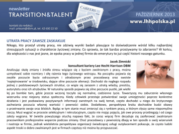 PAŹDZIERNIK 2013 UTRATA PRACY ZAWSZE ZASKAKUJE Nikogo, kto przeżył utratę pracy, nie zdziwią wyniki badań plasujące to doświadczenie wśród kilku najbardziej stresujących sytuacji o charakterze życiowej zmiany. Co sprawia, że tak bardzo przeżywamy to zdarzenie? W końcu, dla większości z nas jest jasne, że epoka pracy w jednej firmie do emerytury to już część historii naszego gatunku. Jacek Zimnicki konsultant kariery Lee Hecht Harrison DBM Analizując skalę zmiany i źródła stresu wiążące się z byciem zwolnionym z pracy, można uzmysłowić sobie rozmiary i siłę rażenia tego życiowego wstrząsu. Na początku pojawia się zwykle poczucie bycia odrzuconym i zdradzonym przez pracodawcę oraz swoiste ‘napiętnowanie’ w środowisku, dające silne poczucie alienacji. Dochodzi do nagłego rozpadu jednej z podstawowych życiowych struktur, co wiąże się zarazem z utratą władzy, prestiżu, autorytetu oraz ich atrybutów. W naturalny sposób pojawia się silne poczucie pustki, jak wielki lej po bombie tam, gdzie jeszcze wczoraj toczyło się normalne, codzienne życie. Towarzyszą mu zaburzenie własnego wizerunku oraz niejasny status społeczny. Kiedy człowiek przestaje potwierdzać swoje umiejętności poprzez konkretne działania i jest pozbawiony pozytywnych informacji zwrotnych na swój temat, często dochodzi u niego do krytycznego zachwiania poczucia własnej wartości i pewności siebie. Dodatkowo, perspektywa braku dochodów budzi obawy o przetrwanie swoje oraz bliskich. Będąc w tym stanie musi zmierzyć się z rynkiem pracy, o którym słyszy same niepomyślne rzeczy. Musi wygrać w procesie selekcyjnym i rekrutacyjnym, często nie mając pojęcia, jak owe procesy przebiegają i od czego zależy wygrana. W świetle powyższego otuchą napawa fakt, że coraz więcej firm decyduje się zaoferować zwalnianym pracownikom profesjonalne wsparcie podczas zmiany. Choć pracodawcy z pewnością dbają w ten sposób o swój wizerunek i nastroje w firmie, jednak wieloletnia perspektywa organizacji świadczącej usługi outplacement pokazuje, że czysto ludzki aspekt troski o dobro zwalnianych jest w firmach częstszy niż można by przypuszczać. POSŁUSZEŃSTWO W RELACJACH MISTRZ-UCZEŃ „Obserwuję, że coraz częściej kamieniem obrazy staje się wymaganie posłuszeństwa od pracownika. Tymczasem na czym zasadza się idea mentoringu, relacji mistrz-uczeń, obecnej właściwie we wszystkich kulturach, zaczynając od starszych plemienia, przez hinduskich guru, mistrzów zen, greckich nauczycieli, na ojcach pustyni kończąc? Właśnie na posłuszeństwie. Paradoksalnie to brak posłuszeństwa jest nierozwojowy, bo skazuje nas na kręcenie się wokół własnych nawyków, wydeptanych mocno mentalnych kolein. Zwrócił mi na to kiedyś uwagę mój coach. Rzeczywiście, gdyby mi nie zarekomendował pewnych rozwiązań, sam z siebie nigdy bym ich nie wypróbował, po prostu bym na to nie wpadł. Dlaczego okazałem się posłuszny? Bo zostawił mi wolność wyboru, a ja z niej skorzystałem, okazując posłuszeństwo - poeksperymentowałem, posmakowałem. Niektóre metody przyjąłem, innych nie. I takie podejście jest dzisiaj według mnie kluczem do sukcesu szefa. Pytaj, ale też pokazuj różne rozwiązania, szanując wolność wyboru; oczekuj sensownego posłuszeństwa, pobudzając do samodzielności.” Piotr Kociołek, założyciel TTX Institute W WYJĄTKOWYCH MIEJSCACH O ZMIANIE Ruszamy z kolejnym cyklem spotkań poświęconych doświadczeniom firm przechodzącym przez trudne zmiany. Tym razem będziemy szukać czynników, które decydują o tym, czy w efekcie zmiany przynoszą więcej szkód czy pożytku. Razem z nami o pokonywaniu trudności i wyłapywaniu szans będą mówili menedżerowie, którzy odpowiadali za niełatwe reorganizacje i przeprowadzenie liderów i zespołów przez niepopularne zmiany. Serdecznie zapraszamy na przedpołudniowe spotkania z nami w nietypowych i ciekawych miejscach, które będziemy chcieli przy okazji Państwu pokazać. Udział jest bezpłatny, a zgłoszenia przyjmują nasi konsultanci w oddziałach Lee Hecht Harrison DBM w całej Polsce. WARSZAWA KRAKÓW WROCŁAW POZNAŃ ŁÓDŹ - 5 listopada - 19 listopada - 21 listopada - 2 grudnia - 5 grudnia ZMIANY, KTÓRE NISZCZĄ. ZMIANY, KTÓRE BUDUJĄ POD PODWÓJNYM OSTRZAŁEM CZYLI O BIZNESOWYCH WYZWANIACH Coraz więcej firm stawia czoła dwojakiego rodzaju wyzwaniom: po pierwsze nadal mierzą się z problemami dotyczącymi reorganizacji i co za tym idzie redukcji personelu i spadku morale. A po drugie nierzadko otrzymują jednocześnie do realizacji wymagające plany sprzedażowe. W podobnej sytuacji znalazł się ostatnio jeden z największych banków w Polsce, z którym współpracowaliśmy. Restrukturyzacja oznaczała zwolnienie ponad 150 osób przy ciągłej potrzebie utrzymania wysokich wyników finansowych. Istotne okazało się przygotowanie menedżerów do komunikowania zwolnień pracownikom oraz wsparcie dla odchodzących (outplacement na terenie całej Polski). Kluczowa dla całego procesu była jednak decyzja o zadbaniu o szefów, którzy będą pracowali z tymi, którzy pozostają w organizacji. Bank zainwestował zatem w cykl 12 warsztatów dla tych liderów, na których spoczywała odpowiedzialność za wdrożenie zmiany. Najważniejszym wyzwaniem było utrzymanie ich motywacji do wprowadzania samej zmiany. Sukcesem okazała się praca warsztatowa oparta na metodach team -coachingowych, wyposażająca menedżerów w umiejętności radzenia sobie z trudnymi emocjami oraz wspierania podwładnych w przejściu przez zmianę. Rezultat: bank zajął jedno z najwyższych miejsc w wewnętrznym korporacyjnym badaniu oceniającym poziom przywództwa w organizacji. O szczegółach tego projektu opowiemy w trakcie najbliższego cyklu konferencji „ZMIANY, KTÓRE NISZCZĄ. ZMIANY, KTÓRE BUDUJĄ”. źródło:sxc.hu MEDIA FLASH „Kandydaci chcą wiedzieć, dlaczego odpa