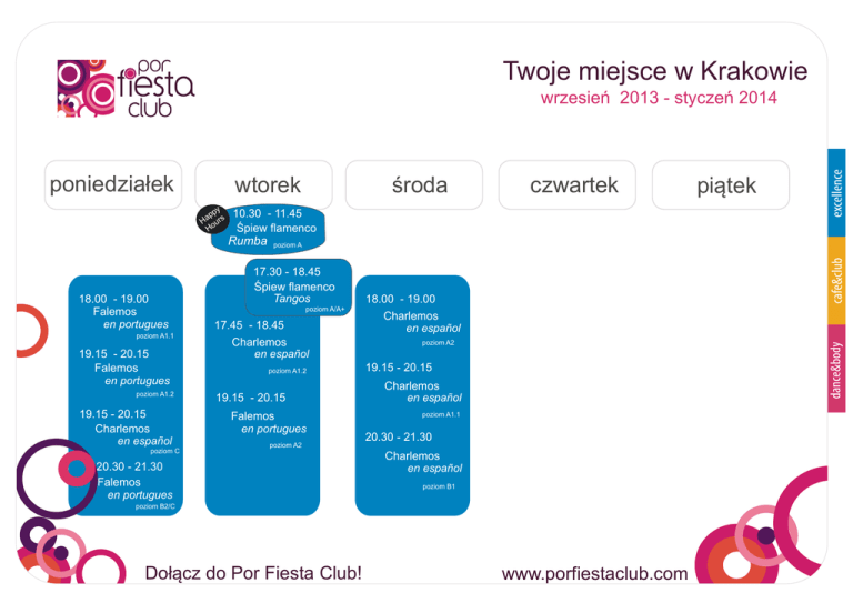 Twoje miejsce w Krakowie wrzesień 2013 - styczeń 2014 GODZINA poniedziałek wtorek środa czwartek piątek y 10.30 - 11.45 pp Ha ours H Śpiew flamenco 11.30 - 12.45 Rumba poziom A Flamenco 18.00 - 19.00 Falemos en portugues poziom A1.1 19.15 - 20.15 Falemos en portugues poziom A1.2 19.15 - 20.15 Charlemos en español poziom C 17.30 - 18.45 Śpiew flamenco Tangos poziom A/A+ 17.45 - 18.45 Charlemos en español poziom A1.2 19.15 - 20.15 Falemos en portugues poziom A2 20.30 - 21.30 Falemos en portugues 18.00 - 19.00 Charlemos en español Tangos poziom A2 19.15 - 20.15 Charlemos en español poziom A1.1 20.30 - 21.30 Charlemos en español poziom B1 poziom B2/C Dołącz do Por Fiesta Club! www.porfiestaclub.com