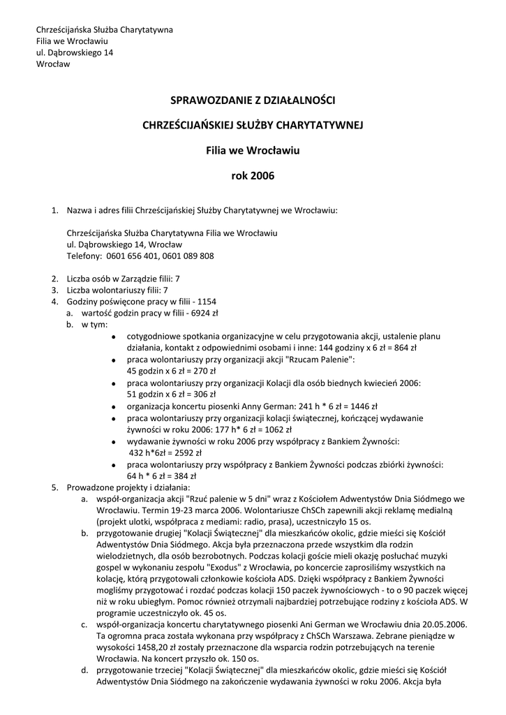 Chrześcijaoska Służba Charytatywna Filia we Wrocławiu ul. Dąbrowskiego 14 Wrocław SPRAWOZDANIE Z DZIAŁALNOŚCI CHRZEŚCIJAŃSKIEJ SŁUŻBY CHARYTATYWNEJ Filia we Wrocławiu rok 2006 1. Nazwa i adres filii Chrześcijaoskiej Służby Charytatywnej we Wrocławiu: Chrześcijaoska Służba Charytatywna Filia we Wrocławiu ul. Dąbrowskiego 14, Wrocław Telefony: 0601 656 401, 0601 089 808 2. Liczba osób w Zarządzie filii: 7 3. Liczba wolontariuszy filii: 7 4. Godziny poświęcone pracy w filii - 1154 a. wartośd godzin pracy w filii - 6924 zł b. w tym: cotygodniowe spotkania organizacyjne w celu przygotowania akcji, ustalenie planu działania, kontakt z odpowiednimi osobami i inne: 144 godziny x 6 zł = 864 zł praca wolontariuszy przy organizacji akcji "Rzucam Palenie": 45 godzin x 6 zł = 270 zł praca wolontariuszy przy organizacji Kolacji dla osób biednych kwiecieo 2006: 51 godzin x 6 zł = 306 zł organizacja koncertu piosenki Anny German: 241 h * 6 zł = 1446 zł praca wolontariuszy przy organizacji kolacji świątecznej, kooczącej wydawanie żywności w roku 2006: 177 h* 6 zł = 1062 zł wydawanie żywności w roku 2006 przy współpracy z Bankiem Żywności: 432 h*6zł = 2592 zł praca wolontariuszy przy współpracy z Bankiem Żywności podczas zbiórki żywności: 64 h * 6 zł = 384 zł 5. Prowadzone projekty i działania: a. współ-organizacja akcji "Rzud palenie w 5 dni" wraz z Kościołem Adwentystów Dnia Siódmego we Wrocławiu. Termin 19-23 marca 2006. Wolontariusze ChSCh zapewnili akcji reklamę medialną (projekt ulotki, współpraca z mediami: radio, prasa), uczestniczyło 15 os. b. przygotowanie drugiej "Kolacji Świątecznej" dla mieszkaoców okolic, gdzie mieści się Kościół Adwentystów Dnia Siódmego. Akcja była przeznaczona przede wszystkim dla rodzin wielodzietnych, dla osób bezrobotnych. Podczas kolacji goście mieli okazję posłuchad muzyki gospel w wykonaniu zespołu "Exodus" z Wrocławia, po koncercie zaprosiliśmy wszystkich na kolację, którą przygotowali członkowie kościoła ADS. Dzięki współpracy z Bankiem Żywności mogliśmy przygotowad i rozdad podczas kolacji 150 paczek żywnościowych - to o 90 paczek więcej niż w roku ubiegłym. Pomoc również otrzymali najbardziej potrzebujące rodziny z kościoła ADS. W programie uczestniczyło ok. 45 os. c. współ-organizacja koncertu charytatywnego piosenki Ani German we Wrocławiu dnia 20.05.2006. Ta ogromna praca została wykonana przy współpracy z ChSCh Warszawa. Zebrane pieniądze w wysokości 1458,20 zł zostały przeznaczone dla wsparcia rodzin potrzebujących na terenie Wrocławia. Na koncert przyszło ok. 150 os. d. przygotowanie trzeciej "Kolacji Świątecznej" dla mieszkaoców okolic, gdzie mieści się Kościół Adwentystów Dnia Siódmego na zakooczenie wydawania żywności w roku 2006. Akcja była przeznaczona przede wszystkim dla rodzin wielodzietnych, dla osób bezrobotnych. Podczas kolacji goście mieli okazję posłuchad muzyki gospel w wykonaniu zespołu Kościoła ADS we Wrocławiu, po koncercie zaprosiliśmy wszystkich na kolację, którą przygotowali członkowie kościoła ADS. Dzięki współpracy z Bankiem Żywności mogliśmy przygotowad i rozdad podczas kolacji ponad 300 paczek żywnościowych. Pomoc również otrzymali najbardziej potrzebujące rodziny z kościoła ADS. Z programu skorzystało ok. 100 os. e. uczestnictwo w Ogólnopolskiej Akcji Świątecznej Zbiórki Żywności. Termin 2-3 grudnia 2006. Wraz z Bankiem Żywności wolontariusze ChSCh wzięli udział z zbieraniu żywności na terenie marketów: Auchan i Geant we Wrocławiu. Ilośd zebranej żywności w roku 2006 jeszcze nie została wykazana w raporcie działania Banków Żywności. Ilośd osób, oferujących pomoc nie jest możliwa do oszacowania. f. wydawanie żywności dla osób potrzebujących przy współpracy z Bankiem Żywności w terminie 04.2006 - 12.2006, z pomocy pod koniec roku korzystało już 280 osób. Częśd finansowa Rodzaj udzielonej pomocy Liczba osób Wartośd pomocy Wyliczenie objętych pomocą [zł] "RZUCAM PALENIE W 5 DNI" Źródło finansowania Praca wolontarystyczna 45 h * 6 zł 270 Wolontariusze Prelegent 5dni*2h*50zł 500 Wynajęcie pomieszczenia 5dni*2h*20zł 200 Ogrzewanie sali 5dni*100zł 500 Wyposażenie sprzętowe 5dni*2h*40zł 400 Ulotki 3000 szt. 100 Reklama w mediach 6 źródeł*3 audycje*150zł 2700 Wartośd projektu 45 Krzysztof Krasucki wolontariusz Kościół Adwentystów Kościół Adwentystów Kościół Adwentystów Kościół Adwentystów Media 4670 "KOLACJA DLA OSÓB BIEDNYCH oraz KONCERT" Praca woluntarystyczna 16h*6 zł 96 Zespół EMAUS 5h*7osób*6zł 210 Wynajęcie Sali 1dzieo*4h*40zł 160 Wyposażenie sprzętowe 2h*40zł 80 Koszty wyżywienia Żywnośd Żywnośd wydana z Banku Żywności Transport żywności Wartośd projektu Wolontariusze Zespół EMAUS wolontariat Kościół Adwentystów Kościół Adwentystów Na podstawie paragonów Bez paragonów 170 Wolontariusze 90,30 Filia ChSCh Na podstawie faktur 1558,35 Bank Żywności 50 2414,65 Wolontariusze 150 "KONCERT PIOSENEK ANNY GERMAN" Praca woluntarystyczna Wynajęcie Sali Wyżywienie wolontariuszy 241 h * 6 zł 1446 Wolontariusze 1dzieo*5h*120zł 600 CK Agora 300 Filia ChSCh W-w Materiały biurowe Telefony Zaproszenia Przejazdy Materiały reklamowe Hotel Transport 335 300 296,63 562,96 Filia ChSCh W-w Filia ChSCh W-w Filia ChSCh W-wa Filia ChSCh W-wa 150 Filia ChSCh W-wa 600 500 Inne wydatki 515,94 Hotel Irys ChSCh Zarząd Filia ChSCh W-w i W-wa Wartośd projektu 100 5606,53 "OGÓLNOPOLSKA ZBIÓRKA ŻYWNOŚCI" Praca wolontarystyczna Koszty przejazdu Transport Wartośd projektu 64h*6zł 384 Wolontariusze 48 35 467 Filia ChSCh W-w Darczyoca "KONCERT I WYDAWANIE ŻYWNOŚCI" Praca wolontarystyczna 142h*6zł 852 Wynajęcie sali 1dzieo*4h*40zł 160 Zespół muzyczny 7osób*5h*6zł 210 2h*40zł 80 Wyposażenie sprzętowe Żywnośd Wartośd wydanej żywności Inne Transport Wartośd projektu 280