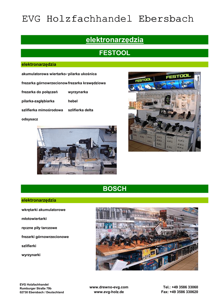 EVG Holzfachhandel Ebersbach elektronarzędzia FESTOOL elektronarzędzia akumulatorowa wiertarko-wkr pilarka ukośnica frezarka górnowrzecionowafrezarka krawędziowa frezarka do połączeń wyrzynarka pilarka-zagłębiarka hebel szlifierka mimośrodowa szlifierka delta odsysacz BOSCH elektronarzędzia wkrętarki akumulatorowe młotowiertarki ręczne piły tarczowe frezarki górnowrzecionowe szlifierki wyrzynarki EVG Holzfachhandel Rumburger Straße 79b 02730 Ebersbach / Deutschland www.drewno-evg.com www.evg-holz.de Tel.: +49 3586 33060 Fax: +49 3586 330620 EVG Holzfachhandel Ebersbach PANASONIC elektronarzędzia akumulatorowa wiertarko-wkrętarka piły akumulatorowe EVG Holzfachhandel Rumburger Straße 79b 02730 Ebersbach / Deutschland www.drewno-evg.com www.evg-holz.de Tel.: +49 3586 33060 Fax: +49 3586 330620