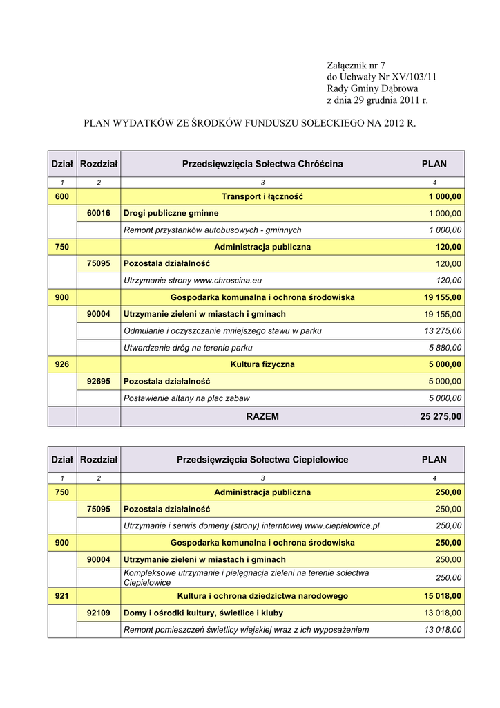 Załącznik nr 7 do Uchwały Nr XV/103/11 Rady Gminy Dąbrowa z dnia 29 grudnia 2011 r. PLAN WYDATKÓW ZE ŚRODKÓW FUNDUSZU SOŁECKIEGO NA 2012 R. Dział Rozdział 1 Przedsięwzięcia Sołectwa Chróścina PLAN 3 4 2 600 Transport i łączność 60016 Drogi publiczne gminne 1 000,00 Remont przystanków autobusowych - gminnych 1 000,00 750 Administracja publiczna 75095 900 120,00 Utrzymanie strony www.chroscina.eu 120,00 19 155,00 Odmulanie i oczyszczanie mniejszego stawu w parku 13 275,00 926 5 880,00 Kultura fizyczna 1 5 000,00 Postawienie altany na plac zabaw 5 000,00 PLAN 3 4 750 Administracja publiczna 900 921 250,00 Utrzymanie i serwis domeny (strony) interntowej www.ciepielowice.pl 250,00 250,00 Utrzymanie zieleni w miastach i gminach 250,00 Kompleksowe utrzymanie i pielęgnacja zieleni na terenie sołectwa Ciepielowice 250,00 Kultura i ochrona dziedzictwa narodowego 92109 250,00 Pozostala działalność Gospodarka komunalna i ochrona środowiska 90004 25 275,00 Przedsięwzięcia Sołectwa Ciepielowice 2 75095 5 000,00 Pozostala działalność RAZEM Dział Rozdział 19 155,00 Utrzymanie zieleni w miastach i gminach Utwardzenie dróg na terenie parku 92695 120,00 Pozostala działalność Gospodarka komunalna i ochrona środowiska 90004 1 000,00 15 018,00 Domy i ośrodki kultury, świetlice i kluby 13 018,00 Remont pomieszczeń świetlicy wiejskiej wraz z ich wyposażeniem 13 018,00 92195 Pozostala działalność 2 000,00 Festyn wiejski z zabawą z okazji dożynek połączoną z konkursami dla dzieci 2 000,00 RAZEM Dział Rozdział 900 Przedsięwzięcia Sołectwa Dąbrowa Gospodarka komunalna i ochrona środowiska 90004 Zagospodarowanie - przekształcenie byłego zbiornika p.poż. obok poczty w Dąbrowie na skwer z zielenią i ławkami 19 700,00 92195 3 4 1 17 978,00 Zagospodarowanie terenu wokół świetlicy wiejskiej 12 978,00 Wyposażenie świetlicy wiejskiej 5 000,00 Pozostala działalność 3 000,00 Organizacja festynu wiejskiego oraz dożynek 3 000,00 PLAN 3 4 Gospodarka komunalna i ochrona środowiska 90004 9 149,00 Utrzymanie zieleni w miastach i gminach 9 149,00 Zakup traktorka kosiarki 8 500,00 Koszenie terenów zielonych w sołectwie oraz zakup środków eksploatacyjnych RAZEM Dział Rozdział 20 978,00 Przedsięwzięcia Sołectwa Lipowa 2 900 20 978,00 Domy i ośrodki kultury, świetlice i kluby RAZEM Dział Rozdział 25 275,00 PLAN Kultura i ochrona dziedzictwa narodowego 92109 5 575,00 Przedsięwzięcia Sołectwa Karczów 2 921 25 275,00 25 275,00 RAZEM 1 PLAN Utrzymanie zieleni w miastach i gminach Utrzymanie zieleni na terenie sołectwa Dąbrowa Dział Rozdział 15 518,00 Przedsięwzięcia Sołectwa Mechnice 649,00 9 149,00 PLAN 1 2 3 900 Gospodarka komunalna i ochrona środowiska 90004 763,30 Zakup kosiarki spalinowej, paliwa 763,30 Kultura fizyczna 24 511,70 Kompleksowe ułożenie kostki brukowej pod pawilon biesiadny 18 191,70 Wyposażenie placu zabaw i remont piaskownicy RAZEM Dział Rozdział 900 4 2 300,00 Zagospodarowanie terenu zielonego 1 500,00 800,00 Kultura i ochrona dziedzictwa narodowego 6 000,00 Organizowanie imprez i uroczystości wiejskich 6 000,00 Kultura fizyczna 16 393,00 Pozostala działalność 16 393,00 Plac zabaw 16 393,00 RAZEM 2 900 921 PLAN 3 4 500,00 Utrzymanie zieleni w miastach i gminach 500,00 Paliwo do kosiarki i konserwacja - naprawa 500,00 Kultura i ochrona dziedzictwa narodowego 92109 24 693,00 Przedsięwzięcia Sołectwa Niewodniki Gospodarka komunalna i ochrona środowiska 90004 6 000,00 Pozostala działalność 926 1 2 300,00 Utrzymanie zieleni w miastach i gminach 921 Dział Rozdział 25 275,00 3 Środki na utrzymanie kosiarki 92695 880,00 PLAN Gospodarka komunalna i ochrona środowiska 92195 5 440,00 Przedsięwzięcia Sołectwa Narok 2 90004 24 511,70 Pozostala działalność Zakup stołów i ławek do pawilonu biesiadnego 1 763,30 Utrzymanie zieleni w miastach i gminach 926 92695 4 14 842,00 Domy i ośrodki kultury, świetlice i kluby 12 842,00 Remont i wyposażenie pomieszczeń świetlicy wiejskiej 12 842,00 92195 Pozostala działalność 2 000,00 Impreza integracyjna 2 000,00 RAZEM Dział Rozdział 1 Przedsięwzięcia Sołectwa Nowa Jamka PLAN 3 4 2 600 Transport i łączność 60095 9 478,00 Utwardzenie części działki nr 97 poprzez wykonanie nawierzchni z betonowej kostki brukowej 9 478,00 Dział Rozdział PLAN 3 4 Gospodarka komunalna i ochrona środowiska 90004 6 700,00 Budowa ogrodzenia działki gminnej nr 102/2 w Prądach 6 700,00 Kultura i ochrona dziedzictwa narodowego 1 215,00 Festyn wiejski 1 215,00 Kultura fizyczna 1 2 900 5 000,00 Plac rekreacyjno-wypoczynkowy 5 000,00 921 PLAN 3 4 1 500,00 Utrzymanie zieleni w miastach i gminach 1 500,00 Zakup kosiarki spalinowej z napędem oraz podkaszarki 1 500,00 Kultura i ochrona dziedzictwa narodowego 92109 12 915,00 Przedsięwzięcia Sołectwa Siedliska Gospodarka komunalna i ochrona środowiska 90004 5 000,00 Pozostala działalność RAZEM Dział Rozdział 1 215,00 Pozostala działalność 926 92695 6 700,00 Utrzymanie zieleni w miastach i gminach 921 92195 9 478,00 Przedsięwzięcia Sołectwa Prądy 2 900 9 478,00 Pozostala działalność RAZEM 1 15 342,00 Domy i ośrodki kultury, świetlice i kluby 6 537,00 6 537,00 Wyposażenie pomieszczenia socjalnego wraz z remontem - znajdującego się w świetlicy wiejskiej 5 037,00 Rolety okienne - montaż w oknach świetlicy wiejskiej w Siedliskach 1 500,00 RAZEM Dział Rozdział 1 Przedsięwzięcia Sołectwa Skarbiszów PLAN 3 4 2 600 Transport i łączność 60016 921 1 000,00 Remont przystanku przy ul. Narockiej w Skarbiszowie 1 000,00 Domy i ośrodki kultury, świetlice i kluby Budowa budynku gospodarczego oraz podwyższenie siatki ogrodzeniowej znajdującej się na terenie świetlicy wiejskiej Wymiana okien w kuchni i pomieszczeniu gospodarczym świetlicy wiejskiej 926 Kultura fizyczna 92695 1 1 5 235,00 14 735,00 Przedsięwzięcia Sołectwa Sławice PLAN 3 4 25 275,00 Domy i ośrodki kultury, świetlice i kluby 25 275,00 