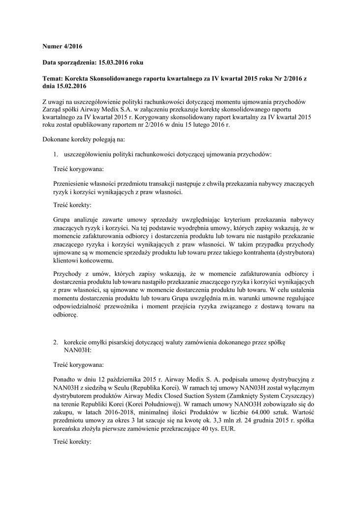 Numer 4/2016 Data sporządzenia: 15.03.2016 roku Temat: Korekta Skonsolidowanego raportu kwartalnego za IV kwartał 2015 roku Nr 2/2016 z dnia 15.02.2016 Z uwagi na uszczegółowienie polityki rachunkowości dotyczącej momentu ujmowania przychodów Zarząd spółki Airway Medix S.A. w załączeniu przekazuje korektę skonsolidowanego raportu kwartalnego za IV kwartał 2015 r. Korygowany skonsolidowany raport kwartalny za IV kwartał 2015 roku został opublikowany raportem nr 2/2016 w dniu 15 lutego 2016 r. Dokonane korekty polegają na: 1. uszczegółowieniu polityki rachunkowości dotyczącej ujmowania przychodów: Treść korygowana: Przeniesienie własności przedmiotu transakcji następuje z chwilą przekazania nabywcy znaczących ryzyk i korzyści wynikających z praw własności. Treść korekty: Grupa analizuje zawarte umowy sprzedaży uwzględniając kryterium przekazania nabywcy znaczących ryzyk i korzyści. Na tej podstawie wyodrębnia umowy, których zapisy wskazują, że w momencie zafakturowania odbiorcy i dostarczenia produktu lub towaru nie nastąpiło przekazanie znaczącego ryzyka i korzyści wynikających z praw własności. W takim przypadku przychody ujmowane są w momencie sprzedaży produktu lub towaru przez takiego kontrahenta (dystrybutora) klientowi końcowemu. Przychody z umów, których zapisy wskazują, że w momencie zafakturowania odbiorcy i dostarczenia produktu lub towaru nastąpiło przekazanie znaczącego ryzyka i korzyści wynikających z praw własności, są ujmowane w momencie dostarczenia produktu lub towaru. W celu ustalenia momentu dostarczenia produktu lub towaru Grupa uwzględnia m.in. warunki umowne regulujące odpowiedzialność przewoźnika i moment przejścia ryzyka związanego z dostawą towaru na odbiorcę. 2. korekcie omyłki pisarskiej dotyczącej waluty zamówienia dokonanego przez spółkę NAN03H: Treść korygowana: Ponadto w dniu 12 października 2015 r. Airway Medix S. A. podpisała umowę dystrybucyjną z NAN03H z siedzibą w Seulu (Republika Korei). W ramach tej umowy NAN03H został wyłącznym dystrybutorem produktów Airway Medix Closed Suction System (Zamknięty System Czyszczący) na terenie Republiki Korei (Korei Południowej). W ramach umowy NANO3H zobowiązało się do zakupu, w latach 2016-2018, minimalnej ilości Produktów w liczbie 64.000 sztuk. Wartość przedmiotu umowy za okres 3 lat szacuje się na kwotę ok. 3,3 mln zł. 24 grudnia 2015 r. spółka koreańska złożyła pierwsze zamówienie przekraczające 40 tys. EUR. Treść korekty: Ponadto w dniu 12 października 2015 r. Airway Medix S. A. podpisała umowę dystrybucyjną z NAN03H z siedzibą w Seulu (Republika Korei). W ramach tej umowy NAN03H został wyłącznym dystrybutorem produktów Airway Medix Closed Suction System (Zamknięty System Czyszczący) na terenie Republiki Korei (Korei Południowej). W ramach umowy NANO3H zobowiązało się do zakupu, w latach 2016-2018, minimalnej ilości Produktów w liczbie 64.000 sztuk. Wartość przedmiotu umowy za okres 3 lat szacuje się na kwotę ok. 3,3 mln zł. 24 grudnia 2015 r. spółka koreańska złożyła pierwsze zamówienie przekraczające 40 tys. PLN. Podstawa prawna: §5 ust. 1 pkt. 1) Załącznika nr 3 do Regulaminu Alternatywnego Systemu Obrotu „Informacje bieżące i okresowe przekazywane w alternatywnym systemie obrotu na rynku NewConnect” Załączniki: Raport kwartalny za IV kwartał 2015 roku_Korekta Osoby reprezentujące spółkę: Marek Orłowski – Prezes Zarządu Anna Aranowska-Bablok – Członek Zarządu