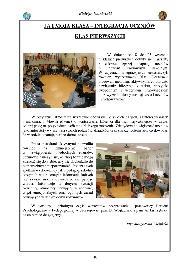 Biuletyn Uczniowski JA I MOJA KLASA – INTEGRACJA UCZNIÓW KLAS PIERWSZYCH W dniach od 8 do 23 września w klasach pierwszych odbyły się warsztaty z zakresu lepszej adaptacji uczniów w nowym środowisku szkolnym. W zajęciach integracyjnych uczestniczyli również wychowawcy klas. Uczniowie pracowali metodami aktywnymi, co ułatwiło nawiązanie bliższego kontaktu, sprzyjało swobodnym i uczciwym wypowiedziom oraz wyzwało dobry nastrój wśród uczniów i wychowawców. W przyjaznej atmosferze uczniowie opowiadali o swoich pasjach, zainteresowaniach i marzeniach. Mówili również o wartościach, które są dla nich najważniejsze w życiu, opierając się na przykładach osób z najbliższego otoczenia. Zdecydowana większość uczniów jako autorytety wymieniała swoich rodziców, dziadków oraz starsze rodzeństwo, co dowodzi, że w rodzinie panują bardzo dobre stosunki. Praca metodami aktywnymi pozwoliła również na zmniejszenie barier w nawiązywaniu swobodnych rozmów, uczniowie nauczyli się, w jakiej formie mogą zwracać się do siebie, aby nie dochodziło do niepotrzebnych nieporozumień. Podczas tych spotkań wychowawcy jak i pedagog szkolny otrzymali wiele cennych informacji, których nie zawsze można dowiedzieć się pytając wprost. Informacje te dotyczą sytuacji rodzinnej, atmosfery panującej w rodzinie, więzi emocjonalnych oraz ogólnych zasad panujących w danym domu rodzinnym. W tym roku szkolnym część warsztatów przeprowadzili pracownicy Poradni Psychologiczno – Pedagogicznej w Jędrzejowie, pani B. Wojtachnio i pani A. Jastrzębska, za co bardzo dziękujemy. mgr Małgorzata Wielińska 10