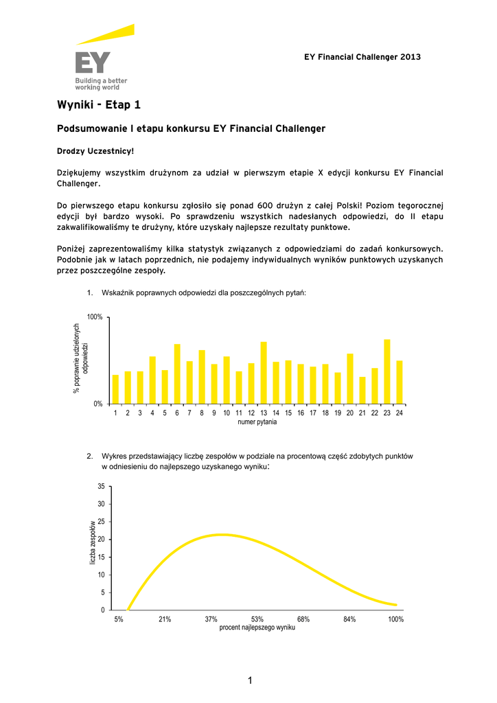 EY Financial Challenger 2013 Wyniki - Etap 1 Podsumowanie I etapu konkursu EY Financial Challenger Drodzy Uczestnicy! Dziękujemy wszystkim drużynom za udział w pierwszym etapie X edycji konkursu EY Financial Challenger. Do pierwszego etapu konkursu zgłosiło się ponad 600 drużyn z całej Polski! Poziom tegorocznej edycji był bardzo wysoki. Po sprawdzeniu wszystkich nadesłanych odpowiedzi, do II etapu zakwalifikowaliśmy te drużyny, które uzyskały najlepsze rezultaty punktowe. Poniżej zaprezentowaliśmy kilka statystyk związanych z odpowiedziami do zadań konkursowych. Podobnie jak w latach poprzednich, nie podajemy indywidualnych wyników punktowych uzyskanych przez poszczególne zespoły. Wskaźnik poprawnych odpowiedzi dla poszczególnych pytań: 1. % poprawnie udzielonych odpowiedzi 100% 0% 1 2. 2 3 4 5 6 7 8 9 10 11 12 13 14 15 16 17 18 19 20 21 22 23 24 numer pytania Wykres przedstawiający liczbę zespołów w podziale na procentową część zdobytych punktów w odniesieniu do najlepszego uzyskanego wyniku : 35 liczba zespołów 30 25 20 15 10 5 0 5% 21% 37% 53% 68% procent najlepszego wyniku 1 84% 100% EY Financial Challenger 2013 Zespoły zakwalifikowane do II etapu EY Financial Challenger Poniżej prezentujemy nazwy zespołów, które zakwalifikowały się do II etapu EY Financial Challenger (nazwy zespołów przedstawione zostały w porządku alfabetycznym): ► ► ► ► ► ► ► ► ► ► ► ► ► ► ► ► ► ► ► ► ► ► ► ► ► ► ► ► ► ► ► ► ► 1-800-ANALYSTS 2 M & J Crew 2+1 200procent 4Professionals ambiTeam Atreides B.A.M.S Team bamboozlers Bananowy Song Big Deal Black Hawks BLM Team EECC Challenge accepted (Wrocław) Challenge Accepted (Wrocław) Challenge Accepted Advisory Challenge takers Ci, co mieli wygrać Cityboys DealMakers DJJEY DMBR Do trzech razy sztuka Dolphin Raiders Dreamers Druga Runda Dzieci Buffeta eMKaeS FENIKS Financial Maestros Game Changers Heroes of M&A ► ► ► ► ► ► ► ► ► ► ► ► ► ► ► ► ► ► ► ► ► ► ► ► ► ► ► ► ► ► ► ► ► Insiders Introligator Boguchwała JMS Just do it KiziaMizia KMK KPDK Kraków Leniwce (Wrocław) MADD Marubozu Miliony Monet Nieugięci Ninja Now#OR#Never Ojler Omega Advisors Później się wymyśli PPL QWERTYU Raz, dwa, trzy Rekiny Finansjery (Poznań) trututu Suits Tegoroczni Zwycięzcy Terefere The Best SGGW The Chestnuts Hunters The White Knights UEP Financial Team VPT Advisors Warsaw Słoics Zajawka Zielona Gęś Informacje organizacyjne dotyczące uczestnictwa w II etapie zostaną przekazane do zespołów drogą elektroniczną. 2 EY Financial Challenger 2013 Dodatkowe upominki od firmy EY otrzymuje 20 zespołów, które najszybciej odesłało odpowiedzi (nazwy zespołów przedstawione zostały w porządku alfabetycznym): ► ► ► ► ► ► ► ► ► ► ► ► ► ► ► ► ► ► ► ► 2BOne Amber Tombak Big Deal Naczelnicy i Dyrektorzy BYK Ekonomiści (Łódź) ES-FIR Finance 4 Ever Jesteś Zwycięzcą! L&M&P MADD MOŚĆ Od Słoika do Kierownika oneion PBM PM Crew Rozrewolwerowani Strategia The best SGGW Trio (Sopot) Dziękujemy wszystkim zespołom za udział w konkursie! Zespołom zakwalifikowanym do II etapu gratulujemy i życzymy powodzenia w przygotowaniach! Zespół EY Financial Challenger 3