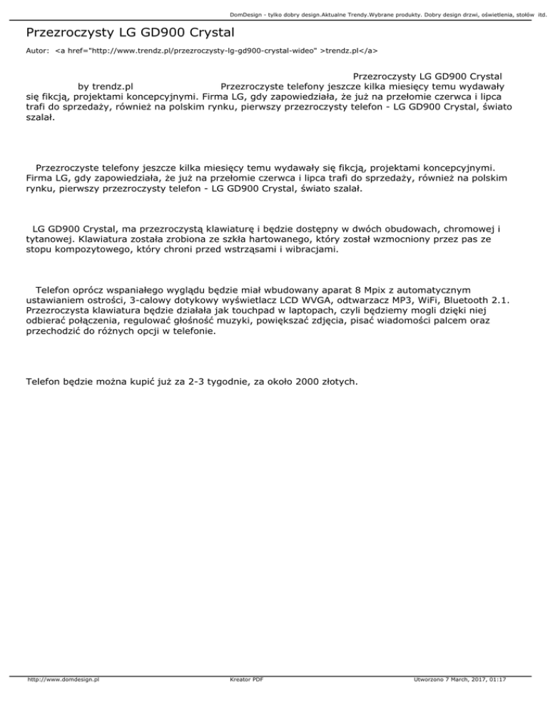 DomDesign - tylko dobry design.Aktualne Trendy.Wybrane produkty. Dobry design drzwi, oświetlenia, stołów itd.. Przezroczysty LG GD900 Crystal Autor: <a href="http://www.trendz.pl/przezroczysty-lg-gd900-crystal-wideo" >trendz.pl</a> Przezroczysty LG GD900 Crystal by trendz.pl Przezroczyste telefony jeszcze kilka miesięcy temu wydawały się fikcją, projektami koncepcyjnymi. Firma LG, gdy zapowiedziała, że już na przełomie czerwca i lipca trafi do sprzedaży, również na polskim rynku, pierwszy przezroczysty telefon - LG GD900 Crystal, świato szalał. Przezroczyste telefony jeszcze kilka miesięcy temu wydawały się fikcją, projektami koncepcyjnymi. Firma LG, gdy zapowiedziała, że już na przełomie czerwca i lipca trafi do sprzedaży, również na polskim rynku, pierwszy przezroczysty telefon - LG GD900 Crystal, świato szalał. LG GD900 Crystal, ma przezroczystą klawiaturę i będzie dostępny w dwóch obudowach, chromowej i tytanowej. Klawiatura została zrobiona ze szkła hartowanego, który został wzmocniony przez pas ze stopu kompozytowego, który chroni przed wstrząsami i wibracjami. Telefon oprócz wspaniałego wyglądu będzie miał wbudowany aparat 8 Mpix z automatycznym ustawianiem ostrości, 3-calowy dotykowy wyświetlacz LCD WVGA, odtwarzacz MP3, WiFi, Bluetooth 2.1. Przezroczysta klawiatura będzie działała jak touchpad w laptopach, czyli będziemy mogli dzięki niej odbierać połączenia, regulować głośność muzyki, powiększać zdjęcia, pisać wiadomości palcem oraz przechodzić do różnych opcji w telefonie. Telefon będzie można kupić już za 2-3 tygodnie, za około 2000 złotych. http://www.domdesign.pl Kreator PDF Utworzono 7 March, 2017, 01:17