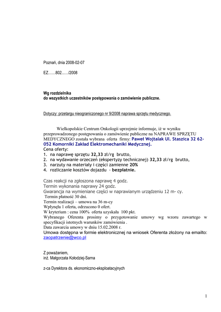 Poznań, dnia 2008-02-07 EZ……802...…/2008 Wg rozdzielnika do wszystkich uczestników postępowania o zamówienie publiczne. Dotyczy: przetargu nieograniczonego nr 9/2008 naprawa sprzętu medycznego. Wielkopolskie Centrum Onkologii uprzejmie informuje, iŜ w wyniku przeprowadzonego postępowania o zamówienie publiczne na NAPRAWE SPRZĘTU MEDYCZNEGO została wybrana oferta firmy: Paweł Wojtalak Ul. Staszica 32 62052 Komorniki Zakład Elektromechaniki Medycznej. Cena oferty: 1. na naprawę sprzętu 32,33 zł/rg brutto, 2. na wydawanie orzeczeń (ekspertyzy technicznej) 32,33 zł/rg brutto, 3. narzuty na materiały i części zamienne 20% 4. rozliczanie kosztów dojazdu - bezpłatnie. Czas reakcji na zgłoszona naprawę 4 godz. Termin wykonania naprawy 24 godz. Gwarancja na wymieniane części w naprawianym urządzeniu 12 m- cy. Termin płatność 30 dni. Termin realizacji – umowa na 36 m-cy Wpłynęła 1 oferta, odrzucono 0 ofert. W kryterium : cena 100% oferta uzyskała 100 pkt. Wybranego Oferenta prosimy o przygotowanie umowy wg wzoru zawartego w specyfikacji istotnych warunków zamówienia . Data zawarcia umowy w dniu 15.02.2008 r. Umowa dostępna w formie elektronicznej na wniosek Oferenta złożony na emailto: [email protected] Z powaŜaniem, inŜ. Małgorzata Kołodziej-Sarna z-ca Dyrektora ds. ekonomiczno-eksploatacyjnych 1
