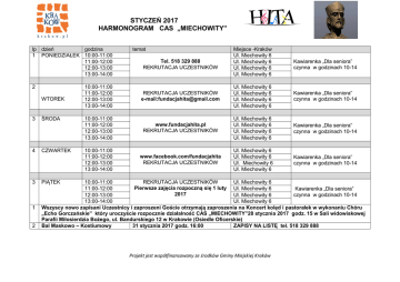 STYCZEŃ 2017 HARMONOGRAM CAS „MIECHOWITY” lp dzień godzina 1 PONIEDZIAŁEK 10:00-11:00 11:00-12:00 12:00-13:00 13:00-14:00 2 WTOREK 3 4 3 1 2 ŚRODA CZWARTEK temat Tel. 518 329 888 REKRUTACJA UCZESTNIKÓW Miejsce -Kraków Ul. Miechowity 6 Ul. Miechowity 6 Ul. Miechowity 6 Ul. Miechowity 6 Kawiarenka „Dla seniora” czynna w godzinach 10-14 Kawiarenka „Dla seniora” czynna w godzinach 10-14 10:00-11:00 11:00-12:00 12:00-13:00 13:00-14:00 REKRUTACJA UCZESTNIKÓW e-mail:[email protected] Ul. Miechowity 6 Ul. Miechowity 6 Ul. Miechowity 6 Ul. Miechowity 6 10:00-11:00 11:00-12:00 12:00-13:00 13:00-14:00 www.fundacjahita.pl REKRUTACJA UCZESTNIKÓW Ul. Miechowity 6 Ul. Miechowity 6 Ul. Miechowity 6 Ul. Miechowity 6 Kawiarenka „Dla seniora” czynna w godzinach 10-14 10:00-11:00 11:00-12:00 12:00-13:00 13:00-14:00 www.facebook.com/fundacjahita REKRUTACJA UCZESTNIKÓW Ul. Miechowity 6 Ul. Miechowity 6 Ul. Miechowity 6 Ul. Miechowity 6 Kawiarenka „Dla seniora” czynna w godzinach 10-14 PIĄTEK 10:00-11:00 REKRUTACJA UCZESTNIKÓW Ul. Miechowity 6 Pierwsze zajęcia rozpoczną się 1 luty Ul. Miechowity 6 11:00-12:00 Kawiarenka „Dla seniora” 2017 czynna w godzinach 10-14 12:00-13:00 Ul. Miechowity 6 13:00-14:00 Ul. Miechowity 6 Wszyscy nowo zapisani Uczestnicy i zaproszeni Goście otrzymają zaproszenia na Koncert kolęd i pastorałek w wykonaniu Chóru „Echo Gorczańskie” który uroczyście rozpocznie działalność CAS „MIECHOWITY”28 stycznia 2017 godz. 15 w Sali widowiskowej Parafii Miłosierdzia Bożego, ul. Bandurskiego 12 w Krakowie (Osiedle Oficerskie) Bal Maskowo – Kostiumowy 31 stycznia 2017 godz. 16:00 ZAPISY NA LISTĘ tel. 518 329 888 Projekt jest współfinansowany ze środków Gminy Miejskiej Kraków