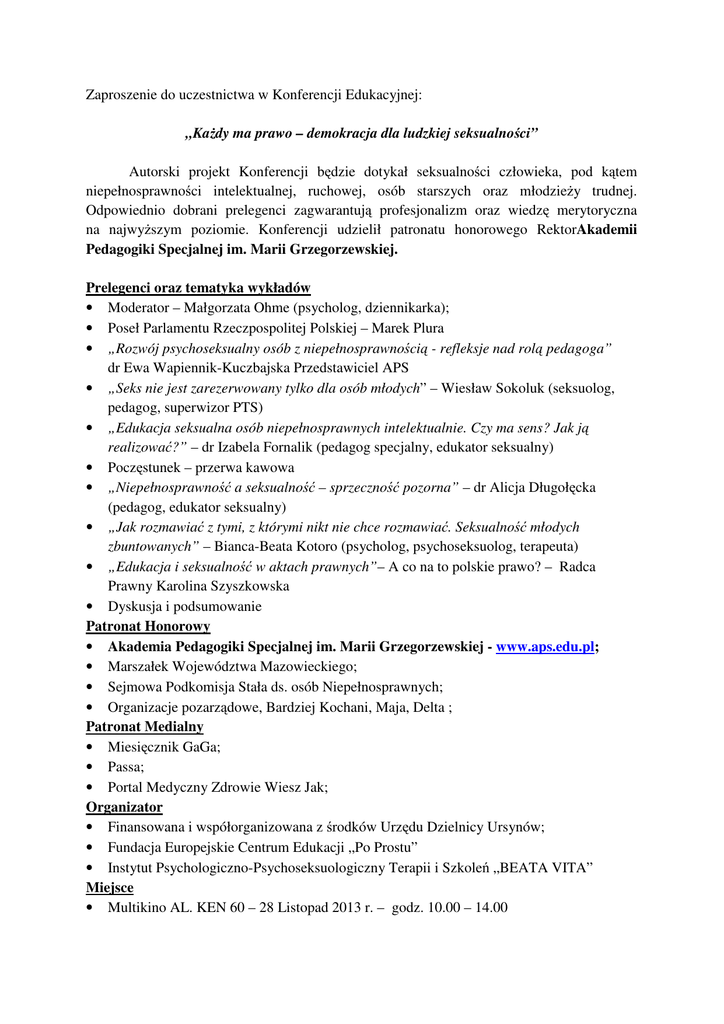 Zaproszenie do uczestnictwa w Konferencji Edukacyjnej: „Każdy ma prawo – demokracja dla ludzkiej seksualności” Autorski projekt Konferencji będzie dotykał seksualności człowieka, pod kątem niepełnosprawności intelektualnej, ruchowej, osób starszych oraz młodzieży trudnej. Odpowiednio dobrani prelegenci zagwarantują profesjonalizm oraz wiedzę merytoryczna na najwyższym poziomie. Konferencji udzielił patronatu honorowego RektorAkademii Pedagogiki Specjalnej im. Marii Grzegorzewskiej. Prelegenci oraz tematyka wykładów • Moderator – Małgorzata Ohme (psycholog, dziennikarka); • Poseł Parlamentu Rzeczpospolitej Polskiej – Marek Plura • „Rozwój psychoseksualny osób z niepełnosprawnością - refleksje nad rolą pedagoga” dr Ewa Wapiennik-Kuczbajska Przedstawiciel APS • „Seks nie jest zarezerwowany tylko dla osób młodych” – Wiesław Sokoluk (seksuolog, pedagog, superwizor PTS) • „Edukacja seksualna osób niepełnosprawnych intelektualnie. Czy ma sens? Jak ją realizować?” – dr Izabela Fornalik (pedagog specjalny, edukator seksualny) • Poczęstunek – przerwa kawowa • „Niepełnosprawność a seksualność – sprzeczność pozorna” – dr Alicja Długołęcka (pedagog, edukator seksualny) • „Jak rozmawiać z tymi, z którymi nikt nie chce rozmawiać. Seksualność młodych zbuntowanych” – Bianca-Beata Kotoro (psycholog, psychoseksuolog, terapeuta) • „Edukacja i seksualność w aktach prawnych”– A co na to polskie prawo? – Radca Prawny Karolina Szyszkowska • Dyskusja i podsumowanie Patronat Honorowy • Akademia Pedagogiki Specjalnej im. Marii Grzegorzewskiej - www.aps.edu.pl; • Marszałek Województwa Mazowieckiego; • Sejmowa Podkomisja Stała ds. osób Niepełnosprawnych; • Organizacje pozarządowe, Bardziej Kochani, Maja, Delta ; Patronat Medialny • Miesięcznik GaGa; • Passa; • Portal Medyczny Zdrowie Wiesz Jak; Organizator • Finansowana i współorganizowana z środków Urzędu Dzielnicy Ursynów; • Fundacja Europejskie Centrum Edukacji „Po Prostu” • Instytut Psychologiczno-Psychoseksuologiczny Terapii i Szkoleń „BEATA VITA” Miejsce • Multikino AL. KEN 60 – 28 Listopad 2013 r. – godz. 10.00 – 14.00 Beneficjenci • Przedstawiciele Organizacji Pozarządowych i Instytucji związanych z tematyką; • Edukatorzy, rodzice i opiekunowie, osoby niepełnosprawne; • Kadra pedagogiczna szkół i przedszkoli; • Kadra akademicka; • Przedstawiciele Urzędów i władz samorządowych; • Studenci, koła studenckie i absolwenci pedagogiki, psychologii oraz medycyny zainteresowani zgłębieniem wiedzy oraz porozmawianiem z prelegentami. Konferencja będzie wspaniałą okazją do nawiązania kontaktów oraz uzupełnienia wiedzy tych wszystkich osób, które są związane z niżej wymienionymi obszarami tematycznymi. WSTĘP WOLNY! Wszystkich informacji udziela oraz zapisy przyjmuje koordynator Konferencji Edukacyjnej - Grzegorz Kotoro, tel. 609 96 77 34, [email protected] ILOŚĆ MIEJSC OGRANICZONA!