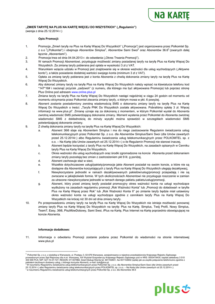„ZMIEŃ TARYFĘ NA PLUS NA KARTĘ WIĘCEJ DO WSZYSTKICH” („Regulamin”) (wersja z dnia 25.12.2014 r.) Opis Promocji: 1. 2. 3. 4. 5. 6. 7. 8. 9. 10. Promocja „Zmień taryfę na Plus na Kartę Więcej Do Wszystkich” („Promocja”) jest organizowana przez Polkomtel Sp. z o.o 1(„Polkomtel”) i obejmuje Abonentów Simplus2, Abonentów Sami Swoi2 oraz Abonentów 36.63 (zwanych dalej łącznie „Abonentami”). Promocja trwa od dnia 04.04.2013 r. do odwołania („Okres Trwania Promocji”). W ramach Promocji Abonentowi, przysługuje możliwość zmiany posiadanej taryfy na taryfę Plus na Kartę Więcej Do Wszystkich. Za zmianę taryfy pobierana jest opłata w wysokości 3 zł z VAT. Warunkiem wzięcia udziału w Promocji jest znajdowanie się w okresie ważności dla usług wychodzących („Aktywne konto”), a także posiadanie dodatniej wartości swojego konta (minimum 3 zł z VAT). Opłata za zmianę taryfy pobierana jest z konta Abonenta z chwilą dokonania zmiany taryfy na taryfę Plus na Kartę Więcej Do Wszystkich. Aby dokonać zmiany taryfy na taryfę Plus na Kartę Więcej Do Wszystkich należy wpisać na klawiaturze telefonu kod *147*16# i nacisnąć przycisk „zadzwoń” (z numeru, dla którego ma być aktywowana Promocja) lub poprzez stronę Plus Online pod adresem www.online.plus.pl Zmiana taryfy na taryfę Plus na Kartę Więcej Do Wszystkich nastąpi najpóźniej w ciągu 24 godzin od momentu od momentu otrzymania przez Polkomtel zlecenia zmiany taryfy, o którym mowa w pkt. 6 powyżej. Abonent zostanie powiadomiony zwrotną wiadomością SMS o dokonaniu zmiany taryfy na taryfę Plus na Kartę Więcej Do Wszystkich o treści: „Taryfa PNK Do Wszystkich została aktywowana. Pobraliśmy opłatę 3 zł. Więcej informacji na www.plus.pl”. Zmianę uznaje się za dokonaną z momentem, w którym Polkomtel wysłał do Abonenta zwrotną wiadomość SMS potwierdzającą dokonanie zmiany. Moment wysłania przez Polkomtel do Abonenta zwrotnej wiadomości SMS z dokładnością do minuty wysyłki można sprawdzić w szczegółach wiadomości SMS potwierdzającej dokonanie zmiany. Z chwilą dokonania zmiany taryfy na taryfę Plus na Kartę Więcej Do Wszystkich: a. Abonent 36i6 staje się Abonentem Simplus i ma do niego zastosowanie Regulamin świadczenia usług telekomunikacyjnych przez Polkomtel Sp. z o.o. dla Abonentów Simplus/Sami Swoi (dla Umów zawartych przed 25.12.2014r.) albo Regulaminu świadczenia usług telekomunikacyjnych przez POLKOMTEL sp. z o.o. – Na Kartę (dla Umów zawartych od 25.12.2014 r.) o ile Regulamin Promocji nie stanowi inaczej, b. Abonent będzie korzystać z taryfy Plus na Kartę Więcej Do Wszystkich, na zasadach opisanych w Cenniku taryfy Plus na Kartę Więcej Do Wszystkich, c. Okres ważności dla usług wychodzących oraz środki zgromadzone na koncie Abonenta przed dokonaniem zmiany taryfy pozostają bez zmian z zastrzeżeniem pkt 9 lit. g poniżej, d. Abonent zachowuje staż w sieci, e. Wszelkie dotychczasowe usługi/pakiety/promocje jakie Abonent posiadał na swoim koncie, a które nie są dostępne dla Abonentów korzystających z taryfy Plus na Kartę Więcej Do Wszystkich ulegają dezaktywacj, f. Niewykorzystane jednostki w ramach dezaktywowanych pakietów/usług/promocji przepadają i nie są zwracane w jakiejkolwiek formie. W tych okolicznościach Abonentowi nie przysługuje roszczenie w zamian za utracone niewykorzystane jednostki w ramach danego pakietu pakietu/usług/promocji, g. Abonent, który przed zmianą taryfy posiadał promocyjny okres ważności konta na usługi wychodzące wydłużony na zasadach regulaminu promocji „Rok Ważności Konta” lub „Promocji do doładowań w taryfie Plus na Kartę Więcej przez Rok” lub „Rok Ważności Konta II” po zmianie taryfy będzie miał ustawiony okres ważności konta na usługi wychodzące zgodnie z cennikiem taryfy Plus na Kartę Więcej Do Wszystkich nie krócej niż 30 dni od dnia zmiany taryfy. Po przeprowadzeniu zmiany taryfy na taryfę Plus na Kartę Więcej Do Wszystkich nie istnieje możliwość ponownej zmiany taryfy Plus na Kartę Więcej Do Wszystkich na taryfę: Plus na Kartę, Simplus, Twój Profil, Nowy Simplus, Team7, Easy, 36i6, PiszMówDobowy, Sami Swoi, iPlus na Kartę, Plus Internet na Kartę poprzednio obowiązującej na koncie Abonenta. Informacje dodatkowe: 11. 1 Informacja o odwołaniu Promocji zostanie podana przez Polkomtel do wiadomości na stronie internetowej www.plus.pl Polkomtel Sp. z o.o. z siedzibą w Warszawie, ul. Postępu 3, 02-676 Warszawa, zarejestrowana w rejestrze przedsiębiorców Krajowego Rejestru Sądowego prowadzonym przez Sąd Rejonowy dla m.st. Warszawy, XIII Wydział Gospodarczy Krajowego Rejestru Sądowego pod nr KRS: 0000419430, kapitał zakładowy 3 510 300 000 PLN, NIP: 527-10-37-727, REGON: 011307968, Dział Obsługi Klienta tel. 601102601, fax 601102602 (opłaty jak za zwykłe połączenie telefoniczne zgodnie z pakietem taryfowym dostawcy usług, z którego korzysta Abonent), e-mail: [email protected]. 2 W rozumieniu Regulaminu świadczenia usług telekomunikacyjnych przez Polkomtel Sp. z o.o. dla Abonentów Simplus/Sami Swoi (dla Umów zawartych przed 25.12.2014 r.) albo Regulaminu świadczenia usług telekomunikacyjnych przez POLKOMTEL sp. z o.o. – Na Kartę (dla Umów zawartych od 25.12.2014 r.). 3 w rozumieniu Regulaminu świadczenia usług telekomunikacyjnych przez Polkomtel Sp. z o.o. dla Abonentów 36.6 12. 13. W kwestiach nieuregulowanych Regulaminem zastosowanie mają postanowienia Regulaminu świadczenia usług telekomunikacyjnych przez Polkomtel Sp. z o.o. dla Abonentów Simplus/Sami Swoi (dla Umów zawartych przed 25.12.2014r.) albo Regulaminu świadczenia usług telekomunikacyjnych przez POLKOMTEL sp. z o.o. – Na Kartę (dla Umów zawartych od 25.12.2014 r.) o ile Regulamin Promocji nie stanowi inaczej. Regulamin dostępny jest na witrynie internetowej pod adresem www.plus.pl oraz w siedzibie 