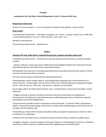 Protokół z posiedzenia XIV sesji Rady Gminy Wielgomłyny z dnia 27 stycznia 2016 roku. Rozpoczęcie obrad sesji: W dniu 27 stycznia o godz. 9 – tej w sali posiedzeń Urzędu Gminy zgodnie z zaproszeniem. Sesje zwołał: Przewodniczący Rady Gminy - Stanisław Łoś zgodnie z art. 20 ust. 1 ustawy z dnia 8 marca 1990 roku o samorządzie gminnym ( tj. Dz.U. z 2015 roku poz. 1515 z późn. zm.) Obradom przewodniczył: Przewodniczący Rady Gminy – Stanisław Łoś. Punkt 1 Otwarcie XIV sesji Rady Gminy, stwierdzenie guorum, przyjęcie porządku obrad sesji. Przewodniczący Rady Gminy - Stanisław Łoś otworzył obrady sesji Radu Gminy, powitał przybyłych na sesje: - radnych, sołtysów, osoby zaproszone: Wójta Gminy Pana Bogdana Witaszczyka, Sekretarza Gminy Panią Bożenę Nowak, Skarbnika Gminy Panią Zofię Stolecką. Na podstawie listy obecności Przewodniczący Rady Gminy stwierdził prawomocność obrad. W chwili otwarcia sesji obecnych było 15 radnych. W trakcie obrad przybyli przedstawiciele telewizji lokalnej NTL. Przewodniczący zwrócił uwagę radnych, że porządek obrad dzisiejszej sesji został dostarczony w dwóch pismach : zasadniczego z dnia 13 stycznia 2016 roku i dodatkowego poszerzającego porządek obrad z dnia 20 stycznia 2016 roku. Oba pisma w załączeniu do protokołu. Do porządku obrad Pan Wójt złożył wniosek wraz z uzasadnieniem o poszerzeniu porządku o punkt dotyczący: - Podjęcia uchwały w sprawie określenia kryteriów rekrutacji stosowanych w postępowaniu rekrutacyjnym do publicznych szkół podstawowych i publicznego gimnazjum, dla których organem prowadzącym jest Gmina Wielgomłyny. Za poszerzeniem porządku obrad o wymieniony wyżej punkt było 15 radnych. Radni jednogłośnie poparli wniosek Przewodniczącego Rady Gminy o umieszczenie dodatkowego punktu jako punkt 18 porządku obrad dzisiejszej sesji. Przewodniczący Rady Gminy odczytał porządek obrad po przyjętych w głosowaniu zmianach, który przedstawia się następująco: 1.Otwarcie XIV sesji Rady Gminy, stwierdzenie prawomocności obrad i przyjęcie porządku obrad. 2.Podjęcie uchwały w sprawie przyjęcia Gminnego Programu Przeciwdziałania Przemocy w Rodzinie oraz Ochrony Ofiar Przemocy w Rodzinie dla Gminy Wielgomłyny na lata 2016-2020. 3.Podjęcie uchwały w sprawie przyjęcia Gminnego Programu Przeciwdziałania Narkomanii na lata 2016-2020. 4.Podjęcie uchwały w sprawie zatwierdzenia Planu Rozwoju Miejscowości Niedośpielin na lata 20162022 przedłożonego przez zebranie wiejskie sołectwa Niedośpielin. 5.Podjęcie uchwały w sprawie zatwierdzenia taryfy za zbiorowe zaopatrzenie w wodę i zbiorowe odprowadzenie ścieków. 6.Podjęcie uchwały w sprawie uchwalenia Wieloletniej Prognozy Finansowej Gminy Wielgomłyny na lata 2016-2026. 7.Podjęcie uchwały w sprawie uchwalenia budżetu Gminy Wielgomłyny na 2016 rok. a) odczytanie projektu uchwały wraz z uzasadnieniem, b) odczytanie opinii Regionalnej Izby Obrachunkowej o projekcie, c) odczytanie opinii Komisji Rozwoju Społeczno-Gospodarczego, Budżetu, Rolnictwa, Ochrony Środowiska. 8.Przyjęcie protokołu z obrad XIII sesji Rady Gminy z dnia 30 grudnia 2015 roku. 9.Informacja Wójta Gminy o realizacji zadań w okresie międzysesyjnym. 10.Interpelacje i wolne wnioski radnych. 11.Podjęcie uchwały w sprawie zmiany Uchwały Nr XXV/16/09 Rady Gminy Wielgomłyny z dnia 15 kwietnia 2009 roku w sprawie regulaminu wynagradzania nauczycieli, zatrudnionych w szkołach prowadzonych przez Gminę Wielgomłyny, określającego wysokość stawek oraz szczegółowe warunki przyznawania nauczycielom, dodatków: za wysługę lat, motywacyjnego, funkcyjnego i za warunki pracy, szczegółowy sposób obliczania wynagrodzenia za godziny ponadwymiarowe i godziny doraźnych zastępstw oraz wysokość nauczycielskiego dodatku mieszkaniowego i szczegółowe zasady jego przyznawania i wypłacania. 12.Podjęcie uchwały w sprawie wystąpienia z wnioskiem do Ministra Administracji i Cyfryzacji za pośrednictwem Wojewody Łódzkiego o utworzenie urzędowej nazwy miejscowości „KOLONIA MYŚLIWCZÓW” wraz z określeniem jej rodzaju jako wieś. 13.Podjęcie uchwały w sprawie wystąpienia z wnioskiem do Ministra Administracji i Cyfryzacji za pośrednictwem Wojewody Łódzkiego o zmianę urzędowej nazwy miejscowości z obecnie obowiązującej „TRZEBCE – PERZYNY” na nazwę „PERZYNY” wraz z określeniem jej jako wieś. 14.Podjęcie uchwały w sprawie zmiany składu osobowego Rady Społecznej Gminnego Ośrodka Zdrowia w Wielgomłynach. 15.Podjęcie uchwały w sprawie przyjęcia ramowego planu pracy Rady Gminy Wielgomłyny na 2016 rok. 16.Podjęcie uchwały w sprawie przyjęcia planu pracy komisji stałych Rady Gminy Wielgomłyny na 2016 rok. 16.Przyjęcie sprawozdań z pracy rady i komisji Rady Gminy. 18. Podjęcia uchwały w sprawie określenia kryteriów rekrutacji stosowanych w postępowaniu rekrutacyjnym do publicznych szkół podstawowych i publicznego gimnazjum, dla których organem prowadzącym jest Gmina Wielgomłyny. 19. Zamknięcie obrad XIV sesji Rady Gminy Wielgomłyny. Odczytany porządek obrad Przewodniczący Rady Gminy poddał pod głosowanie. Głosowanie: W wyniku głosowania jednogłośnie 15 głosami „za” w obecności 15 radnych podczas głosowania został przyjęty porządek obrad dzisiejszej sesji. Zgodnie z § 16 Statutu Gminy Wielgomłyny ( uchwalony Uchwała Nr XXXVIII/53/2014 Rady Gminy Wielgomłyny z dnia 23 lipca 2014 roku opublikowany w Dzienniku Urzędowym Województwa Łódzkiego z dnia 28 listopada 2014 roku poz. 4279, 4280) Przewodniczący Rady Gminy prowadzi obrady zgodnie z ustalonym porządkiem obrad. Punkt 2 Podjęcie uchwały w sprawie przyjęcia Gminnego Programu Przeciwdziałania Przemocy w Rodzinie oraz Ochrony Ofiar Przemocy w Rodzinie dla Gminy Wielgomłyny na lata 2016-2020. Uzasadnienia tej uchwały dokonała Kierownik GOPS Pani Bogumiła Smolarczyk . Potrzeba podejmowania działań zapob
