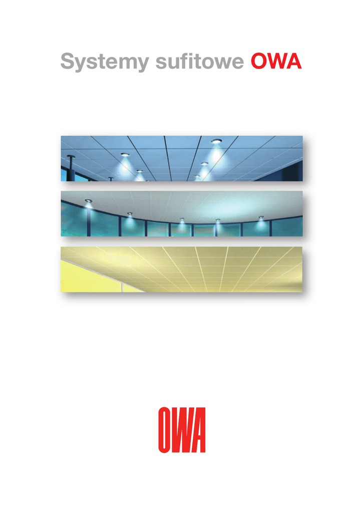 Systemy sufitowe OWA Szukacie Państwo sufitu? Witamy w OWIE. Ten katalog pozwoli Państwu zorientować się w szerokiej ofercie naszych systemów sufitowych – i będzie pomocny w planowaniu i realizacji Państwa pomysłów. Nawet jeśli Państwa projekt będzie bardzo wymagający, zaproponujemy odpowiednie rozwiązanie, bazując na naszych dopracowanych produktach i profesjonalnym serwisie. Oferujemy Państwu godne zaufania materiały, kreatywne wzornictwo, nowoczesną technikę i komponenty, które spełnią szereg dodatkowych funkcji. Dodatkowo proponujemy skorzystanie z możliwości optymalizacji warunków akustycznych, także z wykorzystaniem ścian. Zadaniem naszego katalogu jest pomóc Państwu w realizacji obiektów – od pomysłu do realizacji, w znalezieniu indywidualnych, wysokiej klasy, rozwiązań. Bez względu na to, jakie wymagania stawia Państwa projekt ... ... znajdziecie w naszej ofercie odpowiednie sufity ognioochronne, akustyczne, chłodzące, świecące, sufity do pomieszczeń sterylnych i higienicznych. Wybór systemu Poszczególne elementy pomieszczenia współgrają ze sobą: płyty sufitowe i ściany, elementy konstrukcyjne i specjalne elementy wyposażenia. Dlatego myślimy systemowo – i na systemach opieramy nasze programy: OWAcoustic® Płyty z wełny mineralnej OWAconstruct® Elementy konstrukcyjne OWAspectra® Sufity specjalne OWAtecta® Sufity metalowe Systemy OWA umożliwiają twórcze rozwiązania, oparte na ciekawych wzorach – przy jednoczesnym silnym akcentowaniu współistnienia ekonomii, wysokiej jakości i funkcjonalności. System nawigacyjny na drodze do celu Na początku i końcu katalogu znajduje się kompas – przewodnik po sufitach OWA. Kompas na początku katalogu poprowadzi Państwa od typu pomieszczenia do systemu – kompas na końcu katalogu pełni funkcję przeglądu wszystkich dostępnych systemów i wzorów. Jakie informacje zawiera katalog: Kompas – od typu pomieszczenia do systemu Produkty specjalne Absorbery ścienne................................SO 1.0 Wzory OWAcoustic® premium Creaprint...............................................P Sandila..................................................P Finetta...................................................P OWAplan®............................................P Cosmos................................................P Cosmos plus........................................P AquaCosmos®.....................................P Sternbild...............................................P Futura...................................................P Harmony...............................................P Schlicht/Universal.................................P Luna......................................................P Stukkor.................................................P Regularnie dziurkowane.......................P Nieregularnie dziurkowane...................P Dziurkowanie rozproszone...................P OWAlux®..............................................P Graphite................................................P Molinari.................................................P Długoszczelinowe.................................P Quartett................................................P Moderato/Andante...............................P Forte.....................................................P Mosaic..................................................P Excell 30...............................................P Excell 31, Variation 33, Variation 35......P Menuett................................................P 1.0 2.0 3.0 4.0 5.0 5.1 5.2 6.0 7.0 8.0 9.0 10.0 11.0 12.0 12.1 12.2 13.0 14.0 15.0 16.0 17.0 18.0 19.0 20.0 21.0 21.1 22.0 Wzory OWAcoustic® smart Sandila..................................................S Finetta...................................................S Sternbild...............................................S Harmony...............................................S Futura...................................................S 1.0 2.0 3.0 4.0 5.0 Wzory OWAcoustic® deco Comet...................................................D Sirius.....................................................D Taurus...................................................D Tacla.....................................................D 1.0 2.0 3.0 4.0 Systemy OWAconstruct® Tworzenie sufitów z OWAconstruct......C 1.0 S 7........................................................C 2.0 S 3 / S 15 – S 3a / S 15a.......................C 3.0 S 15b – S 3e.........................................C 4.0 S 9a – S 9b...........................................C 5.0 S 1 / S 1a – S 2a / S 2b........................C 6.0 S 14a – S 14b.......................................C 7.0 S 6 – S 6 radial.................................... C 8.0 S 12d....................................................C 9.0 S 18p/S 18k..........................................C 10.0 S 18d – S 8...........................................C 11.0 OWAconstruct® funkcje OWAconstruct® – Elementy chłodzące.......................... FC OWAconstruct® – Oświetlenie wbudowane standard......FC OWAconstruct® – Inlight.................... FC OWAconstruct® – Downlights............ FC 2.0 3.0 4.0 OWAspectra® OWAspectra® aluline...........................SP OWAspectra® satino............................SP OWAspectra® STAR.............................SP OWAspectra® Carré i Fond..................SP 1.0 2.0 3.0 4.0 OWAtecta® OWAtecta® sufity metalowe................T OWAtecta® rodzaje perforacji.............T OWAtecta® perfora..............................T OWAtecta® systemy S 31/S 32...........T OWAtecta® systemy S 33/S 45/S 36...T OWAtecta® systemy S 39/S 48...........T OWAtecta® systemy S 55/S 60...........T 1.0 2.0 3.0 4.0 5.0 6.0 7.0 1.0 OWAcoustic® funkcje Ochrona ogniowa............................B 1.0-5.0 Akustyka..........................................A 1.0-7.0 OWAcoustic® AirControl......................H OWAcoustic® sa