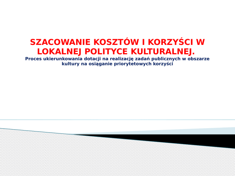 SZACOWANIE KOSZTÓW I KORZYŚCI W LOKALNEJ POLITYCE KULTURALNEJ. Proces ukierunkowania dotacji na realizację zadań publicznych w obszarze kultury na osiąganie priorytetowych korzyści CZY JEST ANALIZA KOSZTY/KORZYŚCI? Analiza koszty/korzyści jest elementem racjonalizacji wydatków publicznych i realizacji zadań publicznych przez podmioty administracji centralnej i samorządowej. Koncentracja na efektach alokacji środków finansowych adresowanych do instytucji a przeznaczonych na konkretne zadania publiczne, jako element nowego zarządzania publicznego, jest współcześnie podnoszona tym częściej, im bardziej odczuwany jest w konkretnych krajach kryzys finansów publicznych. CZYM JEST I CZEMU SŁUŻY ANALIZA KOSZTY/KORZYŚCI? Jak twierdzi Deborah Stone, analiza koszty/korzyści: „polega na zestawieniu negatywnych i pozytywnych konsekwencji działania, aby zobaczyć, czy ostatecznie doprowadzi ono do zysku lub straty. Decyzje podejmuje się według jednego kryterium lub zasady: podejmuj działanie, gdy jego korzyści przewyższają koszty… Jeżeli trzeba wybrać jedno z alternatywnych działań… podejmuj takie działanie, które przynosi największą korzyść netto”. D. Stone, Public Policy Paradox: The Art of Political Decision Making, WW. Norton, New York 2001, s. 235. ANALIZA KOSZTY/KORZYŚCI A REALIZACJA ZADAŃ PUBLICZNYCH Z perspektywy podmiotów finansujących realizację zadań publicznych jest to niezwykle kuszący instrument, który daje szansę na finansowanie efektywnych programów, kierowanie środków do tych podmiotów, które osiągają najlepsze wyniki wskaźnikowe w ramach realizowanych przez nie zadań i wreszcie finansowanie tych przedsięwzięć, które pozostają w zgodzie z celami strategicznymi w ramach konkretnych zadań publicznych. PROBLEMATYCZNOŚĆ ANALIZY KOSZTY/KORZYŚCI W POLITYCE PUBLICZNEJ Problemem jest jednak to, że taka racjonalizacja polityk publicznych i alokacji zasobów finansowych nie jest zadaniem prostym. Po pierwsze, wymaga sprecyzowania oczekiwań, spodziewanych efektów w ramach konkretnych obszarów polityk publicznych oraz w ich ramach konkretnych zadań publicznych. Po drugie, kluczowe jest opracowanie konkretnych, mierzalnych wskaźników pozwalających szacować zakres efektywności w realizacji zadań publicznych przez konkretne podmioty i zakresu korzyści wynikających z realizacji konkretnych programów. Wreszcie po trzecie, potrzeba opracowania systemu diagnozy (zbierania i opracowywania danych) określających efekty i korzyści wynikające z konkretnych alokacji. Naturalnie za bardzo złożony trzeba uznawać proces wykorzystania zgromadzonej wiedzy do modyfikacji realizowanej polityki w ramach danego zadania publicznego (np. biorąc pod uwagę formalne i nieformalne systemy zobowiązań wobec instytucji publicznych i konkretnych niepublicznych). ALE POMIMO TRUDNOŚCI… Należy poszukiwać rozwiązań aby stopniowo rozwijać celowościowo zorientowane działania na rzecz uspójnienia polityki publicznej, poszukiwania optymalnych rozwiązań w realizacji zadań publicznych poprzez wykorzystanie potencjału podmiotów reprezentujących różne sektory, zorientowania na efekty w ramach alokacji pieniędzy, np. w systemie dotacyjnym. UZASADNIENIE SZACOWANIA KOSZTÓW/KORZYŚCI W POLITYCE KULTURALNEJ W polskich warunkach dwie tezy, które na podstawie zrealizowanego projektu możemy kategorycznie postawić a które są istotne dla prób wprowadzania elementów analizy koszty-korzyści w odniesieniu do działalności podmiotów działających w obszarze kultury, to: [1] samorząd terytorialny w małym stopniu prowadzi długofalową analizę kosztów/korzyści prowadzonej polityki (w tym dystrybuowanych zasobów - kryteria alokacji w małym stopniu uwzględniają takie analizy); [2] podmioty pozarządowe korzystające z dotacji publicznych na działalność w obszarze kultury wykazują problemy z określaniem efektów własnej działalności, część ich nie osiąga, część nie potrafi ich określać, część nie potrafi komunikować. Podmioty te wykazują problemy w odczytywaniu oczekiwań samorządu w zakresie obszarów działalności (zapotrzebowanie na ich aktywność) i możliwości realizacji konkretnych zadań publicznych. PROPOZYCJA WSTĘPNYCH KROKÓW DO BUDOWANIA POLITYKI KULTURALNEJ ZORIENTOWANJE NA KOSZTY/KORZYŚCI Ze względu na złożoność przedsięwzięcia, różnych uwarunkowań procesu wprowadzania analizy koszty/korzyści w ramach realizacji konkretnych zadań publicznych, warto koncentrować się na realizacji wstępnej fazy wdrażania tej zasady niezbędnej dla zbierania doświadczeń i dalszego zwiększania zasięgu takich rozważań w procesie porządkowania systemu realizacji zadań publicznych z perspektywy efektów i korzyści a w odniesieniu do ponoszonych wydatków. Jest to niezbędny działanie, stanowiące szansę i dla konkretnych samorządów (monitoring działań dotowanych przez samorząd organizacji pozarządowych działających w obszarze kultury w odniesieniu do zdefiniowanych rezultatów spodziewanych do osiągania w ramach konkretnych zadań publicznych), i dla samych podmiotów pozarządowych (spodziewana modyfikacja własnej aktywności na rzecz osiągania rezultatów określonych przez samorząd dotującą realizację konkretnych zadań, w konsekwencji zwiększenie własnej efektywności ramach realizacji polityk publicznych). CO MOŻEMY SZYBKO POPRAWIĆ? Celność alokacji (dotacji) samorządowych kierowanych do podmiotów pozarządowych realizujących zadania publiczne w obszarze kultury. Możemy spowodować żeby będziemy finansowali te zadania, które traktujemy priorytetowo i promowali te podmioty, które zamierzają wykazać, że ich działalność pozwala realizować najważniejsze cele strategiczne w obszarze kultury. KOLEJNE KROKI W USPÓJNIANIU SAMORZĄDOWYCH ALOKACJI NA KULTURĘ WZORZEC DZIAŁANIA Po każdym kroku będziemy wskazywać wzorcowe działanie podjęte