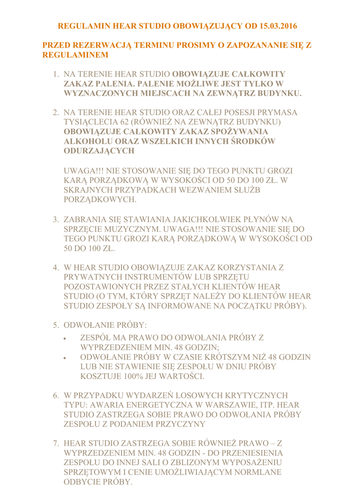 REGULAMIN HEAR STUDIO OBOWIĄZUJĄCY OD 15.03.2016 PRZED REZERWACJĄ TERMINU PROSIMY O ZAPOZANANIE SIĘ Z REGULAMINEM 1. NA TERENIE HEAR STUDIO OBOWIĄZUJE CAŁKOWITY ZAKAZ PALENIA. PALENIE MOŻLIWE JEST TYLKO W WYZNACZONYCH MIEJSCACH NA ZEWNĄTRZ BUDYNKU. 2. NA TERENIE HEAR STUDIO ORAZ CAŁEJ POSESJI PRYMASA TYSIĄCLECIA 62 (RÓWNIEŻ NA ZEWNĄTRZ BUDYNKU) OBOWIĄZUJE CAŁKOWITY ZAKAZ SPOŻYWANIA ALKOHOLU ORAZ WSZELKICH INNYCH ŚRODKÓW ODURZAJĄCYCH UWAGA!!! NIE STOSOWANIE SIĘ DO TEGO PUNKTU GROZI KARĄ PORZĄDKOWĄ W WYSOKOŚCI OD 50 DO 100 ZŁ. W SKRAJNYCH PRZYPADKACH WEZWANIEM SŁUŻB PORZĄDKOWYCH. 3. ZABRANIA SIĘ STAWIANIA JAKICHKOLWIEK PŁYNÓW NA SPRZĘCIE MUZYCZNYM. UWAGA!!! NIE STOSOWANIE SIĘ DO TEGO PUNKTU GROZI KARĄ PORZĄDKOWĄ W WYSOKOŚCI OD 50 DO 100 ZŁ. 4. W HEAR STUDIO OBOWIĄZUJE ZAKAZ KORZYSTANIA Z PRYWATNYCH INSTRUMENTÓW LUB SPRZĘTU POZOSTAWIONYCH PRZEZ STAŁYCH KLIENTÓW HEAR STUDIO (O TYM, KTÓRY SPRZĘT NALEŻY DO KLIENTÓW HEAR STUDIO ZESPOŁY SĄ INFORMOWANE NA POCZĄTKU PRÓBY). 5. ODWOŁANIE PRÓBY: ZESPÓŁ MA PRAWO DO ODWOŁANIA PRÓBY Z WYPRZEDZENIEM MIN. 48 GODZIN; ODWOŁANIE PRÓBY W CZASIE KRÓTSZYM NIŻ 48 GODZIN LUB NIE STAWIENIE SIĘ ZESPOŁU W DNIU PRÓBY KOSZTUJE 100% JEJ WARTOŚCI. 6. W PRZYPADKU WYDARZEŃ LOSOWYCH KRYTYCZNYCH TYPU: AWARIA ENERGETYCZNA W WARSZAWIE, ITP. HEAR STUDIO ZASTRZEGA SOBIE PRAWO DO ODWOŁANIA PRÓBY ZESPOŁU Z PODANIEM PRZYCZYNY 7. HEAR STUDIO ZASTRZEGA SOBIE RÓWNIEŻ PRAWO – Z WYPRZEDZENIEM MIN. 48 GODZIN - DO PRZENIESIENIA ZESPOŁU DO INNEJ SALI O ZBLIZONYM WYPOSAŻENIU SPRZĘTOWYM I CENIE UMOŻLIWIAJĄCYM NORMLANE ODBYCIE PRÓBY. 8. W SKRAJNYCH PRZYPADKACH (NP. USZKODZENIA SPRZĘTU) ZASTRZEGAMY MOŻLIWOŚĆ ZMIANY TERMINU PRÓBY NA INNY - DOGODNY DLA ZESPOŁU LUB PRZENIESIENIE DO INNEJ SALI BEZ ZACHOWANIA 48-GODZINNEGO WYPRZEDZENIA. WSZELKIE INFORMACJE O ZMINACH BĘDĄ WYSYŁANE DO ZESPOŁU Z MOŻLIWIE NAJDŁUŻSZYM WYPRZEDENIEM I SĄ UWARUNKOWANE PRZYCZYNAMI NIEZALEŻNYMI (NP. AWARIE SPRZĘTOWE). 9. WSZELKIE PĘKNIĘCIA BLACH PROSIMY ZGŁASZAĆ PRACOWNIKOM PRZED ROZPOCZĘCIEM PRÓBY. W PRZYPADKU STWIERDZENIA PĘKNIĘCIA PO PRÓBIE BLACHY TYPU „CRASH” WYDAWANEJ PRZED PRÓBĄ WPROWADZONA ZOSTAŁA OPŁATA 50 PLN. 10.WSZYSTKIE POWSTAŁE USZKODZENIA LUB AWARIE NALEŻY ZGŁOSIĆ NATYCHMIASTOWO DO PRACOWNIKÓW HEAR STUDIO. UWAGA!!! JEŚLI NIE WIESZ, JAK KORZYSTAĆ ZE SPRZĘTU ZAPYTAJ. W PRZYPADKU NIEPRAWIDŁOWEGO KORZYSTANIA ZE SPRZĘTU POMIMO PRZEKAZANEGO INSTRUKTAŻU ZASTRZEGAMY MOŻLIWOŚĆ POBRANIA KARY PORZĄDKOWEJ W WYSOKOŚCI OD 50 DO 100 ZŁ. 11.ZA WSZELKIE SZKODY ZAISTNIAŁE W CZASIE PRÓBY (ZNISZCZENIA, ZABRUDZENIA, ZALANIA, ITP.) ODPOWIADA ZESPÓŁ, KTÓRY ZOBOWIĄZANY JEST DO ICH NAPRAWIENIA (WYCZYSZCZENIA) LUB ZWROTU KOSZTÓW PRZYWRÓCENIA STANU PIERWOTNEGO. 12.OSOBY KORZYSTAJĄCE Z SAL PRÓB HEAR STUDIO ZOBOWIĄZANE SĄ DO ZAPOZNANIA SIĘ Z NINIEJSZYM REGULAMINEM ORAZ PRZESTRZEGANIA GO. 13.NIE ZNAJOMOŚĆ POWYŻSZEGO REGULAMINU NIE ZWALNIA KLIENTÓW HEAR STUDIA OD PRZESTRZEGANIA ELEMENTARNYCH ZASAD KULTURY I PORZĄDKU PODPISAŁ RADOSŁAW KORDOWSKI PREZES ZARZĄDU HEAR STUDIO SP. Z O.O.