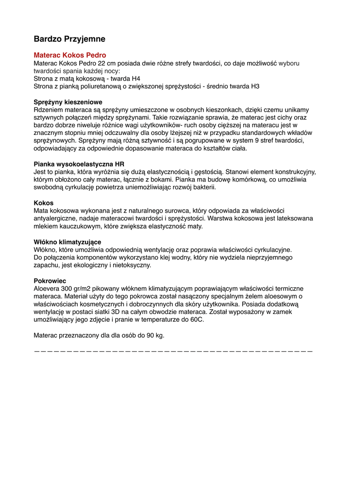 Bardzo Przyjemne Materac Kokos Pedro Materac Kokos Pedro 22 cm posiada dwie różne strefy twardości, co daje możliwość wyboru twardości spania każdej nocy: Strona z matą kokosową - twarda H4 Strona z pianką poliuretanową o zwiększonej sprężystości - średnio twarda H3 Sprężyny kieszeniowe Rdzeniem materaca są sprężyny umieszczone w osobnych kieszonkach, dzięki czemu unikamy sztywnych połączeń między sprężynami. Takie rozwiązanie sprawia, że materac jest cichy oraz bardzo dobrze niweluje różnice wagi użytkowników- ruch osoby cięższej na materacu jest w znacznym stopniu mniej odczuwalny dla osoby lżejszej niż w przypadku standardowych wkładów sprężynowych. Sprężyny mają różną sztywność i są pogrupowane w system 9 stref twardości, odpowiadający za odpowiednie dopasowanie materaca do kształtów ciała. Pianka wysokoelastyczna HR Jest to pianka, która wyróżnia się dużą elastycznością i gęstością. Stanowi element konstrukcyjny, którym obłożono cały materac, łącznie z bokami. Pianka ma budowę komórkową, co umożliwia swobodną cyrkulację powietrza uniemożliwiając rozwój bakterii. Kokos Mata kokosowa wykonana jest z naturalnego surowca, który odpowiada za właściwości antyalergiczne, nadaje materacowi twardości i sprężystości. Warstwa kokosowa jest lateksowana mlekiem kauczukowym, które zwiększa elastyczność maty. Włókno klimatyzujące Włókno, które umożliwia odpowiednią wentylację oraz poprawia właściwości cyrkulacyjne. Do połączenia komponentów wykorzystano klej wodny, który nie wydziela nieprzyjemnego zapachu, jest ekologiczny i nietoksyczny. Pokrowiec Aloevera 300 gr/m2 pikowany włóknem klimatyzującym poprawiającym właściwości termiczne materaca. Materiał użyty do tego pokrowca został nasączony specjalnym żelem aloesowym o właściwościach kosmetycznych i dobroczynnych dla skóry użytkownika. Posiada dodatkową wentylację w postaci siatki 3D na całym obwodzie materaca. Został wyposażony w zamek umożliwiający jego zdjęcie i pranie w temperaturze do 60C. Materac przeznaczony dla dla osób do 90 kg. ———————————————————————————————————————————