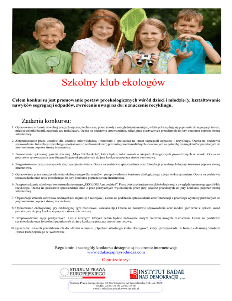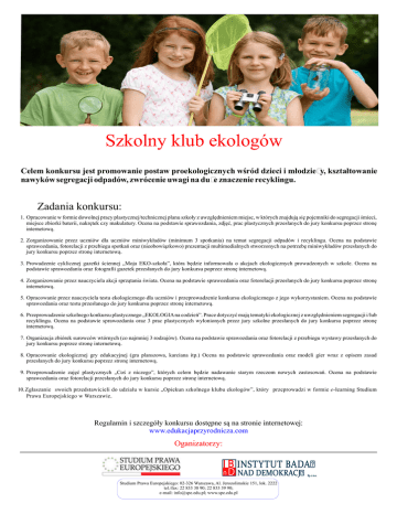 Szkolny klub ekologów Celem konkursu jest promowanie postaw proekologicznych wśród dzieci i młodzieży, kształtowanie nawyków segregacji odpadów, zwrócenie uwagi na duże znaczenie recyklingu. Zadania konkursu: 1. Opracowanie w formie dowolnej pracy plastycznej/technicznej planu szkoły z uwzględnieniem miejsc, w których znajdują się pojemniki do segregacji śmieci, miejsce zbiorki baterii, nakrętek czy makulatury. Ocena na podstawie sprawozdania, zdjęć, prac plastycznych przesłanych do jury konkursu poprzez stronę internetową. 2. Zorganizowanie przez uczniów dla uczniów miniwykładów (minimum 3 spotkania) na temat segregacji odpadów i recyklingu. Ocena na podstawie sprawozdania, fotorelacji z przebiegu spotkań oraz (nieobowiązkowo) prezentacji multimedialnych stworzonych na potrzebę miniwykładów przesłanych do jury konkursu poprzez stronę internetową. 3. Prowadzenie cyklicznej gazetki ściennej „Moja EKO-szkoła”, która będzie informowała o akcjach ekologicznych prowadzonych w szkole. Ocena na podstawie sprawozdania oraz fotografii gazetek przesłanych do jury konkursu poprzez stronę internetową. 4. Zorganizowanie przez nauczyciela akcji sprzątania świata. Ocena na podstawie sprawozdania oraz fotorelacji przesłanych do jury konkursu poprzez stronę internetową. 5. Opracowanie przez nauczyciela testu ekologicznego dla uczniów i przeprowadzenie konkursu ekologicznego z jego wykorzystaniem. Ocena na podstawie sprawozdania oraz testu przesłanego do jury konkursu poprzez stronę internetową. 6. Przeprowadzenie szkolnego konkursu plastycznego „EKOLOGIA na codzień”. Prace dotyczyć mają tematyki ekologicznej z uwzględnieniem segregacji i/lub recyklingu. Ocena na podstawie sprawozdania oraz 3 prac plastycznych wyłonionych przez jury szkolne przesłanych do jury konkursu poprzez stronę internetową. 7. Organizacja zbiórek surowców wtórnych (co najmniej 3 rodzajów). Ocena na podstawie sprawozdania oraz fotorelacji z przebiegu wystawy przesłanych do jury konkursu poprzez stronę internetową. 8. Opracowanie ekologicznej gry edukacyjnej (gra planszowa, karciana itp.) Ocena na podstawie sprawozdania oraz modeli gier wraz z opisem zasad przesłanych do jury konkursu poprzez stronę internetową. 9. Przeprowadzenie zajęć plastycznych „Coś z niczego”, których celem będzie nadawanie starym rzeczom nowych zastosowań. Ocena na podstawie sprawozdania oraz fotorelacji przesłanych do jury konkursu poprzez stronę internetową. 10. Zgłaszanie swoich przedstawicieli do udziału w kursie „Opiekun szkolnego klubu ekologów”, który przeprowadzi w formie e-learning Studium Prawa Europejskiego w Warszawie. Regulamin i szczegóły konkursu dostępne są na stronie internetowej: www.edukacjaprzyrodnicza.com Oganizatorzy: IB INSTYTUT BADAŃ n D NAD DEMOKRACJĄ Studium Prawa Europejskiego: 02-326 Warszawa, Al. Jerozolimskie 151, lok. 2222 tel./fax: 22 833 38 90; 22 833 39 90; e-mail: [email protected]; www.spe.edu.pl Sp. z o.o.