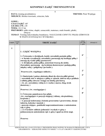 KONSPEKT ZAJĘĆ TRENINGOWYCH 1 DATA: trening przykładowy MIEJSCE: Boisko trawiaste, sztuczne, hala TRENER: Piotr Wojdyga GODZ.: CZAS ZAJĘĆ: 60’ LICZBA ĆW.: 20 WIEK: 10-13 lat PRZYBORY: piłki różne, słupki, oznaczniki, materace, małe bramki, płotki, obręcze TEMAT: Trening indywidualny bramkarzy. NAUCZANIE CHWYTU PIŁEK GÓRNYCH W POZYCJI STOJĄCEJ I WYSKOKU. CZĘŚĆ CZAS CZ. TREŚĆ ZAJĘĆ CZAS ĆW.,ZB, L. pow. UWAGI !!! I I . CZĘŚĆ WSTĘPNA 1. Ćwiczenia w dwójkach, każdy zawodnik posiada piłkę - w formie rywalizacji, zawodnicy poruszają się kozłując piłkę i starają się wybić piłkę partnerowi - w dwójkach, jedna piłka, ustawieni twarzą do siebie. Zawodnicy poruszają się krokiem dostawnym i podają piłkę między sobą ( półgórną i po koźle ). Przerwa (ćw. regulujące oddech ). 2. Omówienie i pokaz ułożenia dłoni do chwytu piłki górnej - zawodnik stoi w miejscu z piłką w rękach, uderza nią o podłoże i odbitą piłkę chwyta i ściąga na klatkę piersiową - ćw. jw. zawodnicy robią to w ruchu ( marsz, bieg, krok dostawny ) Przerwa ( ćw. rozciągające ) 3. Ćwiczymy pojedynczo bez piłęk. -ćw. rozciągające w pozycji stojącej ( skłony, skrętoskłony, krążenia ) - w pozycji izolowanej ( leżenia przerzutne i przewrotne, skręty tułowia, kołyska i mostek ) - pozycja stojąca , podskoki naprzemianstronne z uniesieniem rąk w górę - z 2-3 kroków odbicie jednonóż i wyskok w górę z jednoczesnym uniesieniem rąk w górę i opad na dwie nogi. Przerwa 6’ , 2’ 5’ 2’ 8’ 3’ SZKOLENIE DLA NAUCZYCIELI I TRENERÓW PIŁKI NOŻNEJ W RAMACH PROGRAMU UEFA GRASSROOTS – SZKOLENIE DZIECI W WIEKU 7-13 LAT CHŁOPCY I DZIEWCZYNKI KONSPEKT ZAJĘĆ TRENINGOWYCH 2 II II. CZĘŚĆ GŁÓWNA 1.Pokaz i opis chwytu piłki w pozycji stojącej - stojąc zawodnik podrzuca piłkę w górę i chwyta z góry ściągając piłkę na klatkę piersiową ( 10 x ) - ćw. przy ścianie, zawodnik rzuca o ścianę piłkę i chwyta oburącz z góry, ściąga piłkę na klatkę piersiową ( 8 x ) - to samo ćw. uderzamy piłkę kozłem o ścianę ( 8 x ) - w dwójkach, współćwiczący dorzuca piłkę, partner chwyta ją ( 6 x każdy ) - jw. współćwiczący dorzuca piłkę kozłem ( 6 x każdy ) 12’ 3’ Przerwa (ćw. rozluźniające ) III 2. Te same ćw. stosujemy w nauczaniu chwytu piłki górnej w wyskoku. Najpierw w miejscu, potem z odbicia po rozbiegu. Chwyt z rozbiegu zaczynamy od wyskoku z 2-3 kroków, lekkiego biegu. Ilość powtórzeń w każdym ćw. 3-4 razy. 12’ Przerwa 3’ 3. Ćw. doskonalące chwyt piłki górnej w bramce. - ustawienie na środku bramki, startując z różnych pozycji wyjściowych chwyt piłki w wyskoku dorzucanej przez partnera ( siad prosty, leżenie przodem, tyłem, bokiem, 4 x każdy ) - ustawienie na środku bramki, krok dostawny do słupka, powrót i chwyt piłki w wyskoku dorzuconej przez współćwiczącego ( 4 x każdy ) 6’ Przerwa 2’ III. CZĘŚĆ KOŃCOWA 1.Rozbieganie, ćw. rozluźniające i omówienie treningu. 10’ SZKOLENIE DLA NAUCZYCIELI I TRENERÓW PIŁKI NOŻNEJ W RAMACH PROGRAMU UEFA GRASSROOTS – SZKOLENIE DZIECI W WIEKU 7-13 LAT CHŁOPCY I DZIEWCZYNKI KONSPEKT ZAJĘĆ TRENINGOWYCH SZKOLENIE DLA NAUCZYCIELI I TRENERÓW PIŁKI NOŻNEJ W RAMACH PROGRAMU UEFA GRASSROOTS – SZKOLENIE DZIECI W WIEKU 7-13 LAT CHŁOPCY I DZIEWCZYNKI KONSPEKT ZAJĘĆ TRENINGOWYCH SZKOLENIE DLA NAUCZYCIELI I TRENERÓW PIŁKI NOŻNEJ W RAMACH PROGRAMU UEFA GRASSROOTS – SZKOLENIE DZIECI W WIEKU 7-13 LAT CHŁOPCY I DZIEWCZYNKI