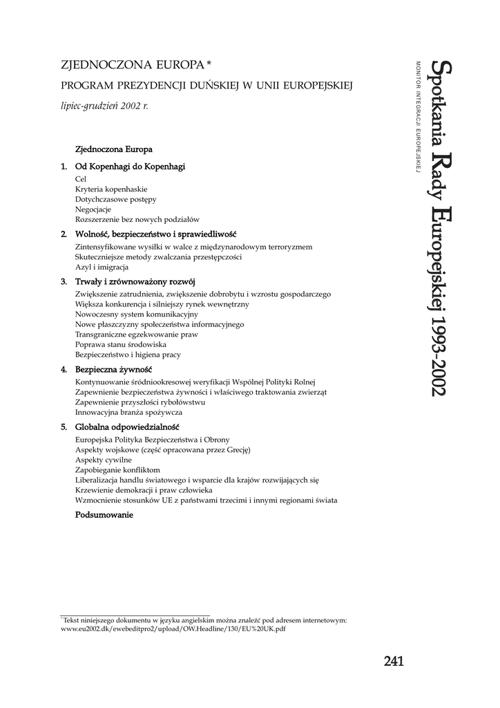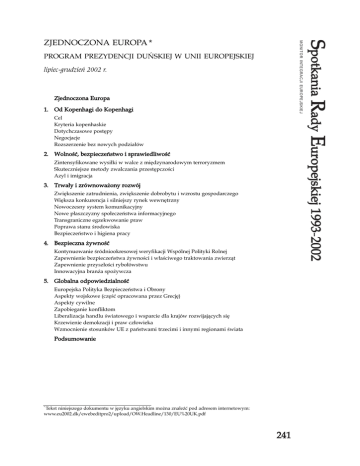 PROGRAM PREZYDENCJI DUŃSKIEJ W UNII EUROPEJSKIEJ lipiec-grudzień 2002 r. Zjednoczona Europa 1. Od Kopenhagi do Kopenhagi Cel Kryteria kopenhaskie Dotychczasowe postępy Negocjacje Rozszerzenie bez nowych podziałów 2. Wolność, bezpieczeństwo i sprawiedliwość Zintensyfikowane wysiłki w walce z międzynarodowym terroryzmem Skuteczniejsze metody zwalczania przestępczości Azyl i imigracja 3. Trwały i zrównoważony rozwój Zwiększenie zatrudnienia, zwiększenie dobrobytu i wzrostu gospodarczego Większa konkurencja i silniejszy rynek wewnętrzny Nowoczesny system komunikacyjny Nowe płaszczyzny społeczeństwa informacyjnego Transgraniczne egzekwowanie praw Poprawa stanu środowiska Bezpieczeństwo i higiena pracy 4. Bezpieczna żywność Kontynuowanie śródniookresowej weryfikacji Wspólnej Polityki Rolnej Zapewnienie bezpieczeństwa żywności i właściwego traktowania zwierząt Zapewnienie przyszłości rybołówstwu Innowacyjna branża spożywcza 5. Globalna odpowiedzialność Europejska Polityka Bezpieczeństwa i Obrony Aspekty wojskowe (część opracowana przez Grecję) Aspekty cywilne Zapobieganie konfliktom Liberalizacja handlu światowego i wsparcie dla krajów rozwijających się Krzewienie demokracji i praw człowieka Wzmocnienie stosunków UE z państwami trzecimi i innymi regionami świata Podsumowanie * Tekst niniejszego dokumentu w języku angielskim można znaleźć pod adresem internetowym: www.eu2002.dk/ewebeditpro2/upload/OW.Headline/130/EU%20UK.pdf 241 Spotkania Rady Europejskiej 1993-22002 MONITOR INTEGRACJI EUROPEJSKIEJ ZJEDNOCZONA EUROPA * ZJEDNOCZONA EUROPA Podstawowym priorytetem duńskiej Prezydencji jest zakończenie negocjacji akcesyjnych z grupą liczącą do dziesięciu państw kandydujących. To właśnie w Kopenhadze w 1993 r. określono warunki przystąpienia nowych państw członkowskich do Unii Europejskiej. I tu także mogą zostać zakończone w 2002 r. negocjacje akcesyjne. Pomyślne zakończenie negocjacji akcesyjnych przyczyni się do stworzenia Europy zjednoczonej, bez podziałów. Duńska Prezydencja nada także rangę priorytetową innym ważnym sprawom ujętym w programie UE. Unia Europejska musi się wykazać osiągnięciami w wielu ważnych dziedzinach, w których problemy najlepiej rozwiązuje się wspólnie. Ponadto Unia musi wypełnić swe globalne zobowiązania i przyczynić się do znalezienia wspólnych rozwiązań międzynarodowych problemów. Zatem najważniejsze zagadnienia duńskiej Prezydencji to: • • • • Od Kopenhagi do Kopenhagi Wolność, bezpieczeństwo i sprawiedliwość Trwały i zrównoważony rozwój Bezpieczna żywność • Globalna odpowiedzialność Od Kopenhagi do Kopenhagi Ponad czterdzieści lat rządów komunistycznych w Europie Środkowej i Wschodniej narzuciło kontynentowi sztuczny podział. Obalenie muru berlińskiego stworzyło możliwość jego zjednoczenia. Obecnie nadszedł czas wykorzystania tej możliwości i dotrzymania obietnic, które sobie wzajemnie łożyliśmy w Europie. Prezydencja duńska będzie dążyć do zakończenia negocjacji akcesyjnych z grupą liczącą do dziesięciu państw do końca 2002 r. Umożliwi to im uzyskanie statusu państw członkowskich UE w 2004 r. Ponadto należy poczynić postępy w negocjacjach z tymi krajami, które będą gotowe do członkostwa w terminie późniejszym, a także umocnić stosunki z nowymi i starymi sąsiadami UE. Zakończenie negocjacji akcesyjnych nie jest zadaniem, któremu podoła sama Prezydencja duńska. Jest to ogromne wyzwanie, wymagające od wszystkich zainteresowanych stron znacznego wysiłku oraz dążenia do kompromisów. Powinniśmy wszyscy być świadomi historycznej wagi rozszerzenia i dostosować do niej nasze postępowanie. Rozszerzenie Unii Europejskiej nie jest darem od Zachodu dla Wschodu. Leży ono w interesie całej Europy. Razem możemy budować przyszłość opierającą się na bezpieczeństwie i stabilności. Razem możemy zapewnić sukces i dobrobyt gospodarczy, przynoszące korzyści wszystkim Europejczykom. Na rozszerzeniu Unii skorzysta każdy obywatel Europy. Wolność, bezpieczeństwo i sprawiedliwość Każdy ma prawo do wolności, bezpieczeństwa i sprawiedliwości w życiu codziennym. Dlatego wspólnie musimy przeciwdziałać poczuciu zagrożenia związanemu z przekraczającą 242 Silna i konkurencyjna gospodarka europejska jest warunkiem trwałego wzrostu [gospodarczego], dobrej koniunktury i dobrobytu w naszych krajach. Rozwój musi przy tym przebiegać w sposób trwały i zrównoważony, o ile chcemy zachować i poprawić stan środowiska, od którego w tak dużej mierze zależymy. Są to najważniejsze zadania dla wszystkich rządów w Europie; wymagają one także znacznych, zbiorowych wysiłków w obrębie UE. Obecnie, gdy już istnieje euro, musimy zebrać owoce jego wprowadzenia do obiegu. Musimy się skoncentrować na dążeniach poszczególnych krajów do stworzenia miejsc pracy dla większej liczby obywateli oraz zapewnić trwałe podstawy gospodarcze, unikając jednocześnie szkodliwej konkurencji podatkowej i uchylania się od płacenia podatków, tak abyśmy byli w stanie sfinansować system opieki społecznej, zwłaszcza w kontekście starzenia się społeczeństwa. Musimy wzmocnić konkurencję i zapewnić możliwość dokonywania indywidualnego, wolnego wyboru między liberalizacją a spójnym wdrażaniem zasad rynku wewnętrznego. Dobry stan środowiska naturalnego i dobrze prosperująca gospodarka są wzajemnie od siebie zależne. Musimy więc przekształcić cel trwałego i zrównoważonego rozwoju w praktyczne rezultaty zarówno w obrębie UE, jak i w skali całego świata. Bezpieczna żywność Wiele wydarzeń, do których doszło w ostatnich latach, dobitnie ukazało potrzebę zapewnienia zdrowej i bezpiecznej żywności. Jako konsumenci musimy mieć pewność, że artykuły spożywcze kupowane przez nas w sklepach spełniają najwyższe standardy. Wspólne problemy wymagają ws