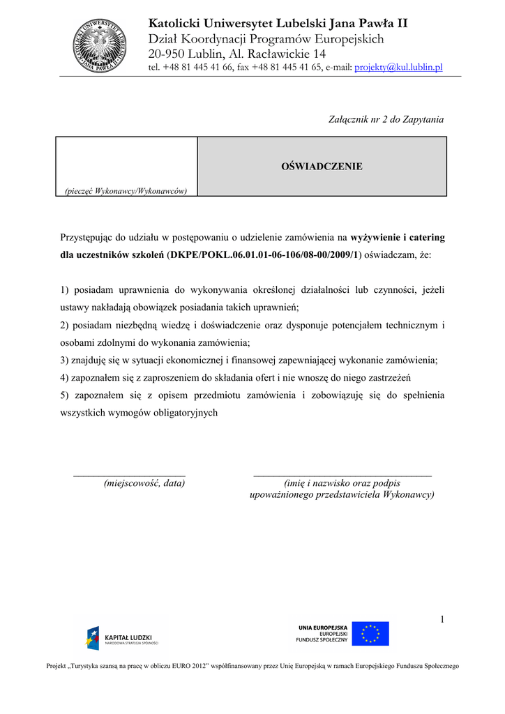 Katolicki Uniwersytet Lubelski Jana Pawła II Dział Koordynacji Programów Europejskich 20-950 Lublin, Al. Racławickie 14 tel. +48 81 445 41 66, fax +48 81 445 41 65, e-mail: [email protected] Załącznik nr 2 do Zapytania OŚWIADCZENIE (pieczęć Wykonawcy/Wykonawców) Przystępując do udziału w postępowaniu o udzielenie zamówienia na wyżywienie i catering dla uczestników szkoleń (DKPE/POKL.06.01.01-06-106/08-00/2009/1) oświadczam, że: 1) posiadam uprawnienia do wykonywania określonej działalności lub czynności, jeżeli ustawy nakładają obowiązek posiadania takich uprawnień; 2) posiadam niezbędną wiedzę i doświadczenie oraz dysponuje potencjałem technicznym i osobami zdolnymi do wykonania zamówienia; 3) znajduję się w sytuacji ekonomicznej i finansowej zapewniającej wykonanie zamówienia; 4) zapoznałem się z zaproszeniem do składania ofert i nie wnoszę do niego zastrzeżeń 5) zapoznałem się z opisem przedmiotu zamówienia i zobowiązuję się do spełnienia wszystkich wymogów obligatoryjnych ______________________ (miejscowość, data) ___________________________________ (imię i nazwisko oraz podpis upoważnionego przedstawiciela Wykonawcy) 1 Projekt „Turystyka szansą na pracę w obliczu EURO 2012” współfinansowany przez Unię Europejską w ramach Europejskiego Funduszu Społecznego Załącznik nr 3 do Zapytania OFERTA (pieczęć Wykonawcy/Wykonawców) Nazwa i adres Wykonawcy: ____________________________________________________ ____________________________________________________ Tel.___________________ Fax:____________________ REGON: _________________ Do: nazwa i siedziba Zamawiającego: Katolicki Uniwersytet Lubelski Jana Pawła II Al. Racławickie 14, 20-950 Lublin Przystępując do prowadzonego przez Katolicki Uniwersytet Lubelski Jana Pawła II postępowania o udzielenie zamówienia nr DKPE/POKL.06.01.01-06-106/08-00/2009/1 na zakup usługi wyżywienia i cateringu dla uczestników szkoleń oferujemy wykonanie przedmiotu zamówienia za cenę: CENA brutto za 1 osobodzień (czyli jednostkowa kwota wyżywienia dziennego 1 osoby obejmująca obiad i dwie przerwy kawowe) w kwocie _________________ zł brutto /słownie __________________________________________________________________ / w tym ________% VAT, tj. ________________________ zł VAT /słownie ___________________________________________________________________ / Ponadto informuję, że jednostkowe ceny wglądają następująco: CENA brutto za 1 obiad w kwocie _________________ zł brutto 2 Projekt „Turystyka szansą na pracę w obliczu EURO 2012” współfinansowany przez Unię Europejską w ramach Europejskiego Funduszu Społecznego /słownie __________________________________________________________________ / w tym ________% VAT, tj. ________________________ zł VAT /słownie ___________________________________________________________________ / CENA brutto za dzienną usługę serwisu kawowego na 1 osobę w kwocie _________________ zł brutto /słownie __________________________________________________________________ / w tym ________% VAT, tj. ________________________ zł VAT /słownie ___________________________________________________________________ / Propozycje zestawów obiadowych (składników) oraz przerwy kawowej są następujące: Obiad Gramatura Barek kawowy Gramatura Oferta wraz z załącznikami została złożona na ______ stronach. Adres Wykonawcy, na który należy przesyłać ewentualną korespondencję: ____________________________________________________________ ____________________________________________________________ Tel. _________________________ fax. ___________________________ Osoba uprawniona do kontaktów z Zamawiającym: _________________________________________________________ 3 Projekt „Turystyka szansą na pracę w obliczu EURO 2012” współfinansowany przez Unię Europejską w ramach Europejskiego Funduszu Społecznego Załącznikami do niniejszej oferty są: 1) _______________________________________________________ 2) _______________________________________________________ 3) _______________________________________________________ 4) _______________________________________________________ 5) _______________________________________________________ 6) _______________________________________________________ 7) _______________________________________________________ ______________________ (miejscowość, data) ___________________________________ (imię i nazwisko oraz podpis upoważnionego przedstawiciela Wykonawcy) 4 Projekt „Turystyka szansą na pracę w obliczu EURO 2012” współfinansowany przez Unię Europejską w ramach Europejskiego Funduszu Społecznego