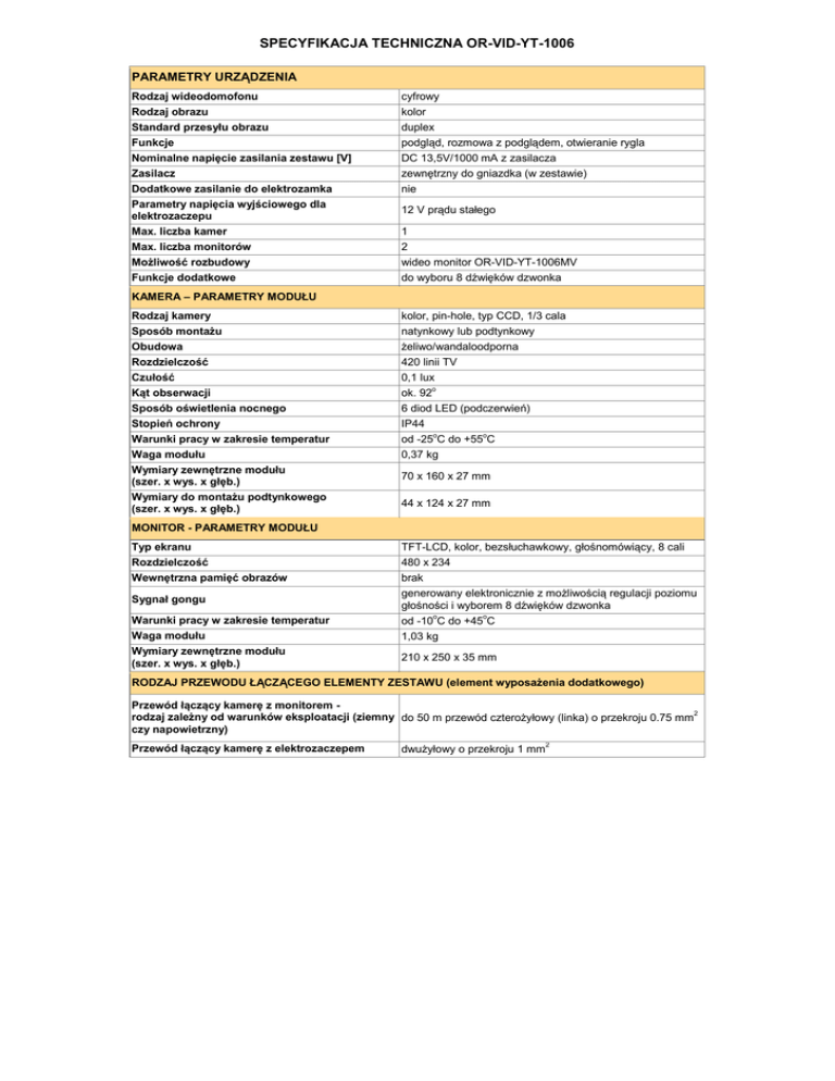 SPECYFIKACJA TECHNICZNA OR-VID-YT-1006 PARAMETRY URZĄDZENIA Rodzaj wideodomofonu Rodzaj obrazu Standard przesyłu obrazu Funkcje Nominalne napięcie zasilania zestawu [V] Zasilacz Dodatkowe zasilanie do elektrozamka Parametry napięcia wyjściowego dla elektrozaczepu Max. liczba kamer Max. liczba monitorów Możliwość rozbudowy Funkcje dodatkowe cyfrowy kolor duplex podgląd, rozmowa z podglądem, otwieranie rygla DC 13,5V/1000 mA z zasilacza zewnętrzny do gniazdka (w zestawie) nie 12 V prądu stałego 1 2 wideo monitor OR-VID-YT-1006MV do wyboru 8 dźwięków dzwonka KAMERA – PARAMETRY MODUŁU Rodzaj kamery Sposób montażu Obudowa Rozdzielczość Czułość Kąt obserwacji Sposób oświetlenia nocnego Stopień ochrony Warunki pracy w zakresie temperatur Waga modułu Wymiary zewnętrzne modułu (szer. x wys. x głęb.) Wymiary do montażu podtynkowego (szer. x wys. x głęb.) kolor, pin-hole, typ CCD, 1/3 cala natynkowy lub podtynkowy żeliwo/wandaloodporna 420 linii TV 0,1 lux ok. 92o 6 diod LED (podczerwień) IP44 od -25oC do +55oC 0,37 kg 70 x 160 x 27 mm 44 x 124 x 27 mm MONITOR - PARAMETRY MODUŁU Typ ekranu Rozdzielczość Wewnętrzna pamięć obrazów Sygnał gongu Warunki pracy w zakresie temperatur Waga modułu Wymiary zewnętrzne modułu (szer. x wys. x głęb.) TFT-LCD, kolor, bezsłuchawkowy, głośnomówiący, 8 cali 480 x 234 brak generowany elektronicznie z możliwością regulacji poziomu głośności i wyborem 8 dźwięków dzwonka od -10oC do +45oC 1,03 kg 210 x 250 x 35 mm RODZAJ PRZEWODU ŁĄCZĄCEGO ELEMENTY ZESTAWU (element wyposażenia dodatkowego) Przewód łączący kamerę z monitorem rodzaj zależny od warunków eksploatacji (ziemny do 50 m przewód czterożyłowy (linka) o przekroju 0.75 mm2 czy napowietrzny) Przewód łączący kamerę z elektrozaczepem dwużyłowy o przekroju 1 mm2