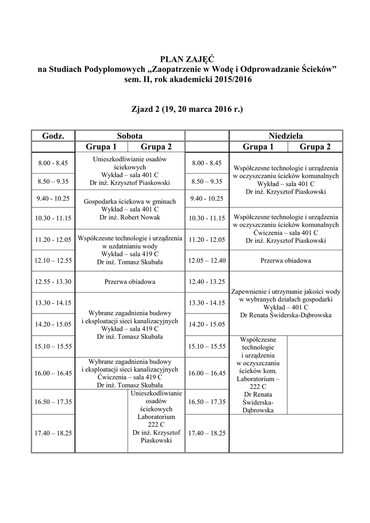 PLAN ZAJĘĆ na Studiach Podyplomowych „Zaopatrzenie w Wodę i Odprowadzanie Ścieków” sem. II, rok akademicki 2015/2016 Zjazd 2 (19, 20 marca 2016 r.) Godz. 8.00 - 8.45 8.50 – 9.35 9.40 - 10.25 10.30 - 11.15 Sobota Grupa 1 Grupa 2 Unieszkodliwianie osadów ściekowych Wykład – sala 401 C Dr inż. Krzysztof Piaskowski Gospodarka ściekowa w gminach Wykład – sala 401 C Dr inż. Robert Nowak Niedziela Grupa 1 Grupa 2 8.00 - 8.45 8.50 – 9.35 9.40 - 10.25 10.30 - 11.15 11.20 - 12.05 Współczesne technologie i urządzenia 11.20 - 12.05 w uzdatnianiu wody Wykład – sala 419 C 12.10 – 12.55 12.05 – 12.40 Dr inż. Tomasz Skubała 12.55 - 13.30 Przerwa obiadowa 13.30 - 14.15 14.20 - 15.05 15.10 – 15.55 16.00 – 16.45 16.50 – 17.35 17.40 – 18.25 Wybrane zagadnienia budowy i eksploatacji sieci kanalizacyjnych Wykład – sala 419 C Dr inż. Tomasz Skubała Współczesne technologie i urządzenia w oczyszczaniu ścieków komunalnych Wykład – sala 401 C Dr inż. Krzysztof Piaskowski Współczesne technologie i urządzenia w oczyszczaniu ścieków komunalnych Ćwiczenia – sala 401 C Dr inż. Krzysztof Piaskowski Przerwa obiadowa 12.40 - 13.25 Zapewnienie i utrzymanie jakości wody w wybranych działach gospodarki 13.30 - 14.15 Wykład – 401 C Dr Renata Świderska-Dąbrowska 14.20 - 15.05 15.10 – 15.55 Wybrane zagadnienia budowy i eksploatacji sieci kanalizacyjnych 16.00 – 16.45 Ćwiczenia – sala 419 C Dr inż. Tomasz Skubała Unieszkodliwianie osadów 16.50 – 17.35 ściekowych Laboratorium 222 C Dr inż. Krzysztof 17.40 – 18.25 Piaskowski Współczesne technologie i urządzenia w oczyszczaniu ścieków kom. Laboratorium – 222 C Dr Renata ŚwiderskaDąbrowska