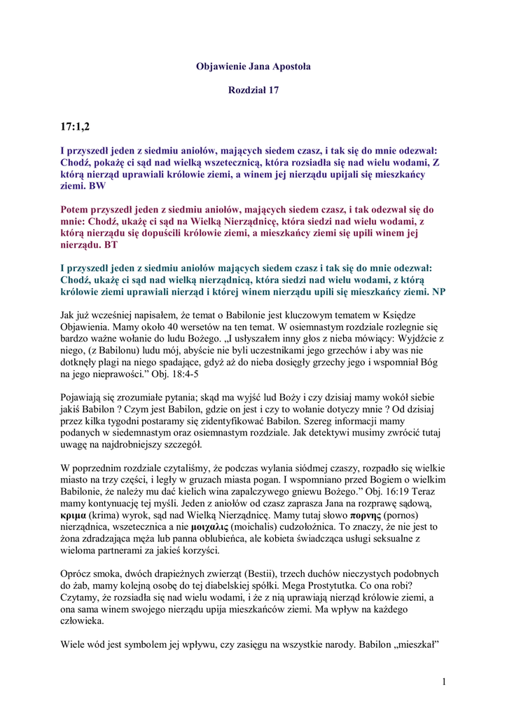 Objawienie Jana Apostoła Rozdział 17 17:1,2 I przyszedł jeden z siedmiu aniołów, mających siedem czasz, i tak się do mnie odezwał: Chodź, pokażę ci sąd nad wielką wszetecznicą, która rozsiadła się nad wielu wodami, Z którą nierząd uprawiali królowie ziemi, a winem jej nierządu upijali się mieszkańcy ziemi. BW Potem przyszedł jeden z siedmiu aniołów, mających siedem czasz, i tak odezwał się do mnie: Chodź, ukażę ci sąd na Wielką Nierządnicę, która siedzi nad wielu wodami, z którą nierządu się dopuścili królowie ziemi, a mieszkańcy ziemi się upili winem jej nierządu. BT I przyszedł jeden z siedmiu aniołów mających siedem czasz i tak się do mnie odezwał: Chodź, ukażę ci sąd nad wielką nierządnicą, która siedzi nad wielu wodami, z którą królowie ziemi uprawiali nierząd i której winem nierządu upili się mieszkańcy ziemi. NP Jak już wcześniej napisałem, że temat o Babilonie jest kluczowym tematem w Księdze Objawienia. Mamy około 40 wersetów na ten temat. W osiemnastym rozdziale rozlegnie się bardzo ważne wołanie do ludu Bożego. „I usłyszałem inny głos z nieba mówiący: Wyjdźcie z niego, (z Babilonu) ludu mój, abyście nie byli uczestnikami jego grzechów i aby was nie dotknęły plagi na niego spadające, gdyż aż do nieba dosięgły grzechy jego i wspomniał Bóg na jego nieprawości.” Obj. 18:4-5 Pojawiają się zrozumiałe pytania; skąd ma wyjść lud Boży i czy dzisiaj mamy wokół siebie jakiś Babilon ? Czym jest Babilon, gdzie on jest i czy to wołanie dotyczy mnie ? Od dzisiaj przez kilka tygodni postaramy się zidentyfikować Babilon. Szereg informacji mamy podanych w siedemnastym oraz osiemnastym rozdziale. Jak detektywi musimy zwrócić tutaj uwagę na najdrobniejszy szczegół. W poprzednim rozdziale czytaliśmy, że podczas wylania siódmej czaszy, rozpadło się wielkie miasto na trzy części, i legły w gruzach miasta pogan. I wspomniano przed Bogiem o wielkim Babilonie, że należy mu dać kielich wina zapalczywego gniewu Bożego.” Obj. 16:19 Teraz mamy kontynuację tej myśli. Jeden z aniołów od czasz zaprasza Jana na rozprawę sądową, κριμα (krima) wyrok, sąd nad Wielką Nierządnicę. Mamy tutaj słowo πορνης (pornos) nierządnica, wszetecznica a nie μοιχαλις (moichalis) cudzołożnica. To znaczy, że nie jest to żona zdradzająca męża lub panna oblubieńca, ale kobieta świadcząca usługi seksualne z wieloma partnerami za jakieś korzyści. Oprócz smoka, dwóch drapieżnych zwierząt (Bestii), trzech duchów nieczystych podobnych do żab, mamy kolejną osobę do tej diabelskiej spółki. Mega Prostytutka. Co ona robi? Czytamy, że rozsiadła się nad wielu wodami, i że z nią uprawiają nierząd królowie ziemi, a ona sama winem swojego nierządu upija mieszkańców ziemi. Ma wpływ na każdego człowieka. Wiele wód jest symbolem jej wpływu, czy zasięgu na wszystkie narody. Babilon „mieszkał” 1 nad wielką wodą, ale Wielka Wszetecznica mieszka nad wieloma wodami. „Podnieście sztandar przeciwko murom Babilonu, wzmocnijcie straż, postawcie warty, wystawcie czaty, bo jak umyślił Pan, tak spełnia to, co powiedział o mieszkańcach Babilonu! Ty, co mieszkasz nad wielką wodą i jesteś bogaty w skarby, nadszedł twój kres; nić twojego żywota przecięta.” Jer. 51:12-13 W piętnastym wierszu siedemnastego rozdziału mamy wyraźnie napisane, że wody to tłumy, narody; „I mówi do mnie: Wody, które widziałeś, nad którymi rozsiadła się wszetecznica, to ludy i tłumy, i narody, i języki.” Obj. 17:15 Podobną myśl spotykamy w Psalmie 65:8 „Uśmierzasz szum morza, Szum fal jego i wzburzenie narodów;” oraz u proroka Izajasza 17:12-13 „Biada! Wrzawa licznych ludów! Burzą się, jak burzy się morze. Szum narodów! Szumią jak szum gwałtownych wód, Narody szumią, jak szumią wielkie wody, lecz gdy On je zgromi, uciekają daleko i zostają uniesione przez wiatr jak plewa na górach, jak tuman kurzu przez huragan.” Dalej pewne interesujące podobieństwo widzimy u proroka Nahuma, który tak pisze o Niniwie. (Niniwa i Babilon mają wspólny rodowód - 1 Moj. 10:8-11). „Biada krwawemu miastu! Wszystko w nim jest oszustwem, pełno w nim łupu, nie ma końca grabieży. (...) Z powodu wielkiej rozpusty nierządnicy, powabnej, uroczej, czarownej, oszałamiającej narody swoim nagim ciałem, a ludy swoimi czarami, Oto Ja wystąpię przeciwko tobie - mówi Pan Zastępów - podniosę poły twoich szat na twoją twarz i pokażę ludom twoją nagość, a królestwom twoją sromotę.” Nah. 3:1,4-5 Wszeteczeństwo w Starym Testamencie jest symbolem niewierności Bogu. Dlatego pójdę tokiem powiązań apokaliptycznej Wielkiej Wszetecznicy z systemem religijnym. „I nie będą już zarzynali swoich zwierząt na rzeźną ofiarę dla demonów, z którymi popełniają cudzołóstwo. Będzie to dla nich ustawą wieczną dla ich pokoleń.” 3 Moj. 17:7 „Jakąż nierządnicą stało się to miasto wierne, niegdyś pełne praworządności, sprawiedliwość w nim mieszkała, a teraz mordercy!” Izaj. 1:21 „Synu człowieczy! Oznajmij Jeruzalemowi jego obrzydliwości, (...) A twoja sława z powodu twojej piękności rozeszła się wśród narodów, Była bowiem doskonała dzięki mojej ozdobie, którą włożyłem na ciebie - mówi Wszechmocny Pan. Ale zaufałaś swojej piękności i pewna swojego sławnego imienia uprawiałaś nierząd, i hojnie darzyłaś sobą każdego przechodnia i oddawałaś mu się. Brałaś swoje szaty i robiłaś sobie z nich pstre namioty na wzgórzach, i uprawiałaś na nich nierząd - czego dotąd nie było i czego nie będzie. A ty, nabrawszy wspaniałych swoich klejnotów z mojego złota i srebra, które ci dałem, robiłaś sobie podobizny bożków i z nimi uprawiałaś nierząd. Brałaś także swoje haftowane szaty i przyodziewałaś się nimi, i stawiałaś moją oliwę i moje kadzidło przed nimi, (