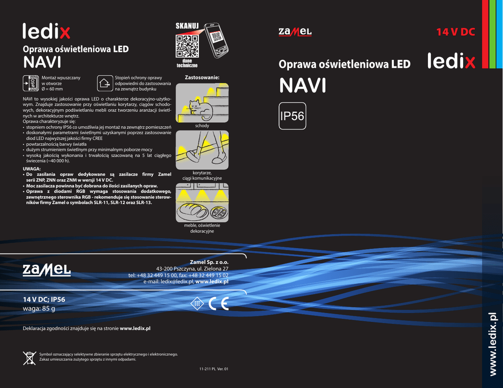 SKANUJ 14 V DC Oprawa oświetleniowa LED NAVI Montaż wpuszczany w otworze Ø = 60 mm Oprawa oświetleniowa LED dane techniczne Stopień ochrony oprawy odpowiedni do zastosowania na zewnątrz budynku NAVI to wysokiej jakości oprawa LED o charakterze dekoracyjno-użytkowym. Znajduje zastosowanie przy oświetlaniu korytarzy, ciągów schodowych, dekoracyjnym podświetlaniu mebli oraz tworzeniu aranżacji świetlnych w architekturze wnętrz. Oprawa charakteryzuje się: • stopniem ochrony IP56 co umożliwia jej montaż na zewnątrz pomieszczeń • doskonałymi parametrami świetlnymi uzyskanymi poprzez zastosowanie diod LED najwyższej jakości firmy CREE • powtarzalnością barwy światła • dużym strumieniem świetlnym przy minimalnym poborze mocy • wysoką jakością wykonania i trwałością szacowaną na 5 lat ciągłego świecenia (~40 000 h). UWAGA: • Do zasilania opraw dedykowane są zasilacze firmy Zamel serii ZNP, ZNN oraz ZNM w wersji 14 V DC. • Moc zasilacza powinna być dobrana do ilości zasilanych opraw. • Oprawa z diodami RGB wymaga stosowania dodatkowego, zewnętrznego sterownika RGB - rekomenduje się stosowanie sterowników firmy Zamel o symbolach SLR-11, SLR-12 oraz SLR-13. Zastosowanie: NAVI schody korytarze, ciągi komunikacyjne meble, oświetlenie dekoracyjne 14 V DC; IP56 waga: 85 g Deklaracja zgodności znajduje się na stronie www.ledix.pl Symbol oznaczający selektywne zbieranie sprzętu elektrycznego i elektronicznego. Zakaz umieszczania zużytego sprzętu z innymi odpadami. 11-211 PL Ver. 01 www.ledix.pl Zamel Sp. z o.o. 43-200 Pszczyna, ul. Zielona 27 tel: +48 32 449 15 00, fax: +48 32 449 15 02 e-mail: [email protected], www.ledix.pl 230 V AC 14 V DC Zasilacz serii ZNP, ZNN lub ZNM w wersji 14 V DC 230 V AC Rekomendowany zasilacz ZNP-02-14 Stopień ochrony odpowiedni do stosowania na zewnątrz budynków Źródło światła - cztery diody LED Schemat 2. Każda oprawa zasilana oddzielnie. Moc zasilacza dobrana do mocy pojedynczej oprawy. Oprawa współpracuje z ogniwami fotowoltaicznymi Wbudowany układ stabilizujący prąd diod Oprawa NAVI – diody RGB 230 V AC 4 14 V DC czerwony zielony niebieski biały Sterownik R G B + czerwony zielony niebieski biały Schemat 3. Każda oprawa połączona z osobnym sterownikiem RGB. Możliwość podłączenia do typowej instalacji 2-przewodowej. Moc zasilacza dobrana do sumarycznej mocy opraw i sterowników Sterownik R G B + czerwony zielony niebieski biały Sterownik R G B + 230 V AC 14 V DC 14 V DC MONTAŻ Oprawa NAVI przeznaczona jest do montażu w otworze lub puszce instalacyjnej Ø60. UWAGA! Podłączenie zasilacza do sieci jednofazowej należy wykonać zgodnie z obowiązującymi normami. Czynności związane z instalacją, podłączeniem i regulacją powinny być wykonane przez wykwalifikowanych elektryków, którzy zapoznali się z instrukcją obsługi i funkcjami urządzenia. 1. Rozłączyć obwód zasilania bezpiecznikiem, wyłącznikiem nadmiarowoprądowym lub rozłącznikiem izolacyjnym przyłączonymi do odpowiedniego obwodu. 2. Sprawdzić odpowiednim przyrządem stan beznapięciowy na przewodach zasilających. 3. Podłączyć zasilacz 14 V DC do instalacji 230 V AC. 4. Odpowiednio połączyć przewody wyjściowe zasilacza z przewodami oprawy z zachowaniem właściwej polaryzacji (przewód czerwony oprawy oznacza „+” zasilania). 5. W przypadku oprawy z diodami RGB przewody wyjściowe zasilacza należy podłączyć do odpowiednich zacisków sterownika RGB. Przewody od oprawy RGB z zachowaniem odpowiedniej kolejności należy połączyć ze sterownikiem RGB. 6. Zamontować oprawę w otworze lub puszce instalacyjnej Ø60. 7. Załączyć obwód zasilania. 8. Sprawdzić prawidłowość działania. 14 V DC czerwony zielony niebieski biały Współczynnik oddawania barw Ra Temperatura barwowa TC [K] Strumień świetlny Ø [lm] Skuteczność świetlna [lm/W] Oprawa NAVI – diody jednokolorowe Schemat 1. Oprawy połączone równolegle. Moc zasilacza odpowiednio dobrana do ilości opraw. czerwony zielony niebieski biały Pobór mocy PRZYKŁADY INSTALACJI 14 V DC 0,56 W –barwa biała zimna 0,42 W –barwa biała ciepła 0,28 W –barwa czerwona 0,28 W –barwa zielona 0,28 W –barwa niebieska 0,84 W –oprawa z diodami RGB barwa biała zimna barwa biała ciepła 71 80 5900 3100 37 24 66 57 czerwony zielony niebieski biały PARAMETRY TECHNICZNE Zasilanie 14 V DC Schemat 4. Oprawy dołączone do centralnego sterownika RGB. Wymagane prowadzenie instalacji 4-przewodowej. Moc zasilacza dobrana do sumarycznej mocy opraw i sterownika RGB Sterownik R G B + 6 UWAGI • Do zasilania opraw należy stosować zasilacze 14 V DC z oferty Zamel (seria ZNP, ZNN, ZNM). • Moc zasilacza należy dobrać do ilości zasilanych opraw oraz sposobu instalacji. • Źródło światła w oprawach jest niewymienne – w przypadku uszkodzenia należy wymienić całą oprawę. • W przypadku opraw o standardowych barwach światła przewód czerwony oznacza „+” zasilania. • Oprawy z diodami RGB wymagają zastosowania dodatkowego zewnętrznego sterownika RGB. • Można stosować jeden centralny sterownik RGB na kilka opraw (instalacja 4 – przewodowa) lub osobny sterownik na każdą oprawę (instalacja 2 – przewodowa). • Jako sterowniki RGB rekomenduje się stosowanie sterowników firmy Zamel o symbolach SLR-11, SLR-12, SLR13. • Producent nie ponosi odpowiedzialności za uszkodzenia spowodowane nieprawidłowym montażem i stosowaniem wyrobu.