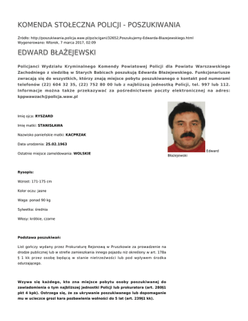 KOMENDA STOŁECZNA POLICJI - POSZUKIWANIA Źródło: http://poszukiwania.policja.waw.pl/pz/scigani/32652,Poszukujemy-Edwarda-Blazejewskiego.html Wygenerowano: Wtorek, 7 marca 2017, 02:09 EDWARD BŁAŻEJEWSKI Policjanci Wydziału Kryminalnego Komendy Powiatowej Policji dla Powiatu Warszawskiego Zachodniego z siedzibą w Starych Babicach poszukują Edwarda Błażejewskiego. Funkcjonariusze zwracają się do wszystkich, którzy znają miejsce pobytu poszukiwanego o kontakt pod numerami telefonów (22) 604 32 35, (22) 752 80 00 lub z najbliższą jednostką Policji, tel. 997 lub 112. Informacje można także przekazywać za pośrednictwem poczty elektronicznej na adres: [email protected] Imię ojca: RYSZARD Imię matki: STANISŁAWA Nazwisko panieńskie matki: KACPRZAK Data urodzenia: 25.02.1963 Ostatnie miejsce zameldowania: WOLSKIE Rysopis: Wzrost: 171-175 cm Kolor oczu: jasne Waga: ponad 90 kg Sylwetka: średnia Włosy: krótkie, czarne Podstawa poszukiwań: List gończy wydany przez Prokuraturę Rejonową w Pruszkowie za prowadzenie na drodze publicznej lub w strefie zamieszkania innego pojazdu niż określony w art. 178a § 1 kk przez osobę będącą w stanie nietrzeźwości lub pod wpływem środka odurzającego. Wzywa się każdego, kto zna miejsce pobytu osoby poszukiwanej do zawiadomienia o tym najbliższej jednostki Policji lub prokuratora (art. 280§1 pkt 4 kpk). Ostrzega się, że za ukrywanie poszukiwanego lub dopomaganie mu w ucieczce grozi kara pozbawienia wolności do 5 lat (art. 239§1 kk). Edward Błażejewski Funkcjonariusze zwracają się do wszystkich, którzy znają miejsce pobytu poszukiwanego o kontakt pod numerami telefonów (22) 604 32 35 oraz całodobowo (22) 752 80 00 lub z najbliższą jednostką Policji, tel. 997 lub 112. Informacje można także przekazywać za pośrednictwem poczty elektronicznej na adres: [email protected] /ego/ Ocena: 0/5 (0) Tweetnij