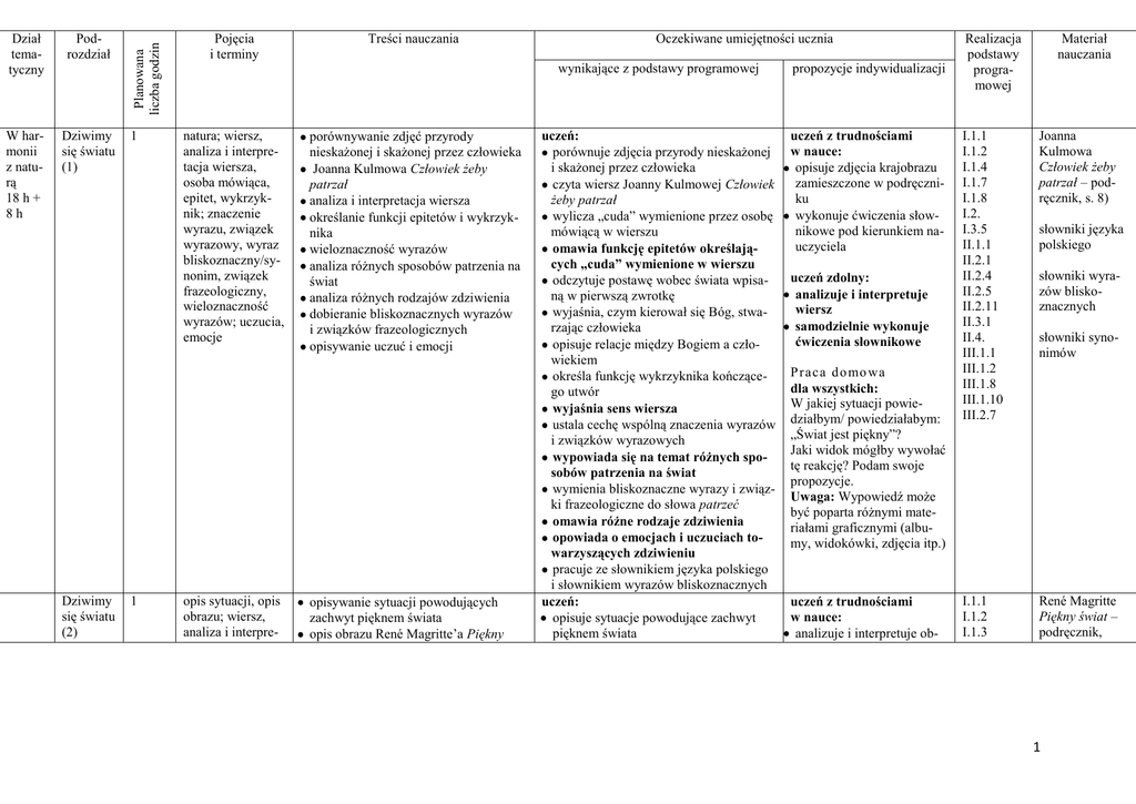 Podrozdział W harmonii z naturą 18 h + 8h Dziwimy się światu (1) Dziwimy się światu (2) Planowana liczba godzin Dział tematyczny 1 1 Pojęcia i terminy natura; wiersz, analiza i interpretacja wiersza, osoba mówiąca, epitet, wykrzyknik; znaczenie wyrazu, związek wyrazowy, wyraz bliskoznaczny/synonim, związek frazeologiczny, wieloznaczność wyrazów; uczucia, emocje opis sytuacji, opis obrazu; wiersz, analiza i interpre- Treści nauczania porównywanie zdjęć przyrody nieskażonej i skażonej przez człowieka Joanna Kulmowa Człowiek żeby patrzał analiza i interpretacja wiersza określanie funkcji epitetów i wykrzyknika wieloznaczność wyrazów analiza różnych sposobów patrzenia na świat analiza różnych rodzajów zdziwienia dobieranie bliskoznacznych wyrazów i związków frazeologicznych opisywanie uczuć i emocji opisywanie sytuacji powodujących zachwyt pięknem świata opis obrazu René Magritte’a Piękny Oczekiwane umiejętności ucznia wynikające z podstawy programowej propozycje indywidualizacji uczeń: porównuje zdjęcia przyrody nieskażonej i skażonej przez człowieka czyta wiersz Joanny Kulmowej Człowiek żeby patrzał wylicza „cuda” wymienione przez osobę mówiącą w wierszu omawia funkcję epitetów określających „cuda” wymienione w wierszu odczytuje postawę wobec świata wpisaną w pierwszą zwrotkę wyjaśnia, czym kierował się Bóg, stwarzając człowieka opisuje relacje między Bogiem a człowiekiem określa funkcję wykrzyknika kończącego utwór wyjaśnia sens wiersza ustala cechę wspólną znaczenia wyrazów i związków wyrazowych wypowiada się na temat różnych sposobów patrzenia na świat wymienia bliskoznaczne wyrazy i związki frazeologiczne do słowa patrzeć omawia różne rodzaje zdziwienia opowiada o emocjach i uczuciach towarzyszących zdziwieniu pracuje ze słownikiem języka polskiego i słownikiem wyrazów bliskoznacznych uczeń: opisuje sytuacje powodujące zachwyt pięknem świata uczeń z trudnościami w nauce: opisuje zdjęcia krajobrazu zamieszczone w podręczniku wykonuje ćwiczenia słownikowe pod kierunkiem nauczyciela uczeń zdolny: analizuje i interpretuje wiersz samodzielnie wykonuje ćwiczenia słownikowe P raca d o mo wa dla wszystkich: W jakiej sytuacji powiedziałbym/ powiedziałabym: „Świat jest piękny”? Jaki widok mógłby wywołać tę reakcję? Podam swoje propozycje. Uwaga: Wypowiedź może być poparta różnymi materiałami graficznymi (albumy, widokówki, zdjęcia itp.) uczeń z trudnościami w nauce: analizuje i interpretuje ob- Materiał nauczania Realizacja podstawy programowej I.1.1 I.1.2 I.1.4 I.1.7 I.1.8 I.2. I.3.5 II.1.1 II.2.1 II.2.4 II.2.5 II.2.11 II.3.1 II.4. III.1.1 III.1.2 III.1.8 III.1.10 III.2.7 Joanna Kulmowa Człowiek żeby patrzał – podręcznik, s. 8) I.1.1 I.1.2 I.1.3 René Magritte Piękny świat – podręcznik, słowniki języka polskiego słowniki wyrazów bliskoznacznych słowniki synonimów 1 tacja wiersza, odbiorca, podmiot mówiący, porównanie, kontrast; zaimek, przysłówek Dziwimy się światu (3) 1 analiza tekstu literackiego, bohaterowie, temat, emocje, uczucia; Ziemia; opis krajobrazu świat opinie na temat dzieła sztuki Jan Twardowski mrówko ważko biedronko analiza i interpretacja wiersza refleksje na temat przyrody, człowieka i życia cechy i właściwości zwierząt wymienionych w wierszu charakterystyka odbiorcy/odbiorców wiersza charakterystyka osoby mówiącej rola kontrastu zastosowanego w wierszu rola zaimka i przysłówka postawa poety wobec świata i miejsca człowieka w świecie Jostein Gaarder Tajemnicza planeta (fragment książki Przepowiednia Dżokera) czytanie i analiza tekstu literackiego okoliczności, przebieg, temat rozmowy ojca z synem nazywanie uczuć i emocji bohatera tekstu opis Ziemi z punktu widzenia bohatera opisuje obraz René Magritte’a Piękny świat wylicza skojarzenia, jakie wywołuje obraz przedstawia i uzasadnia swoją opinię na temat dzieła sztuki czyta wiersz Jana Twardowskiego mrówko ważko biedronko przedstawia zainspirowane wierszem refleksje na temat przyrody, człowieka i życia wymienia cechy i właściwości zwierząt wymienionych w wierszu charakteryzuje odbiorcę/odbiorców wiersza charakteryzuje osobę mówiącą: wskazuje porównanie i wyjaśnia jego sens, wyjaśnia słów: „tak duży, że nic nie rozumiem”, odczytuje sens postawy wyrażonej słowami: „uklęknąć / i nie zadrzeć nosa do góry” omawia rolę kontrastu zastosowanego w wierszu omawia rolę zaimka i przysłówka zastosowanych w ostatnich dwóch wersach wiersza na podstawie wiersza omawia postawę poety wobec świata i miejsca człowieka w świecie uczeń: czyta i analizuje tekst opowiada, w jakich okolicznościach ojciec Hansa Thomasa rozmawia z synem analizuje rozmowę ojca z synem i wymienia poruszane w niej tematy opisuje Ziemię z punktu widzenia ojca nazywa uczucia i emocje Hansa Thomasa w czasie rozmowy z ojcem raz i wiersz, korzystając z pytań pomocniczych nauczyciela uczeń zdolny: interpretuje obraz i wiersz dzieli się refleksjami na temat obrazu i wiersza P raca d o mo wa dla chętnych: Przygotuję prezentację multimedialną na temat św. Franciszka z Asyżu. uczeń z trudnościami w nauce: bierze udział w dyskusji na temat opinii, że własna planeta nie budzi naszego zdziwienia z pomocą nauczyciela redaguje opis krajobrazu I.1.7 I.1.8 I.2. I.3.3 II.1.1 II.1.2 II.1.3 II.2.1 II.2.2 II.2.4 II.2.5 II.2.11 II.3.1 II.4. III.1.1 III.1.2 III.1.8 III.1.9 III.1.10 III.2.7 s. 10 I.1.1 I.1.2 I.1.3 I.1.6 I.1.7 I.1.8 I.1.9 II.1.1 II.1.2 Jostein Gaarder Tajemnicza planeta (fragment książki Przepowiednia Dżokera) – podręcznik, s. 12– 15 Jan Twardowski mrówko ważko biedronko – podręcznik, s. 10–11 2 tekstu opis Ziemi z własnego punktu widzenia redagowanie opisu krajobrazu Tak łatwo zniszczyć (1) Tak łatwo zniszczyć (2) 1 2 wiersz, analiza i interpretacja wiersza, środki stylistyczne, funkcja śro
