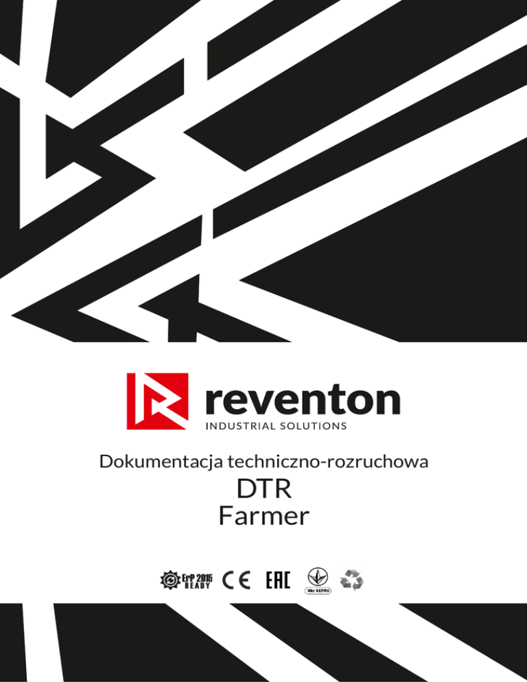 Dokumentacja techniczno-rozruchowa DTR Farmer PL DOKUMENTACJA TECHNICZNA Spis treści 1. WSTĘP 1.1 ŚRODKI OSTROŻNOŚCI 1.2 TRANSPORT 1.3 ZAWARTOŚĆ OPAKOWANIA 1.4 ZASTOSOWANIE I OPIS DZIAŁANIA NAGRZEWNIC WODNYCH 2. SCHEMATY IDEOWE 2.1 BUDOWA URZĄDZENIA 3. OPIS NOWOCZESNEJ TECHNOLOGII POWLEKANIA LCE 3.1 KORZYŚCI POWLEKANIA LCE 3.2 CERTYFIKATY 4. WYMIARY 5. DANE TECHNICZNE 6. MONTAŻ 7. WSKAZÓWKI INSTALACYJNE 8. OSTRZEŻENIA I ŚRODKI OSTROŻNOŚCI 9. AUTOMATYKA 10. SCHEMATY PODŁĄCZENIOWE 11. WARUNKI GWARANCJI 11.1 KARTA GWARANCYJNA 11.2 FORMULARZ REKLAMACYJNY 11.3.KARTA SERWISOWA 1. WSTĘP Dziękujemy za zakup nagrzewnicy wodnej marki Reventon Group i gratulujemy trafnego wyboru. 1.1 ŚRODKI OSTROŻNOŚCI Nabywca i użytkownik nagrzewnicy marki Reventon Group powinien dokładnie przeczytać niniejszą instrukcję i zastosować się do zawartych w niej zaleceń. Postępowanie zgodne z instrukcją gwarantuje prawidłowe użytkowanie i bezpieczeństwo obsługi nagrzewnicy. W razie pojawienia się wątpliwości dotyczących treści instrukcji, należy kontaktować się bezpośrednio z producentem. Producent zastrzega sobie prawo do wprowadzenia zmian w dowolnym czasie w dokumentacji technicznej bez wcześniejszego powiadomienia. Producent nie ponosi odpowiedzialności za szkody wynikłe z niewłaściwego zainstalowania urządzenia, nie utrzymywania go we właściwym stanie technicznym oraz użytkowania niezgodnego z jego przeznaczeniem. Instalacja powinna być przeprowadzona przez wykwalifikowany personel posiadający uprawnienia wymagane do instalowania tego typu urządzeń. Na instalatorze spoczywa obowiązek wykonania instalacji zgodnie z niniejszą instrukcją oraz przepisami i normami dotyczącymi bezpieczeństwa, właściwymi dla rodzaju wykonywanej instalacji. W trakcie instalowania, użytkowania, przeglądów należy uwzględnić wszelkie wymogi bezpieczeństwa i ochrony. W przypadku niesprawności urządzenia należy je odłączyć i skontaktować się z jednostką upoważnioną do naprawy lub z producentem. 1.2 TRANSPORT Przy odbiorze zaleca się sprawdzenie urządzenia w celu wykluczenia jakichkolwiek uszkodzeń. W czasie transportu należy używać odpowiednich do tego narzędzi, zaleca się przenoszenie urządzenia w dwie osoby. Protokół szkody jest niezbędny do ewentualnej reklamacji, należy go spisać w obecności dostawcy towaru. 1.3 ZAWARTOŚĆ OPAKOWANIA - Nagrzewnica - Instrukcja obsługi wraz z kartą gwarancyjną 1.4 ZASTOSOWANIE I OPIS DZIAŁANIA NAGRZEWNIC WODNYCH Aparaty grzewczo-wentylacyjne Reventon Group Farmer służą do ogrzewania powierzchni wielkogabarytowych. Urządzenia przystosowane są do działania w warunkach agresywnych tj. wysoka zawartość kwasów, amoniaku oraz o wysokim stężeniu pyłów. Dzięki zastosowaniu nowoczesnej metody powlekania LCE, nagrzewnice wodne Farmer posiadają powłokę antybakteryjną. Nagrzewnice wodne podłączane są do instalacji c.o. Zastosowanie nowoczesnych technologii w urządzeniach grzewczych marki Reventon Group, zapewnia im wysoką wydajność, a zarazem komfort użytkowania. Niespotykana kolorystyka nadaje atrakcyjny wygląd temu urządzeniu, dzięki czemu z łatwością wkomponuje się w każde wnętrze. Precyzja i dokładność wykonania produktu, gwarantują trwałość urządzenia na wiele lat. *Produkt objęty jest 36 miesięczną gwarancją. *Dożywotnia gwarancja na obudowę z EPP. 2. SCHEMATY IDEOWE 2.1. BUDOWA URZĄDZENIA - Obudowa - Kierownice powietrza - Wymiennik ciepła - Wentylator osiowy - Obrotowa konsola montażowa Obudowa: wykonana z polipropylenu spienionego EPP, wytrzymała, lekka i niezawodna. To materiał, który jest zdolny przenosić duże obciążenia nie ulegając przy tym deformacji. Nie ulega degradacji pod wpływem oleju, smaru, ropy i większości chemikaliów. Posiada wyśmienite własności izolacji akustycznej, dzięki czemu znajduje zastosowanie jako obudowy urządzeń. Materiał przyjazny dla środowiska , "zielony" materiał, który jest 100% zdatny do odzysku. Estetyczny design nadaje nowy charakter urządzeniu. Kierownice powietrza: wykonane z polipropylenu PP. Ręczne ustawienie kierownic powietrza pozwala na uzyskanie wymaganego kierunku jego przepływu. Wymiennik ciepła: wykonany z tworzyw takich jak miedź i aluminium. Maksymalna temperatura czynnika grzewczego wynosi 120ºC; maksymalne ciśnienie 1,6 MPa, średnica króćców przyłączeniowych 3/4”. Nagrzewnice wodne Farmer posiadają dwu-rzędowy wymiennik ciepła, który jest pokryty powłoką LCE, stanowi ona barierę ochronną dla środowiska agresywnego. Wentylator osiowy tłoczący: siatka ochronna wykonana z drutu stalowego ocynkowanego, łopatki metalowe. Silnik o stopniu ochrony IP 54 lub IP 65. Prąd znamionowy 1,2A - 2A. Urządzenia jednofazowe. Nagrzewnice posiadają wentylatory o wielkości 450 mm. Znaczenie poszczególnych znaków IP: • pierwsza cyfra charakterystyczna – oznacza, że obudowa zapewnia ochronę ludzi przed dostępem do niebezpiecznych części umieszczonych wewnątrz, i równocześnie zapewnia ochronę przed wnikaniem obcych ciał stałych, • druga cyfra charakterystyczna – oznacza, że obudowa zapewnia ochronę przed skutkami wnikania wody. Farmer HCF IP54 47 kW 5-ochrona przed dostępem do części niebezpiecznych drutem, ochrona przed pyłem 4- ochrona przed bryzgami wody z dowolnego kierunku Farmer HCF IP 65 53 kW 6- ochrona przed dostępem do części niebezpiecznych drutem, ochrona pyłoszczelna 5- ochrona przed strugą wody (12,5 l/min) laną na obudowę z dowolnej strony Obrotowa konsola montażowa: stanowi dodatkowy asortyment, umożliwia montaż urządzenia równolegle, pod katem 60° lub 45°. Dzięki niej możliwy jest obrót urządzenia w płaszczyźnie poziomej. 3. OPIS NOWOCZESNEJ TECHNOLOGII POWLEKANIA LCE 3.1. KORZYŚCI POWLEKANIA LCE: - wzrost żywotności wymienników w agresywnych środowiskach; -ochrona antybakteryjna zapobiega rozwojowi bakterii we