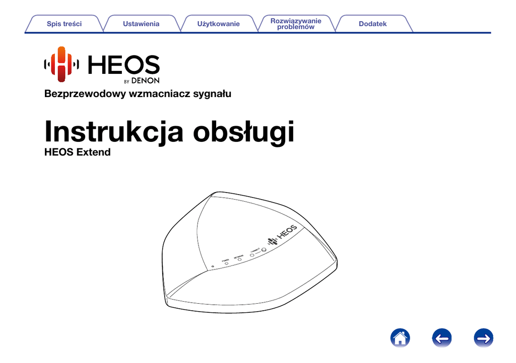 Spis treści Ustawienia Użytkowanie Rozwiązywanie problemów Bezprzewodowy wzmacniacz sygnału Instrukcja obsługi HEOS Extend Dodatek Spis treści Ustawienia Rozwiązywanie problemów Użytkowanie WPROWADZENIE············································································· 3 PRZED ROZPOCZĘCIEM······························································· 4 Konfiguracja zaawansowanych ustawień sieci···································· 17 Status······························································································ 17 2.4 GHz/5 GHz Network·································································· 17 Network··························································································· 20 Management···················································································· 20 Tools································································································ 21 PODSTAWOWE ROZWIĄZYWANIE PROBLEMÓW·············· 22 HEOS Extend nie łączy się z istniejącą siecią bezprzewodową············ 22 Urządzenia HEOS nadal nie mogą się połączyć z siecią, po tym jak z powodzeniem dodano HEOS Extend·········································· 22 Nie mogę się połączyć z HEOS Extend, gdy jest skonfigurowany jako bezprzewodowy punkt dostępowy·············································· 22 Nie ma dostępu do interfejsu WWW··················································· 23 Muzyka czasami się zacina lub jest opóźniona···································· 23 Podłączanie do sieci przy pomocy WPS ············································ 23 Zerowanie ustawień HEOS Extend ····················································· 24 Przywracanie ustawień fabrycznych HEOS Extend····························· 24 INFORMACJE·················································································· 25 Kontakt z firmą Denon········································································ 25 Dane techniczne················································································· 26 Bezprzewodowa sieć LAN······························································· 26 Ogólne····························································································· 26 Znaki towarowe·················································································· 27 Licencja······························································································ 28 Informacja dotycząca licencji na oprogramowanie użyte w urządzeniu······················································································· 28 Wymagania systemowe········································································ 4 Wymagania dotyczące sieci······························································· 4 Wymagania dotyczące sterownika····················································· 5 Zapoznanie się z Extend······································································· 6 Elementy sterujące············································································· 7 Panel tylny·························································································· 8 Zasilanie Extend···················································································· 9 Pobieranie aplikacji HEOS····································································· 9 KONFIGURACJA EXTEND··························································· 10 Tryb Wzmacniacz zasięgu·································································· 10 Tryb Punkt dostępowy····························