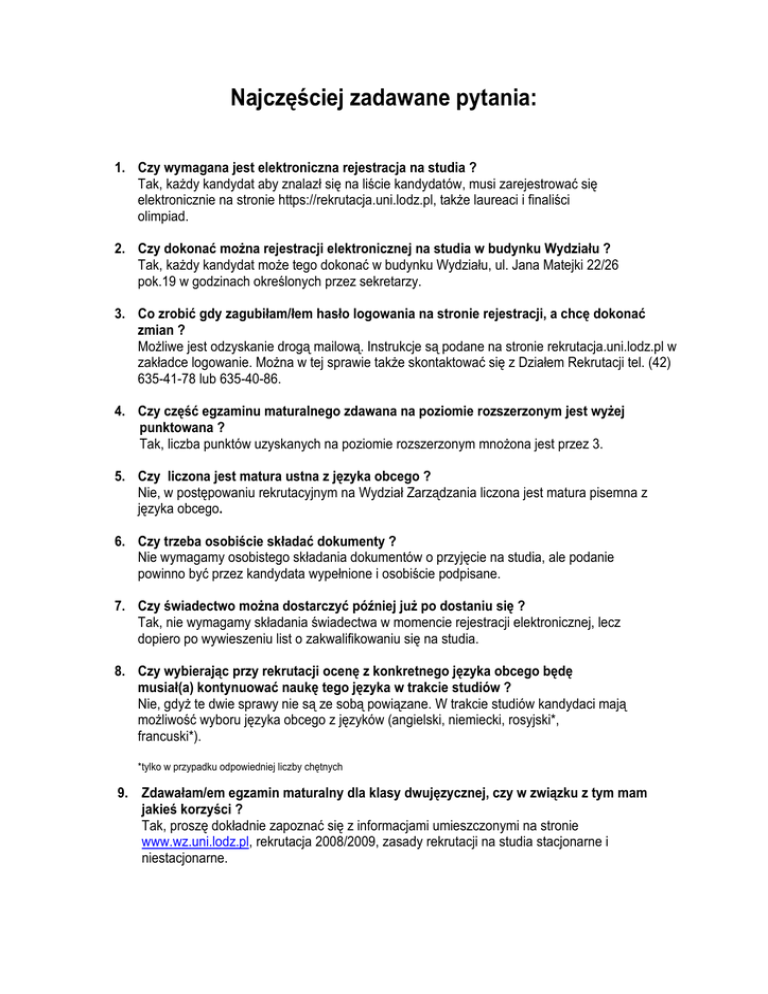 Najczęściej zadawane pytania: 1. Czy wymagana jest elektroniczna rejestracja na studia ? Tak, kaŜdy kandydat aby znalazł się na liście kandydatów, musi zarejestrować się elektronicznie na stronie https://rekrutacja.uni.lodz.pl, takŜe laureaci i finaliści olimpiad. 2. Czy dokonać moŜna rejestracji elektronicznej na studia w budynku Wydziału ? Tak, kaŜdy kandydat moŜe tego dokonać w budynku Wydziału, ul. Jana Matejki 22/26 pok.19 w godzinach określonych przez sekretarzy. 3. Co zrobić gdy zagubiłam/łem hasło logowania na stronie rejestracji, a chcę dokonać zmian ? MoŜliwe jest odzyskanie drogą mailową. Instrukcje są podane na stronie rekrutacja.uni.lodz.pl w zakładce logowanie. MoŜna w tej sprawie takŜe skontaktować się z Działem Rekrutacji tel. (42) 635-41-78 lub 635-40-86. 4. Czy część egzaminu maturalnego zdawana na poziomie rozszerzonym jest wyŜej punktowana ? Tak, liczba punktów uzyskanych na poziomie rozszerzonym mnoŜona jest przez 3. 5. Czy liczona jest matura ustna z języka obcego ? Nie, w postępowaniu rekrutacyjnym na Wydział Zarządzania liczona jest matura pisemna z języka obcego. 6. Czy trzeba osobiście składać dokumenty ? Nie wymagamy osobistego składania dokumentów o przyjęcie na studia, ale podanie powinno być przez kandydata wypełnione i osobiście podpisane. 7. Czy świadectwo moŜna dostarczyć później juŜ po dostaniu się ? Tak, nie wymagamy składania świadectwa w momencie rejestracji elektronicznej, lecz dopiero po wywieszeniu list o zakwalifikowaniu się na studia. 8. Czy wybierając przy rekrutacji ocenę z konkretnego języka obcego będę musiał(a) kontynuować naukę tego języka w trakcie studiów ? Nie, gdyŜ te dwie sprawy nie są ze sobą powiązane. W trakcie studiów kandydaci mają moŜliwość wyboru języka obcego z języków (angielski, niemiecki, rosyjski*, francuski*). *tylko w przypadku odpowiedniej liczby chętnych 9. Zdawałam/em egzamin maturalny dla klasy dwujęzycznej, czy w związku z tym mam jakieś korzyści ? Tak, proszę dokładnie zapoznać się z informacjami umieszczonymi na stronie www.wz.uni.lodz.pl, rekrutacja 2008/2009, zasady rekrutacji na studia stacjonarne i niestacjonarne. 10. Jaką trzeba mieć liczbę punktów aby dostać się na dany kierunek ? Trudno powiedzieć, zaleŜy to od liczby kandydatów i tego na którym miejscu Pan/Pani się uplasuje na liście rankingowej. 11. W jaki sposób dowiem się Ŝe zostałem/łam zakwalifikowana na studia ? Po zakończeniu procesu rekrutacji elektronicznej, zostaną zamieszczone na stronie internetowej rekrutacji, na indywidualnym koncie kandydata oraz wywieszone w budynku Wydziału Zarządzania UŁ, informacje o zakwalifikowaniu do przyjęcia na studia. Proszę pamiętać, Ŝe kandydaci, którzy zostaną zakwalifikowani na studia będą zobowiązani do dostarczenia dokumentów w ustalonym przez komisję terminie. Nie dostarczenie dokumentów równowaŜne jest z rezygnacją ze studiów. 12. W jaki sposób dowiem się Ŝe zostałem/łam przyjęta na studia ? Po zakończeniu procesu rekrutacji wywieszone zostaną przy wejściu do budynku Wydziału listy zakwalifikowanych i wysłane zostaną zawiadomienia do kandydatów. 13. Czym charakteryzują się studia I stopnia a czym II stopnia? W związku wejściem w Ŝycie nowej ustawy o szkolnictwie wyŜszym dotychczasowe studia licencjackie stały się studiami I stopnia, natomiast studia uzupełniające magisterskie przekształcone zostały w studia II stopnia. Studia jednolite magisterskie, pięcioletnie, stacjonarne zostały równieŜ podzielone na studia I stopnia( 3-letnie licencjackie) oraz II stopnia ( 2-letnie uzupełniające magisterskie). 14. Które studia noszą nazwę stacjonarnych, a które niestacjonarnych ? W związku wejściem w Ŝycie nowej ustawy o szkolnictwie wyŜszym dotychczasowe studia dzienne przekształcone zostały w studia stacjonarne, a studia zaoczne i wieczorowe w niestacjonarne. 15. Posiadam dyplom licencjata na jakie studia mogę składać dokumenty ? Osoby posiadające dyplom licencjata mogą ubiegać się o przyjęcie na studia II stopnia (zaoczne lub wieczorowe), po których ukończeniu uzyskują tytuł magistra. 16. Czy mogę kontynuować naukę na studiach niestacjonarnych II stopnia na specjalności innej niŜ ta którą ukończyłam/łem na studiach I stopnia ? Tak, wybrana specjalność na studiach II stopnia nie musi być kontynuacją specjalności ze studiów I stopnia. 17. Czy studia stacjonarne są płatne ? Na studiach stacjonarnych płatne są tylko studia w języku angielskim. Jest to kierunek zarządzanie, specjalność Business Management. Odpłatność wynosi 3.000 zł za rok akademicki. Opłatę moŜna wnosić w ratach. 18. Czy studia niestacjonarne (wieczorowe i zaoczne) są płatne ? Tak, szczegółowy wykaz stawek znajduje się na stronie www.wz.uni.lodz.pl, opłatę moŜna wnosić w ratach. 19. Jeśli podejmę studia stacjonarne na Wydziale Zarządzania w ramach II kierunku to czy będę płacić za studia ? W roku akademickim 2008/2009 osoby podejmujące studia w ramach II kierunku nie wnoszą opłat za studia. 20. Czy jest przewidziany egzamin wstępny dla kandydatów, którzy na maturze nie zdawali Któregoś z przedmiotów uwzględnionych w zasadach rekrutacji ? Nie, w zasadach przyjęć na rok akademicki 2008/2009 nie są przewidziane egzaminy wstępne. 21. Czy absolwenci studiów I stopnia kierunków ekonomicznych innych niŜ zarządzanie lub kierunków nieekonomicznych mogą podjąć studia niestacjonarne II stopnia na Wydziale Zarządzania ? Tak, ale kandydaci na pierwszy rok studiów niestacjonarnych II stopnia na Wydziale Zarządzania, którzy ukończyli studia I stopnia na kierunkach innych niŜ zarządzanie lub na kierunkach nieekonomicznych będą weryfikowani pod względem zrealizowanego na studiach I stopnia programu nauczania. - JeŜeli kandydat zrealizował co najmniej 60% zajęć objętych standardami nauczania, wówczas 
