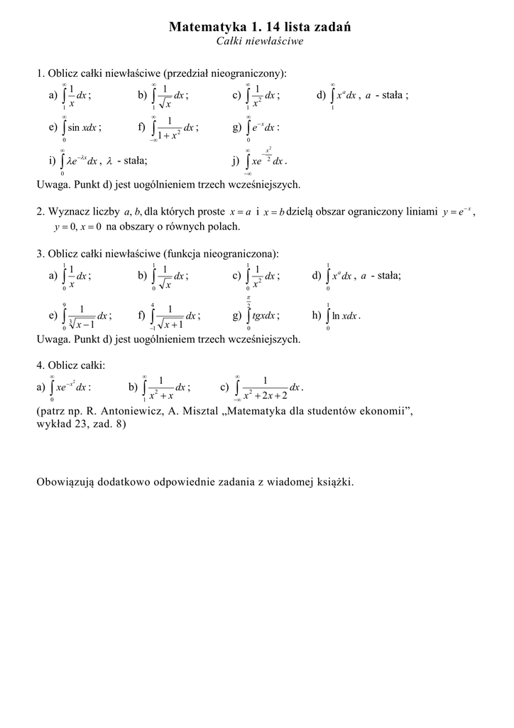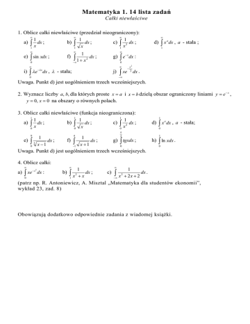 Matematyka 1. 14 lista zadań Całki niewłaściwe 1. Oblicz całki niewłaściwe (przedział nieograniczony): a) 1 1 x dx ; b) 1 e) sin xdx ; f) 1 dx ; x 1 1 x 2 c) 1 a d) x dx , a - stała ; 1 g) e x dx : dx ; 0 1 dx ; x2 0 x i) e dx , - stała; j) 0 xe x2 2 dx . Uwaga. Punkt d) jest uogólnieniem trzech wcześniejszych. 2. Wyznacz liczby a, b, dla których proste x a i x b dzielą obszar ograniczony liniami y e x , y 0, x 0 na obszary o równych polach. 3. Oblicz całki niewłaściwe (funkcja nieograniczona): 1 a) 9 e) 1 1 0 x dx ; 3 0 b) 0 4 1 dx ; x 1 f) 1 1 1 dx ; x c) 0 2 1 dx ; x 1 1 dx ; x2 1 d) a x dx , a - stała; 0 1 g) tgxdx ; 0 h) ln xdx . 0 Uwaga. Punkt d) jest uogólnieniem trzech wcześniejszych. 4. Oblicz całki: a) x2 xe dx : 0 b) 1 1 x 2 x dx ; c) x 2 1 dx . 2x 2 (patrz np. R. Antoniewicz, A. Misztal „Matematyka dla studentów ekonomii”, wykład 23, zad. 8) Obowiązują dodatkowo odpowiednie zadania z wiadomej książki.