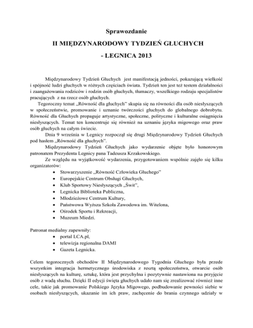 Sprawozdanie II MIĘDZYNARODOWY TYDZIEŃ GŁUCHYCH - LEGNICA 2013 Międzynarodowy Tydzień Głuchych jest manifestacją jedności, pokazującą wielkość i spójność ludzi głuchych w różnych częściach świata. Tydzień ten jest też testem działalności i zaangażowania rodziców i rodzin osób głuchych, tłumaczy, wszelkiego rodzaju specjalistów pracujących z na rzecz osób głuchych. Tegoroczny temat „Równość dla głuchych” skupia się na równości dla osób niesłyszących w społeczeństwie, promowanie i uznanie twórczości głuchych do globalnego dobrobytu. Równość dla Głuchych propaguje artystyczne, społeczne, polityczne i kulturalne osiągnięcia niesłyszących. Temat ten koncentruje się również na uznaniu języka migowego oraz praw osób głuchych na całym świecie. Dnia 9 września w Legnicy rozpoczął się drugi Międzynarodowy Tydzień Głuchych pod hasłem „Równość dla głuchych”. Międzynarodowy Tydzień Głuchych jako wydarzenie objęte było honorowym patronatem Prezydenta Legnicy pana Tadeusza Krzakowskiego. Ze względu na wyjątkowość wydarzenia, przygotowaniem wspólnie zajęło się kilku organizatorów: Stowarzyszenie „Równość Człowieka Głuchego” Europejskie Centrum Obsługi Głuchych, Klub Sportowy Niesłyszących „Świt”, Legnicka Biblioteka Publiczna, Młodzieżowe Centrum Kultury, Państwowa Wyższa Szkoła Zawodowa im. Witelona, Ośrodek Sportu i Rekreacji, Muzeum Miedzi. Patronat medialny zapewniły: portal LCA.pl, telewizja regionalna DAMI Gazeta Legnicka. Celem tegorocznych obchodów II Międzynarodowego Tygodnia Głuchego była przede wszystkim integracja hermetycznego środowiska z resztą społeczeństwa, otwarcie osób niesłyszących na kulturę, sztukę, która jest przychylna i pozytywnie nastawiona na przyjęcie osób z wadą słuchu. Dzięki II edycji święta głuchych udało nam się zrealizować również inne cele, takie jak promowanie Polskiego Języka Migowego, podbudowanie pewności siebie w osobach niesłyszących, ukazanie im ich praw, zachęcenie do brania czynnego udziały w staraniu się o wprowadzenie tych praw w życie codzienne, zmobilizowanie głuchych do większej aktywności w życiu codziennym, zawodowym, sportowym. PONIEDZIAŁEK 9.09.2013 Obchody II MTG rozpoczęły się dnia 9 września 2013r. o godzinie 17 w Legnickiej Bibliotece Publicznej przy ulicy Piastowskiej 22, gdzie pani Dyrektor Anna Gątowska oraz prezes Europejskiego Centrum Obsługi Głuchych – Leonard Narowski powitali przybyłych gości oraz współorganizatorów. Wśród przybyłych gości znalazł się Prezydent miasta Legnicy Pan Tadeusz Krzakowski, osoby niesłyszące, ich rodziny, przyjaciele oraz współorganizatorzy przedsięwzięcia, czyli takie osoby jak: Dyrektor Legnickiej Biblioteki Publicznej –pani Anna Gątowska – gospodyni dnia inaugurującego II MTG; Przedstawiciel Młodzieżowego Centrum Kultury- pani Agnieszka Socha; Prezes Wrocławskiego Klubu Sportowego Niesłyszących „Świt” – pan Jan Kucharski; Przedstawiciele Państwowej Wyższej Szkoły Zawodowej im. Witelona w Legnicy – pani Prorektor ds. Dydaktyki i Studentów pani dr. Helena Babiuch oraz pełnomocnik rektora ds. osób niepełnosprawnych pan Jan Wojtaś. II Międzynarodowy Tydzień Głuchego został oficjalnie otwarty przez Prezydenta miasta. Całość uświetniło wystąpienie pana Franciszka Grzywacza, który pokazał zdjęcia i opowiedział nieco historii miasta w czasie pobytu wojsk radzieckich pt.: „Legnica za radzieckim murem”. Podczas inauguracji otwarcia II Międzynarodowego Tygodnia Głuchego osoby niesłyszące miały okazję spotkać się z panem Prezydentem w węższym gronie, wysłuchać oferty instytucji kulturalnych skierowanej do nich oraz zapoznać się z planem wydarzeń na kolejne dni. Całość spotkania przełożone zostało z języka fonicznego na Polski Język Migowy, tłumaczyła prezes Stowarzyszenia „Równość Człowieka Głuchego – Monika Inglot-Werner. WTOREK 10.09.2013 Drugi dzień obchodów Międzynarodowego Tygodnia Głuchego osoby niesłyszące spędziły w Młodzieżowym Centrum Kultury, gdzie zapoznały się szczegółowo z proponowanymi dla nich działaniami, mogły spróbować swoich sił w pracy z gliną. Każda przybyła osoba mogła zrobić z gliny to co podpowiadała jej wyobraźnia, dzięki temu powstały ciekawe wyroby, które zostaną odpowiednio wykończone i podarowane autorowi pracy. Taka aktywność miała na celu zachęcenie osoby niesłyszące do uczestnictwa w zajęciach ceramicznych, gdzie słuch odgrywa drugorzędną rolę, a gdzie osoby z wadą słuchu mogą się sprawdzić i rozwijać manualnie, co udowodni im, że ich zdolności dorównują, a może nawet przewyższają zdolności osoby pełnosprawnej. Doskonałym przykładem stała się rzeźba niewidomego chłopca, którą to osoby głuche mogły podziwiać. Podczas warsztatów z ceramiki grupie niesłyszących towarzyszył tłumacz Polskiego Języka Migowego – Monika Maj. ŚRODA 11.09.2013 W środę Legniccy niesłyszący mieli okazję skorzystać z oferty Muzeum Miedzi w Legnicy, gdzie przewodnik wraz z tłumaczem języka migowego oprowadzili grupę po wystawie Muzeum. Osoby niesłyszące dowiedziały się, że Muzeum Miedzi jest otwarte dla każdego zwiedzającego, a w przyszłości dzięki współpracy Muzeum z Europejskim Centrum Obsługi Głuchych oraz Stowarzyszeniem Równość Człowieka Głuchego muzeum będzie przyjazne osobą niesłyszącym pod każdym względem. W tym dniu również organizatorzy mieli przyjemność powitać liderów Ruchu Społecznego Głuchych i ich Przyjaciół, którzy przyjechali z Warszawy na czwartkową konferencję naukową oraz na sobotnie zawody sportowe. CZWARTEK 12.09.2013 Czwartek upłyną na konferencji naukowej pt.: „Równość dla głuchych”, która została podzielona na dwie części. Pierwsza część dotyczyła niepełnosprawnych w Europie, rozpoznania i