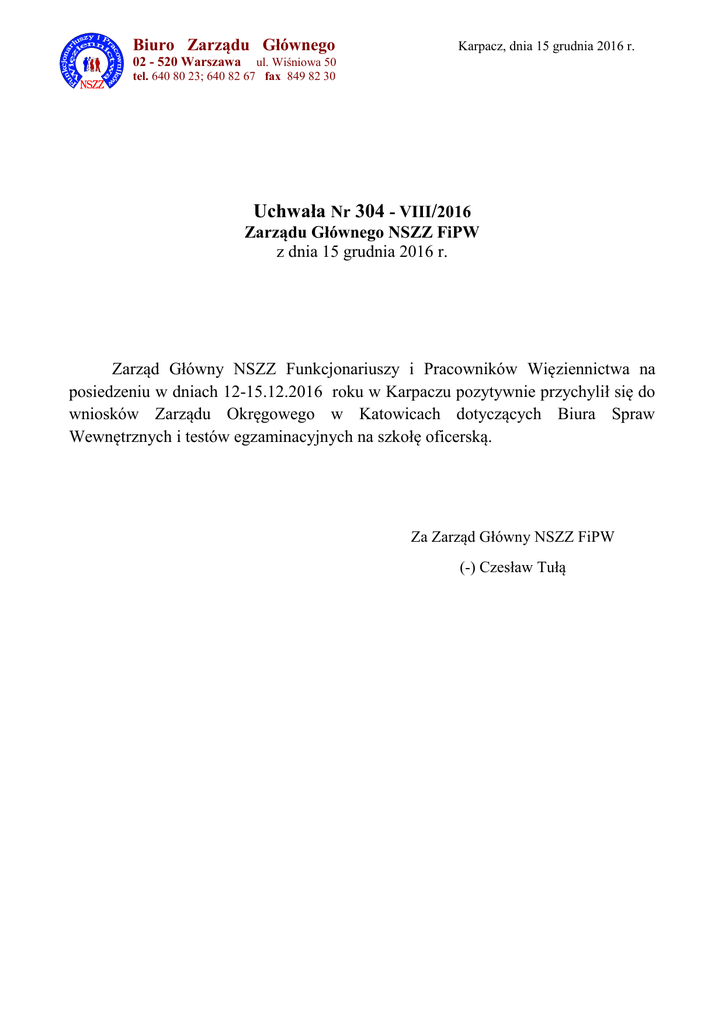 Biuro Zarządu Głównego Karpacz, dnia 15 grudnia 2016 r. ul. Wiśniowa 50 tel. 640 80 23; 640 82 67 fax 849 82 30 02 - 520 Warszawa Uchwała Nr 304 - VIII/2016 Zarządu Głównego NSZZ FiPW z dnia 15 grudnia 2016 r. Zarząd Główny NSZZ Funkcjonariuszy i Pracowników Więziennictwa na posiedzeniu w dniach 12-15.12.2016 roku w Karpaczu pozytywnie przychylił się do wniosków Zarządu Okręgowego w Katowicach dotyczących Biura Spraw Wewnętrznych i testów egzaminacyjnych na szkołę oficerską. Za Zarząd Główny NSZZ FiPW (-) Czesław Tułą