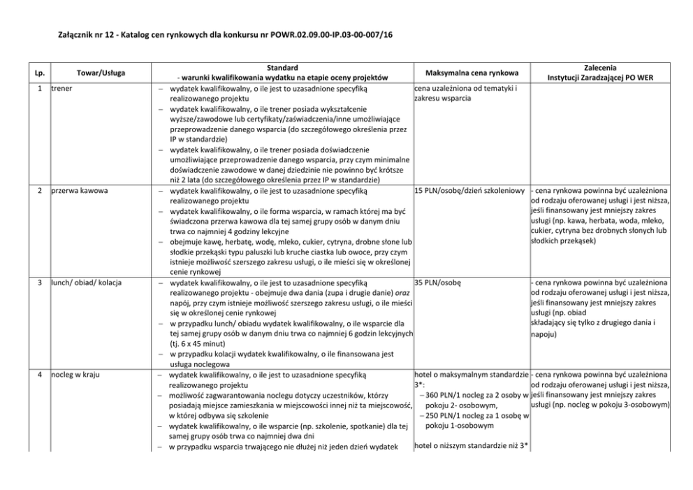 Załącznik nr 12 ‐ Katalog cen rynkowych dla konkursu nr POWR.02.09.00‐IP.03‐00‐007/16 Lp. Towar/Usługa 1 trener