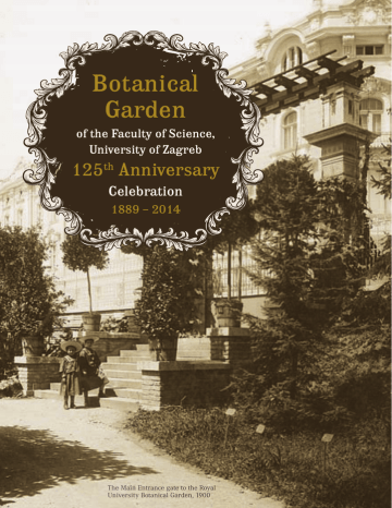 Botanical Garden of the Faculty of Science, University of Zagreb 125th Anniversary Celebration 1889 – 2014 The Main Entrance gate to the Royal University Botanical Garden, 1900 The idea of necessity to establish a botanical garden within the Botany and Physiology Department of the Faculty of Philosophy originated from prof. dr. Bohuslav Jiruš, the first professor of botany at the University of Zagreb. He was fully supported by the then rector of the University, prof. dr. Stjepan Spevec. To the University’s initiative, in 1884 the Royal Land Government decided to constitute the botanical garden for the Royal University. The idea was put into action in 1889 by the university professor of botany dr. Antun Heinz. 120 years ago, the location of the Garden (south side of the Marko Marulić Square) was in the outskirts of the city that numbered only 38000 residents. The plants were firstly arranged according to phylogenetic relationships, at the same time taking into account the aesthetic value of the Garden. The largest part of the Garden was set in the English landscape style with winding paths and freely growing groups of trees and shrubs. Only the flower parterre in the southern side of the greenhouses was constructed in the French style of strict order and symmetry in the layout. The 1889 Botanical Garden Plan Today, the Botanical Garden is an integral part of a sequence of handsome old Zagreb squares and parks known by the name of ‘Lenuci’s’ or the ‘Green Horseshoe’. Because of its great educational, cultural, historical and touristic values and its overall significance for Zagreb and Croatia, since 1971 the Garden has been protected as a park architecture monument. It is also entered in the Register of Cultural Goods of the Ministry of Culture and protected as ‘original architectural achievement and a complete urban, architectonic and park space’. Vítězslav Durchánek, the first Master Gardener Prof. dr. Antun Heinz, the founder of the Botanical Garden The oldest university botanical garden in Croatia, Botanical Garden of the Faculty of Science, University of Zagreb (the Garden), will in 2014, through a variety of events, celebrate the 125th anniversary of its continuous work. Throughout the 125 years of its existence, the Garden operates within the University, at first as part of the Faculty of Philosophy and today belonging to the Faculty of Science. It has always had an important role in the university teaching, scientific research and expert work in the field of botany, as well as in educating the public about the importance of joint actions with aim to protect and preserve the wealth of national flora. Flower parterre with the view of greenhouses, around 1920 Only a decade after its foundation, the Garden already had a diverse plant collection, which today numbers more than 5000 plant taxa. Winter resistant woody plants (shrubs and trees) are grown in the arboretum, while sensitive species from warm climates overwinter in the greenhouses. Decorative perennials are cultivated in the f lower parterre, around the small lakes and in the flowerbeds of the flower rainbow. Particularly valuable parts of the collection are indigenous plants, belonging to the rich and diverse native flora, grown in the phytogeographical groups – rock gardens: Karstic, Sub-Mediterranean and two Mediterranean. Among those, most prominent are the 300 statutorily protected Croatian wild species. Two most recognized Croatian endemics, the Velebit degenia (Degenia velebitica) and Dubrovnik cornflower (Centaurea raguzina), are periodically available for purchase. Tropical and subtropical plants are cultivated in the greenhouses, and are displayed in the open during summer. Marsh plants grow in the small lakes, the ponds and in the little dome-greenhouse on the flower parterre. Important part of the collection is also situated in the systematic field, intended for the university teaching in botany. 125th Anniversary of Botanical Garden Fountain and ponds with water lilies, 1924 “The Velebit degenia exhibition” in the exhibition pavilion, 2008 Recent activities of the Botanical Garden completely fulfil all the conditions from the widely accepted definition of botanical gardens and their difference from other public gardens and parks. Accordingly, a botanical garden is an institution holding documented collections of living plants for the purposes of scientific research, conservation, display and education. Hence, our plant collection is properly documented and for more than a century used in university research and teaching of botany. The Garden is also open to public without an entrance fee, from its beginning. A variety of educational and popularization activities organized by the Garden curators catch attention of many visitors, which is evident from the fact that the Garden is the third most visited tourist site in Zagreb. The Garden is a member of the Botanical Gardens Conservation International (BGCI), an assembly of nearly 1000 botanical gardens in the world. This membership greatly facilitates our efforts to develop different activities, within our financial possibilities, by sharing the experiences with other botanical gardens around the Globe. The activities of botanical gardens in the 21 century are largely devoted to research, conservation of wild plants and public education. Botanical gardens around the world, as well as ours, contribute to achievement of a number of adopted international conventions and agreements, with a common goal to prePupils discover the Garden’s plant diversity in an expert guided tour serve and protect rare and endangered plant species. During the last 20 years, the number of various activities and events in the Garden has continuously been on the rise. One of the oldest educational activities for visitors is a guided garden tour. By restoring the exhibition pavilion in 2007, the Garden attained a representative exhibition and education space intended