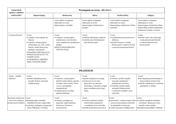 Temat lekcjizgodny z układem podręcznika Czym jest historia? Wymagania na oceny - KLASA I dopuszczającą Uczeń: ● wyjaśnia, czym zajmuje się historia, ● wyjaśnia i stosuje pojęcia: chronologia, era, wiek, cezura, historia, źródło historyczne, pradzieje, starożytność, ● klasyfikuje źródła historyczne. POTRAFI ZAZNACZYĆ NA TAŚMIE CZASU WYDARZENIA, OKREŚLIĆ WIEK I POŁOWĘ WIEKU. dostateczną dobrą bardzo dobrą celującą Uczeń spełnia wymagania edukacyjne na oceny dopuszczającą, dostateczną, dobrą, bardzo dobrą, potrafi samodzielnie formułować wnioski i wyrażać opinie, a ponadto: Uczeń: ● potrafi ocenić rolę archeologii i nauk pomocniczych historii w odtwarzaniu procesów historycznych. Uczeń spełnia wymagania edukacyjne na ocenę dopuszczającą, a ponadto: Uczeń spełnia wymagania edukacyjne na oceny dopuszczającą i dostateczną, a ponadto: Uczeń spełnia wymagania edukacyjne na oceny dopuszczającą, dostateczną i dobrą, a ponadto: Uczeń: ● wyjaśnia i stosuje pojęcia: średniowiecze, nowożytność, czasy współczesne, periodyzacja dziejów. OBLICZA PRAWIDŁOWO UPŁYW CZASU. Uczeń: ● określa chronologię wydarzeń, ● określa ramy chronologiczne epok historycznych. Uczeń: ● wyjaśnia procesy przyczynowoskutkowe, ● potrafi korzystać ze źródeł historycznych i omówić ich rolę w procesie poznawania historii. PRADZIEJE Afryka – kolebka ludzkości Uczeń: ● potrafi scharakteryzować początki dziejów człowieka współczesnego. Rewolucja neolityczna Uczeń: – od łowców-zbieraczy ● dostrzega wpływ warunków do pierwszych rolników naturalnych na życie i zajęcia ludzi, ● wyjaśnia i posługuje się pojęciami: Żyzny Półksiężyc, rewolucja Uczeń: ● wyjaśnia i stosuje pojęcia: paleolit, neolit, kultura, gatunek, ewolucja, Homo habilis, Homo erectus, australopitek, neandertalczyk, ● wyjaśnia proces ewolucji gatunku ludzkiego. Uczeń: ● potrafi posługiwać się mapą, ● umieszcza na osi czasu pojawienie się człowieka rozumnego i wskazuje na mapie etapy zasiedlenia przez niego Ziemi. Uczeń: ● rozumie i posługuje się pojęciami: epoka kamienna, zbieractwo, łowiectwo, koczownictwo, Uczeń: ● rozumie zależności między środowiskiem naturalnym a warunkami życia człowieka, ● potrafi porównać koczowniczy Uczeń: ● rozumie i potrafi wyjaśnić znaczenie umiejętności posługiwania się mową, ● wskazuje związki między zmianami klimatycznymi a zmianami warunków życia człowieka. Uczeń: ● zna argumenty przemawiające za teorią ewolucji i przeciw niej, ● potrafi zinterpretować wyrażenie „pożegnanie z Afryką”. Uczeń: Uczeń: ● prezentuje i wyjaśnia zmiany, które ● wyjaśnia zasadność określenia towarzyszyły przejściu człowieka „rewolucja” dla procesu, który do gospodarki wytwórczej, zaszedł w epoce neolitu, ● ocenia znaczenie osiadłego trybu ● przedstawia przykłady świadomej Temat lekcjizgodny z układem podręcznika Wymagania na oceny - KLASA I dopuszczającą neolityczna, brąz, ● potrafi wskazać korzyści, które przyniosło człowiekowi udomowienie dzikich zwierząt. dostateczną dobrą ● wyjaśnia i posługuje się pojęciem: megality. tryb życia z osiadłym, ● potrafi scharakteryzować rozwój rolnictwa na terenie Europy. bardzo dobrą celującą życia dla dalszych dziejów ludzkości. ingerencji człowieka w środowisko, w którym żył. Uczeń: ● potrafi umiejscowić w czasie i przestrzeni historycznej starożytne cywilizacje i imperia Bliskiego Wschodu, ● potrafi przedstawić główne zadania władzy w starożytnym państwie, ● potrafi opisać rolę Sumerów w rozwoju pierwszych miast-państw. Uczeń: ● wyjaśnia znaczenie osiągnięć cywilizacyjnych Mezopotamii dla ludzkości. Uczeń: ● wyjaśnia znaczenie położenia geograficznego dla pierwszych państw, ● wyjaśnia znaczenie warunków naturalnych dla pierwszych państw. STAROŻYTNOŚĆ Cywilizacja mezopotamska Uczeń: Uczeń: ● potrafi wskazać położenie ● wyjaśnia okoliczności powstania geograficzne Mezopotamii, pierwszych miast jako centrów życia ● wyjaśnia i posługuje się pojęciami: społecznego i kulturowego, rolnictwo irygacyjne, monarchia, ● wyjaśnia i posługuje się pojęciami: państwo. ziggurat, rewolucja urbanistyczna, cywilizacja, imperium, ludy semickie. W państwie faraona Uczeń: ● potrafi wskazać na mapie terytorium starożytnego Egiptu, ● potrafi opisać znaczenie i rolę faraonów w Egipcie, ● wyjaśnia pojęcia: faraon, hieroglify, wezyr, kapłani, sarkofag, mumia, politeizm. Uczeń: ● potrafi scharakteryzować powstanie cywilizacji egipskiej, ● wyjaśnia sposób budowania monumentalnych grobowców – piramid. Uczeń: ● potrafi scharakteryzować system wierzeń w Egipcie, ● potrafi scharakteryzować strukturę społeczeństwa w Egipcie (faraon, urzędnicy, kapłani, chłopi). Uczeń: ● wyjaśnia, dlaczego w Egipcie balsamowano ciała zmarłych, ● wyjaśnia rolę poszczególnych warstw społecznych w starożytnym Egipcie. Uczeń: ● wskazuje przyczyny potęgi Egiptu, ● wskazuje przykłady udziału mieszkańców Egiptu w rozwoju cywilizacji. Starożytny Izrael i religia monoteistyczna Uczeń: ● dzieli Biblię na Nowy i Stary Testament, ● wyjaśnia pojęcia i terminy: niewola babilońska, prorocy, synagoga, ● wskazuje na mapie Palestynę, omawia jej położenie geograficzne i warunki naturalne. Uczeń: ● wymienia główne zasady judaizmu, ● potrafi wskazać i opisać podstawowe symbole judaizmu, ● wyjaśnia pojęcie: szabas. Uczeń: ● potrafi wyjaśnić różnice między politeizmem a monoteizmem, ● omawia historię Królestw Dawida i Salomona, ● omawia dzieje Abrahama. Uczeń: ● potrafi analizować fragmenty Biblii, ● rozumie narodowy charakter judaizmu. Uczeń: ● potrafi określić znaczenie Biblii jako źródła historycznego, ● ocenia rolę Abrahama i Mojżesza w 