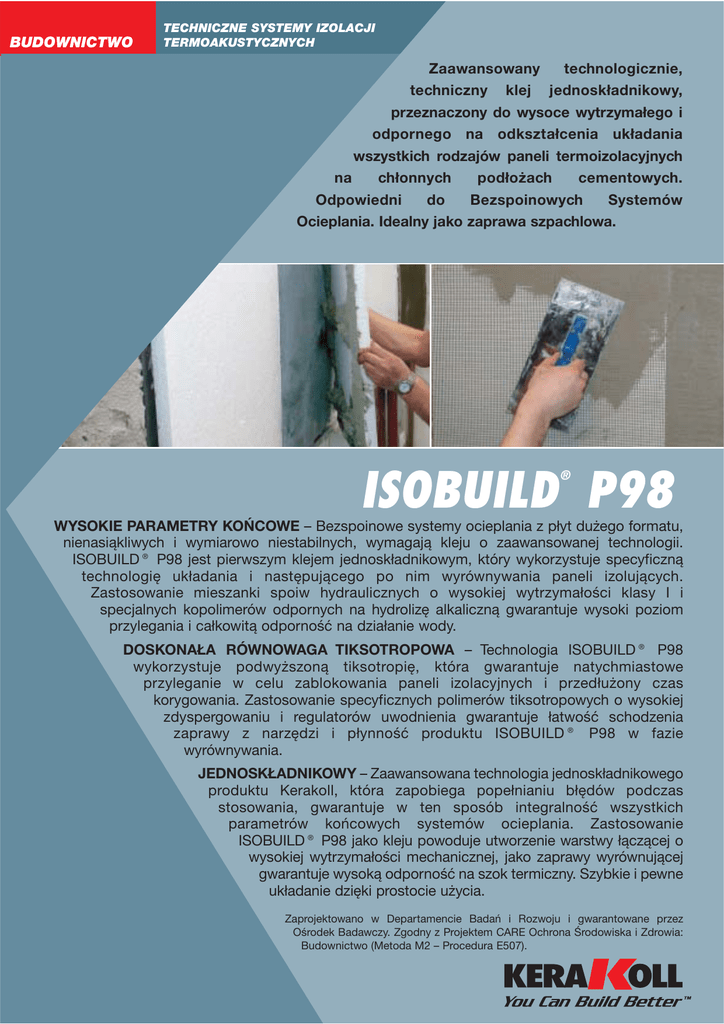 BUDOWNICTWO TECHNICZNE SYSTEMY IZOLACJI TERMOAKUSTYCZNYCH Zaawansowany technologicznie, techniczny klej jednoskładnikowy, przeznaczony do wysoce wytrzymałego i odpornego na odkształcenia układania wszystkich rodzajów paneli termoizolacyjnych na chłonnych podłożach cementowych. Odpowiedni do Bezspoinowych Systemów Ocieplania. Idealny jako zaprawa szpachlowa. ISOBUILD P98 ® WYSOKIE PARAMETRY KOŃCOWE – Bezspoinowe systemy ocieplania z płyt dużego formatu, nienasiąkliwych i wymiarowo niestabilnych, wymagają kleju o zaawansowanej technologii. ISOBUILD® P98 jest pierwszym klejem jednoskładnikowym, który wykorzystuje specyficzną technologię układania i następującego po nim wyrównywania paneli izolujących. Zastosowanie mieszanki spoiw hydraulicznych o wysokiej wytrzymałości klasy I i specjalnych kopolimerów odpornych na hydrolizę alkaliczną gwarantuje wysoki poziom przylegania i całkowitą odporność na działanie wody. DOSKONAŁA RÓWNOWAGA TIKSOTROPOWA – Technologia ISOBUILD® P98 wykorzystuje podwyższoną tiksotropię, która gwarantuje natychmiastowe przyleganie w celu zablokowania paneli izolacyjnych i przedłużony czas korygowania. Zastosowanie specyficznych polimerów tiksotropowych o wysokiej zdyspergowaniu i regulatorów uwodnienia gwarantuje łatwość schodzenia zaprawy z narzędzi i płynność produktu ISOBUILD® P98 w fazie wyrównywania. JEDNOSKŁADNIKOWY – Zaawansowana technologia jednoskładnikowego produktu Kerakoll, która zapobiega popełnianiu błędów podczas stosowania, gwarantuje w ten sposób integralność wszystkich parametrów końcowych systemów ocieplania. Zastosowanie ISOBUILD® P98 jako kleju powoduje utworzenie warstwy łączącej o wysokiej wytrzymałości mechanicznej, jako zaprawy wyrównującej gwarantuje wysoką odporność na szok termiczny. Szybkie i pewne układanie dzięki prostocie użycia. Zaprojektowano w Departamencie Badań i Rozwoju i gwarantowane przez Ośrodek Badawczy. Zgodny z Projektem CARE Ochrona Środowiska i Zdrowia: Budownictwo (Metoda M2 – Procedura E507). ISOBUILD P98 ® ZASTOSOWANIE Izolacja bezspoinowa i wyrównywanie: - fasad budynków mieszkalnych - pod dachówkami - izolacji wewnętrznych mansard i poddaszy - komór chłodniczych Przeznaczenie użytkowe: Wewnątrz i na zewnątrz, do paneli termoizolacyjnych z polistyrenu, poliuretanu tłoczonego, styropianu, korka, szkła piankowego, wełny mineralnej i szklanej; na podłoża z tynków cementowych, betonu, cementowych zapraw wyrównujących, również w rejonach narażonych na wpływ mrozu. Nie używać: Na ścianach gipsowych lub na gotowych tynkach na bazie gipsu; do przyklejania płytek ceramicznych lub kamieni naturalnych; na podłożach drewnianych i metalowych. PRZYGOTOWANIE PODŁOŻA Podłoże musi być idealnie równe i spójne, pozbawione części kruchych i łatwo usuwalnych, o stabilnych rozmiarach, czyste i suche. Sprawdzić, czy nie ma pozostałości z szalunków. Ewentualne różnice poziomów muszą być wcześniej wyrównane przy pomocy zaprawy technicznej KERABUILD® FINITURA o normalnym wiązaniu lub przy pomocy profesjonalnej zaprawy wyrównawczej KERALEVEL® LR, która bardzo szybko twardnieje i wysycha. SPOSÓB UŻYCIA Przygotowanie ISOBUILD® P98 przygotowuje się poprzez wymieszanie 25 kg proszku z około 7 litrami czystej wody. Mieszankę uzyskujemy, wlewając wodę do czystego pojemnika, a następnie stopniowo wsypując proszek. Mieszać w mieszalniku poziomym lub w naczyniu zarobowym (mieszania dokonywać ręcznie lub za pomocą wolnoobrotowego mieszadła mechanicznego) aż do uzyskania jednolitej i pozbawionej grudek mieszanki. Nakładanie Jako klej: ISOBUILD® P98 nakładamy punktowo (wewnątrz i w przypadku paneli o małych rozmiarach) lub przy użyciu pacy zębatej bezpośrednio na podłoże pełnowarstwowe. Płyty muszą być dobrze dociśnięte do podłoża w taki sposób, aby klej rozłożył się jak najbardziej równomiernie i aby płyta jak najlepiej przylegała. Układanie i ewentualne wyrównywanie paneli musi być wykonywane bezpośrednio po nałożeniu świeżego kleju. Ewentualne przesunięcia i regulacje paneli w początkowym momencie wiązania kleju mogą spowodować niedokładne przyklejenie, a w konsekwencji odspojenie paneli. Jako zaprawa wyrównująca: ISOBUILD® P98, stosowany do wyrównywania powierzchni na panelach termoizolacyjnych należy rozprowadzać równomierną warstwą przy pomocy pacy gładkiej, wtopić siatkę z włókna antyalkalicznego w świeżą warstwę za pomocą pacy. Następnie całkowicie pokryć siatkę i stworzyć powierzchnię gotową po wyschnięciu do pomalowania lub do pokrycia tynkiem ozdobnym, dostosowanym do planowanego użycia. Po ułożeniu panele muszą być chronione przed deszczem, przez co najmniej 48 godzin. Czyszczenie ISOBUILD® P98 usuwa się z narzędzi i innych powierzchni wodą przed całkowitym stężeniem. INNE WSKAZÓWKI Przy układaniu paneli termoizolacyjnych należy szczegółowo stosować się do zaleceń podanych przez ich producenta. Układanie na gipsie: na ścianach z gipsu, z gipsu sztukatorskiego lub na gotowych tynkach na bazie gipsu, przed nałożeniem ISOBUILD® P98 konieczne jest zastosowanie na podłoże profesjonalnego gruntu PRIMER A. WZÓR INFORMACJI TECHNICZNEJ DLA PROJEKTANTÓW Podłoże przeznaczone pod przyklejenie paneli termoizolacyjnych a następnie wykonanie na nich warstwy zbrojonej siatką winno być równe, mocne, czyste i suche. Panele przyklejać, a następnie wyrównywać powierzchniowo technicznym klejem jednoskładnikowym na przykład ISOBUILD® P98 produkcji Kerakoll, specjalnie przystosowanym do realizacji ociepleń w systemie bezspoinowym. Wydajność przewidziana na przyklejanie wynosi ≈ 2,5 – 4 kg/m2, a na wyrównywanie powierzchni ≈ 1,5 kg/m2 na 1 mm grubości. DANE CHARAKTERYSTYCZNE Wygląd Przybliżona gęstość nasypowa Skład mineralogiczny kruszywa Frakcja uziarnienia CARE Przechowywanie Opakowa