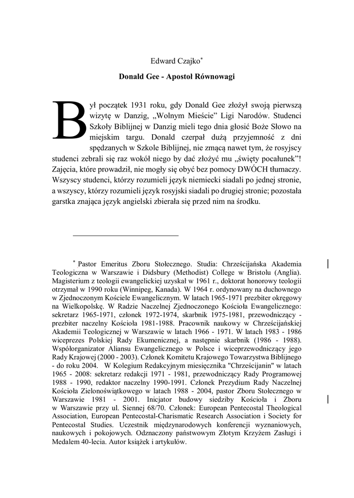 Edward Czajko* Donald Gee - Apostoł Równowagi B ył początek 1931 roku, gdy Donald Gee złożył swoją pierwszą wizytę w Danzig, „Wolnym Mieście” Ligi Narodów. Studenci Szkoły Biblijnej w Danzig mieli tego dnia głosić Boże Słowo na miejskim targu. Donald czerpał dużą przyjemność z dni spędzanych w Szkole Biblijnej, nie zmącą nawet tym, że rosyjscy studenci zebrali się raz wokół niego by dać złożyć mu „święty pocałunek”! Zajęcia, które prowadził, nie mogły się obyć bez pomocy DWÓCH tłumaczy. Wszyscy studenci, którzy rozumieli język niemiecki siadali po jednej stronie, a wszyscy, którzy rozumieli język rosyjski siadali po drugiej stronie; pozostała garstka znająca język angielski zbierała się przed nim na środku. Pastor Emeritus Zboru Stołecznego. Studia: Chrześcijańska Akademia Teologiczna w Warszawie i Didsbury (Methodist) College w Bristolu (Anglia). Magisterium z teologii ewangelickiej uzyskał w 1961 r., doktorat honorowy teologii otrzymał w 1990 roku (Winnipeg, Kanada). W 1964 r. ordynowany na duchownego w Zjednoczonym Kościele Ewangelicznym. W latach 1965-1971 prezbiter okręgowy na Wielkopolskę. W Radzie Naczelnej Zjednoczonego Kościoła Ewangelicznego: sekretarz 1965-1971, członek 1972-1974, skarbnik 1975-1981, przewodniczący prezbiter naczelny Kościoła 1981-1988. Pracownik naukowy w Chrześcijańskiej Akademii Teologicznej w Warszawie w latach 1966 - 1971. W latach 1983 - 1986 wiceprezes Polskiej Rady Ekumenicznej, a następnie skarbnik (1986 - 1988). Współorganizator Aliansu Ewangelicznego w Polsce i wiceprzewodniczący jego Rady Krajowej (2000 - 2003). Członek Komitetu Krajowego Towarzystwa Biblijnego - do roku 2004. W Kolegium Redakcyjnym miesięcznika "Chrześcijanin" w latach 1965 - 2008: sekretarz redakcji 1971 - 1981, przewodniczący Rady Programowej 1988 - 1990, redaktor naczelny 1990-1991. Członek Prezydium Rady Naczelnej Kościoła Zielonoświątkowego w latach 1988 - 2004, pastor Zboru Stołecznego w Warszawie 1981 - 2001. Inicjator budowy siedziby Kościoła i Zboru w Warszawie przy ul. Siennej 68/70. Członek: European Pentecostal Theological Association, European Pentecostal-Charismatic Research Association i Society for Pentecostal Studies. Uczestnik międzynarodowych konferencji wyznaniowych, naukowych i pokojowych. Odznaczony państwowym Złotym Krzyżem Zasługi i Medalem 40-lecia. Autor książek i artykułów. * Donald Gee - Apostoł Równowagi Po czasie spędzonym w Szkole Biblijnej w Kwaterze Głównej Rosyjskiej i Wschodnioeuropejskiej Misji w Danzig, Donald towarzyszył Arturowi Bergholcowi w podróży do Białej Rosji. Na stacji, z której wyruszali, zobaczył „karetę” i konie. Pojazd był całkowicie bezsprężynowym wozem rolniczym, ze słomą rzuconą na podłogę by łagodzić wstrząsy. Jadąc starał się złapać czegokolwiek by utrzymać równowagę. To, po czym jechali trudno było nazwać drogą. Po dwóch godzinach dojechali pod drewnianą szopę, która była domem pewnego rosyjskiego Zielonoświątkowca. Prawdziwy Anglik był czymś niesamowicie rzadkim i jego obecność powodowała spore zamieszanie. Gdziekolwiek nie poszedł, padał ofiarą zawstydzającego zerkania. Kolejna długa podróż, tym samym wozem, z tym samym starym koniem, skończyła się w kolejnym punkcie podróży. Ponad 200 ludzi upchnęło się do małej, drewnianej sali, która zaplanowana była tak, by pomieścić jedynie połowę tej liczby. Pan Gee głosił przez trzy kwadranse, ale słuchacze nie pozwolili mu tak szybko skończyć. Opowiedział więc następnie swoje świadectwo, a potem zwiastował tłumacz i jeszcze pewien rosyjski brat. Spotkanie trwało niemal trzy godziny. Duch Boży niesamowicie poruszał się we Wschodniej Europie w okresie międzywojennym Donald Gee był bardzo nieśmiałym czternastolatkiem, gdy zbór do którego uczęszczał zaprosił lidera Przebudzenia Walijskiego, by przewodził ewangelizacji w październiku 1905 roku. Seth Joshua był bardzo zaangażowany w te wielkie wydarzenia w Walii począwszy od ich początku w 1904 roku i później, gdy były kontynuowane w 1905 roku. Na chwilę przed prowadzaniem spotkań w zborze Finsbury Park Congregational Church, w północnym Londynie, Joshua przewodził kilku niezwykłym spotkaniom w południowozachodniej Walii, gdzie tysiąc dwieście ludzi jednocześnie modliło się na kolanach. Był on ewangelistą z wieloletnim doświadczeniem, poza byciem walijskim, prezbiteriańskim komisarzem do spraw ewangelizacji. Jego metody, jednakże, były często obraźliwe dla szacownej kongregacji Londynu. Było tylko trzech nawróconych, wśród nich był Donald Gee. W niedzielny wieczór, gdy ognisty Walijczyk poprosił wszystkich, którzy byli Chrześcijanami, by wstali z miejsc, większość zgromadzenia wstała, ale młody Donald był bardzo zakłopotany. Wiedział, że nie może Edward Czajko szczerze wstać. Z drugiej strony, czuł się zażenowany i nie chcąc rzucać się w oczy siedząc na ławce, starał się uzyskać, niemożliwą skądinąd, pozycję siedzenia i stania jednocześnie. Na szczęście, żona diakona, siedząca na tej samej ławce, dostrzegła jego zakłopotanie i kierując się instynktem zaproponowała wspólne pójście do pokoju modlitwy. Ona także była bojaźliwą osobą, więc jej wrażliwa dusza była tym, czego w tym momencie najbardziej potrzebował. Razem poszli do pokoju modlitwy, w którym kościelna diakonisa wskazała mu ustępy Pisma mówiące o zbawieniu z wiary w Chrystusa. Jeden z wersów, który mu przeczytała, został z nim już na zawsze. Jana 5,24 – „Kto słucha słowa mego i wierzy temu, który mnie posłał, ma żywot wieczny i nie stanie przed sądem, lecz przeszedł ze śmierci do żywota.” Donald uczęszczał na szkołę niedzielną przez wiele lat i znał drogę zbawienia; wszystko, czego było trzeba, to osobista decyzja otrzymania Chrystusa jako Zbawiciela. Powrócił