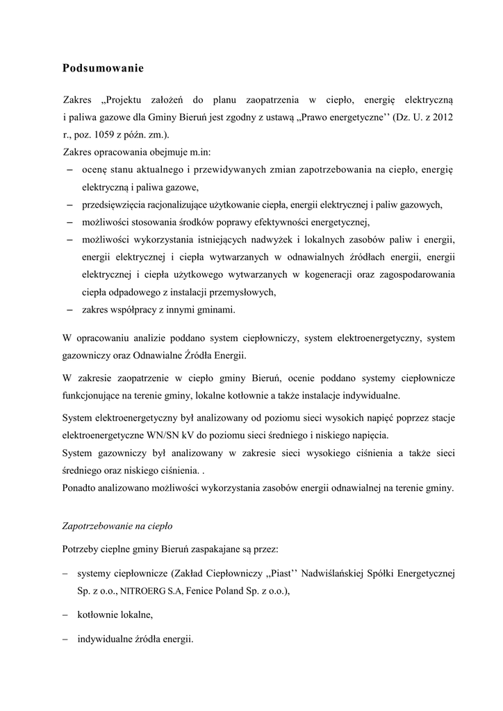 Podsumowanie Zakres „Projektu założeń do planu zaopatrzenia w ciepło, energię elektryczną i paliwa gazowe dla Gminy Bieruń jest zgodny z ustawą „Prawo energetyczne’’ (Dz. U. z 2012 r., poz. 1059 z późn. zm.). Zakres opracowania obejmuje m.in: – ocenę stanu aktualnego i przewidywanych zmian zapotrzebowania na ciepło, energię elektryczną i paliwa gazowe, – przedsięwzięcia racjonalizujące użytkowanie ciepła, energii elektrycznej i paliw gazowych, – możliwości stosowania środków poprawy efektywności energetycznej, – możliwości wykorzystania istniejących nadwyżek i lokalnych zasobów paliw i energii, energii elektrycznej i ciepła wytwarzanych w odnawialnych źródłach energii, energii elektrycznej i ciepła użytkowego wytwarzanych w kogeneracji oraz zagospodarowania ciepła odpadowego z instalacji przemysłowych, – zakres współpracy z innymi gminami. W opracowaniu analizie poddano system ciepłowniczy, system elektroenergetyczny, system gazowniczy oraz Odnawialne Źródła Energii. W zakresie zaopatrzenie w ciepło gminy Bieruń, ocenie poddano systemy ciepłownicze funkcjonujące na terenie gminy, lokalne kotłownie a także instalacje indywidualne. System elektroenergetyczny był analizowany od poziomu sieci wysokich napięć poprzez stacje elektroenergetyczne WN/SN kV do poziomu sieci średniego i niskiego napięcia. System gazowniczy był analizowany w zakresie sieci wysokiego ciśnienia a także sieci średniego oraz niskiego ciśnienia. . Ponadto analizowano możliwości wykorzystania zasobów energii odnawialnej na terenie gminy. Zapotrzebowanie na ciepło Potrzeby cieplne gminy Bieruń zaspakajane są przez: − systemy ciepłownicze (Zakład Ciepłowniczy ,,Piast’’ Nadwiślańskiej Spółki Energetycznej Sp. z o.o., NITROERG S.A, Fenice Poland Sp. z o.o.), − kotłownie lokalne, − indywidualne źródła energii. PROJEKT ZAŁOŻEŃ DO PLANU ZAOPATRZENIA W CIEPŁO, ENERGIĘ ELEKTRYCZNĄ I PALIWA GAZOWE DLA GMINY BIERUŃ Systemy ciepłownicze pokrywają ok. 48 % potrzeb grzewczych budownictwa gminy Bieruń. Potrzeby cieplne gminy pokrywane są głównie ze źródeł pracujących na paliwie węglowym. Źródła ciepła systemów ciepłowniczych również pracują w oparciu o paliwo węglowe. Produkcja ciepła w oparciu o węgiel kamienny pokrywa ok. 84,0 % potrzeb gminy a udział paliwa gazowego w produkcji ciepła wynosi ok. 9,0% Na obszarze gminy Bieruń obszarami budownictwa o największej gęstości zabudowy są tereny budownictwa wielorodzinnego. Należą do nich osiedla mieszkaniowe w rejonie ul. Granitowej; ul. Warszawskiej i Węglowej; Osiedle Homera oraz Osiedle Chemików. Gęstość cieplną wymienionych powyżej terenów określa się na poziomie ok. 30 – 45 MWt /km2. Pozostałe tereny w gminie to tereny z przewagą budownictwa jednorodzinnego dla których gęstość cieplną określa się na poziomie ok. 6 – 12 MWt /km2. Obszarami uprzywilejowanymi dla dostaw ciepłą z systemów ciepłowniczych są tereny o gęstości cieplnej powyżej 30 – 45 MWt /km2.Wszystkie systemy ciepłownicze posiadają duże rezerwy mocy źródeł przez co korzystnie wpływają na pewność zasilania istniejących odbiorców. Zakład Ciepłowniczy ,,Piast’’ Nadwiślańskiej Spółki Energetycznej Sp. z o.o. posiada rezerwę mocy rzędu ok. 20,1 MW. System ciepłowniczy firmy NITROERG S.A. posiada rezerwę mocy rzędu ok. 10,4 MW do 2015 r. (po likwidacji kotłów parowych od roku 2016 – 2,4 MW), Fenice Poland Sp. z o.o. posiada rezerwę mocy rzędu ok. 2,0 MW, która mogłaby być wykorzystana do ogrzewania obiektów położonych w niedalekim sąsiedztwie Osiedla Homera. Istniejące rezerwy przesyłowe mogą zostać wykorzystane do podłączenia nowych potencjalnych odbiorców ciepła. Ze względu na dotychczas przeprowadzone prace remontowe i modernizacyjne urządzeń ( kotłów) systemów ciepłowniczych na chwilę obecną ich stan techniczny jest dobry. Ogólnie stan techniczny sieci uznać można za zadawalający, który spełnia swoje zadania w zakresie przesyłu ciepła. Jednakże sieci te wymagają sukcesywnych prac remontowych związanych z ich doszczelnianiem, uzupełnianiem izolacji termicznej, regeneracją urządzeń oraz wymianą wydzielonych odcinków sieci na nowe. Na terenie gminy Bieruń występuje ogółem zapotrzebowanie na moc cieplną na poziomie około 100,875 MW oraz zapotrzebowanie na energię cieplną na poziomie około 759,106 TJ. Zapotrzebowanie związane z mieszkalnictwem na moc cieplną szacuje się na poziomie około 49,226 MW oraz zapotrzebowanie na energię cieplną na poziomie około 354,426 TJ. 2 PROJEKT ZAŁOŻEŃ DO PLANU ZAOPATRZENIA W CIEPŁO, ENERGIĘ ELEKTRYCZNĄ I PALIWA GAZOWE DLA GMINY BIERUŃ Zapotrzebowanie na moc cieplną instytucji (obiektów użyteczności publicznej), wynosi ok. 4,989 MW, a zapotrzebowanie na energię cieplną wynosi około 35,924 TJ. Zapotrzebowanie na moc cieplną przemysłu i usług (obiekty przemysłowe i usługowe), wynosi ok. 46,66 MW, a zapotrzebowanie na energię cieplną wynosi około 368,756 TJ. Prognozowane zapotrzebowanie na energię i moc cieplną gminy Bieruń w horyzoncie czasowym do 2029 r. uwzględniające zagospodarowanie potencjalnych terenów rozwojowych oraz wskaźniki zmniejszające zapotrzebowanie na ciepło w wyniku podjętych działań termo modernizacyjnych (spadek energochłonności istniejących budynków), będzie ulegnie zmniejszenie w stosunku do roku bazowego 2013 r. Zapotrzebowanie na moc cieplną w 2029 r. w najbardziej realnym wariancie oszacowanym przez autorów niniejszego opracowania, może wynieść 87,289 MW, co w stosunku do roku bazowego (100,875 MW) powoduje spadek mocy o 13,5 MW. Zapotrzebowanie na energię cieplną w 2029 r. w najbardziej realnym wariancie oszacowanym przez autorów niniejszego opracowania, może wynieść 656,867 TJ, co w stosunku do roku bazowego (759,106 TJ) powoduje spadek energii cieplnej o 102,2 TJ. 